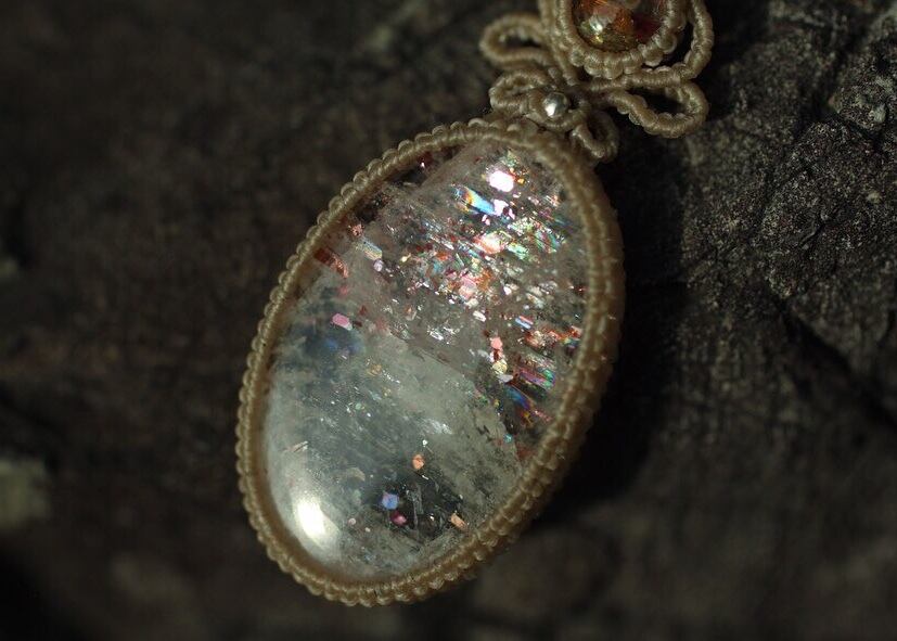 アイオライトサンストーンに施した編み模様は