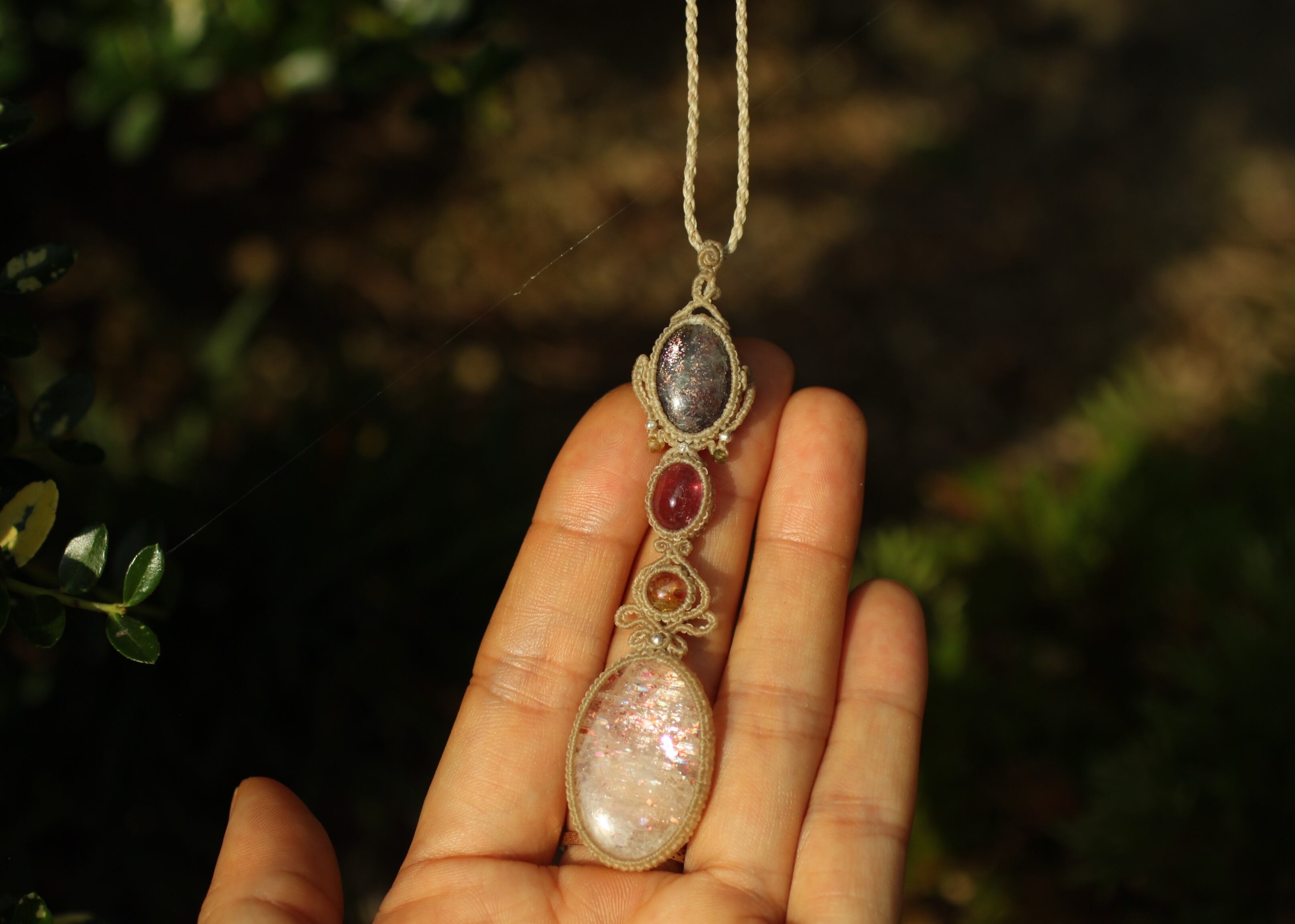 手縫い糸ほどの細いコードを使い出来る限り天然石の表情と繊細な仕上がりを重視し時間をかけ丁寧に編みました。