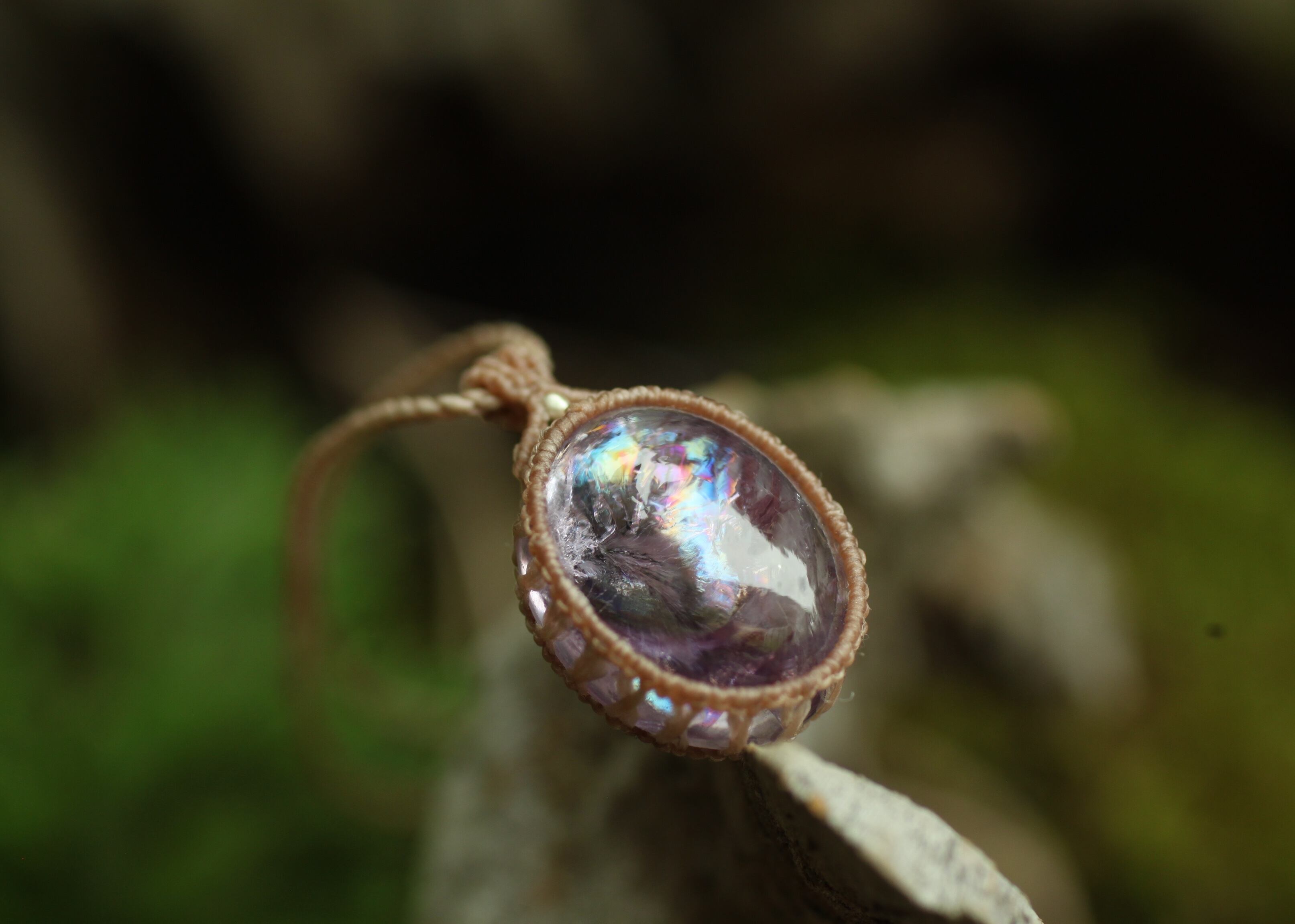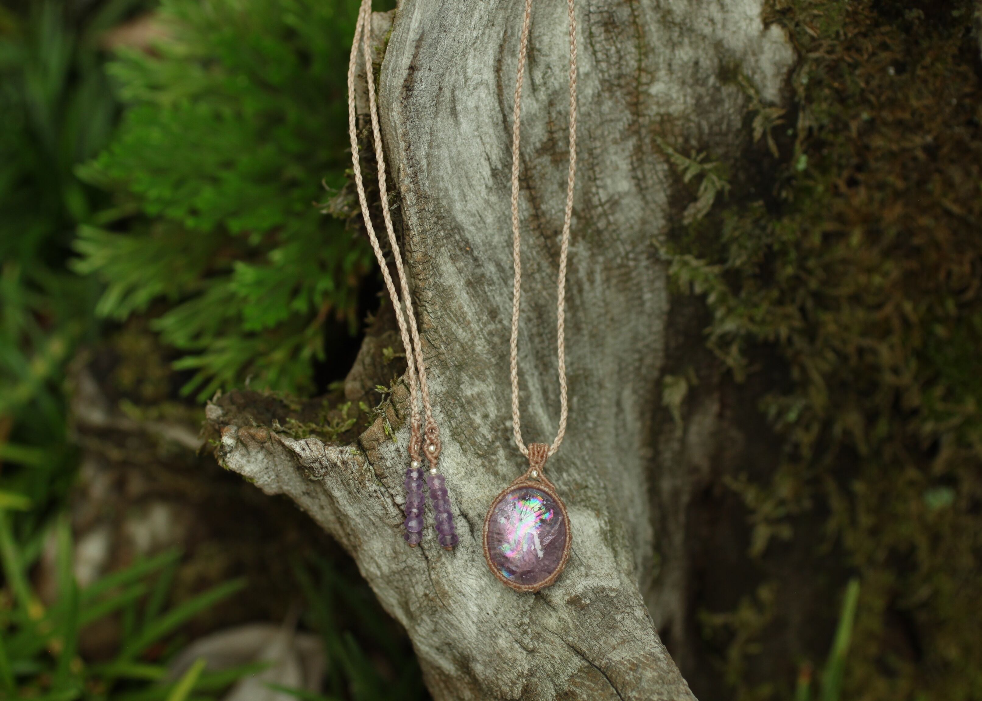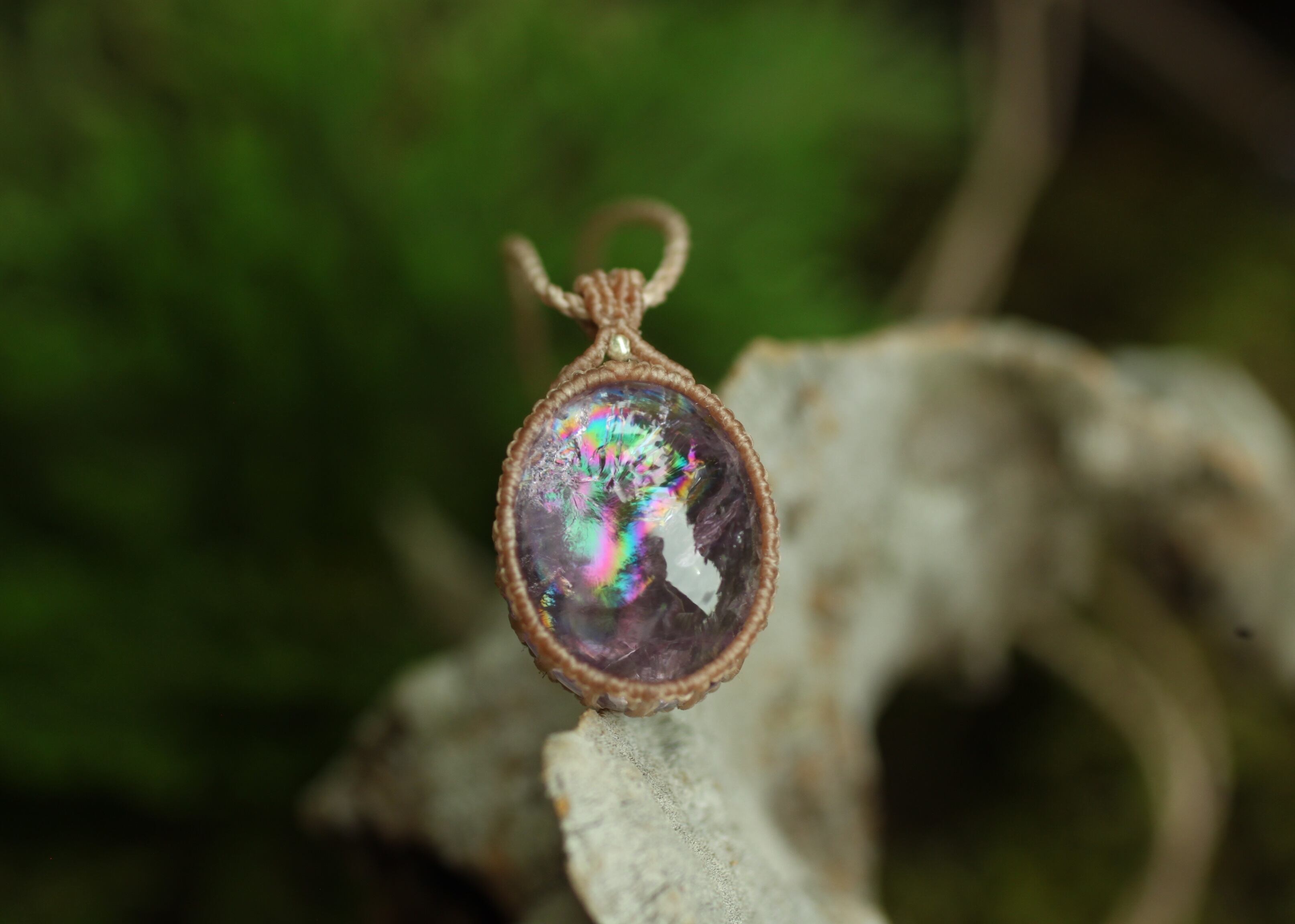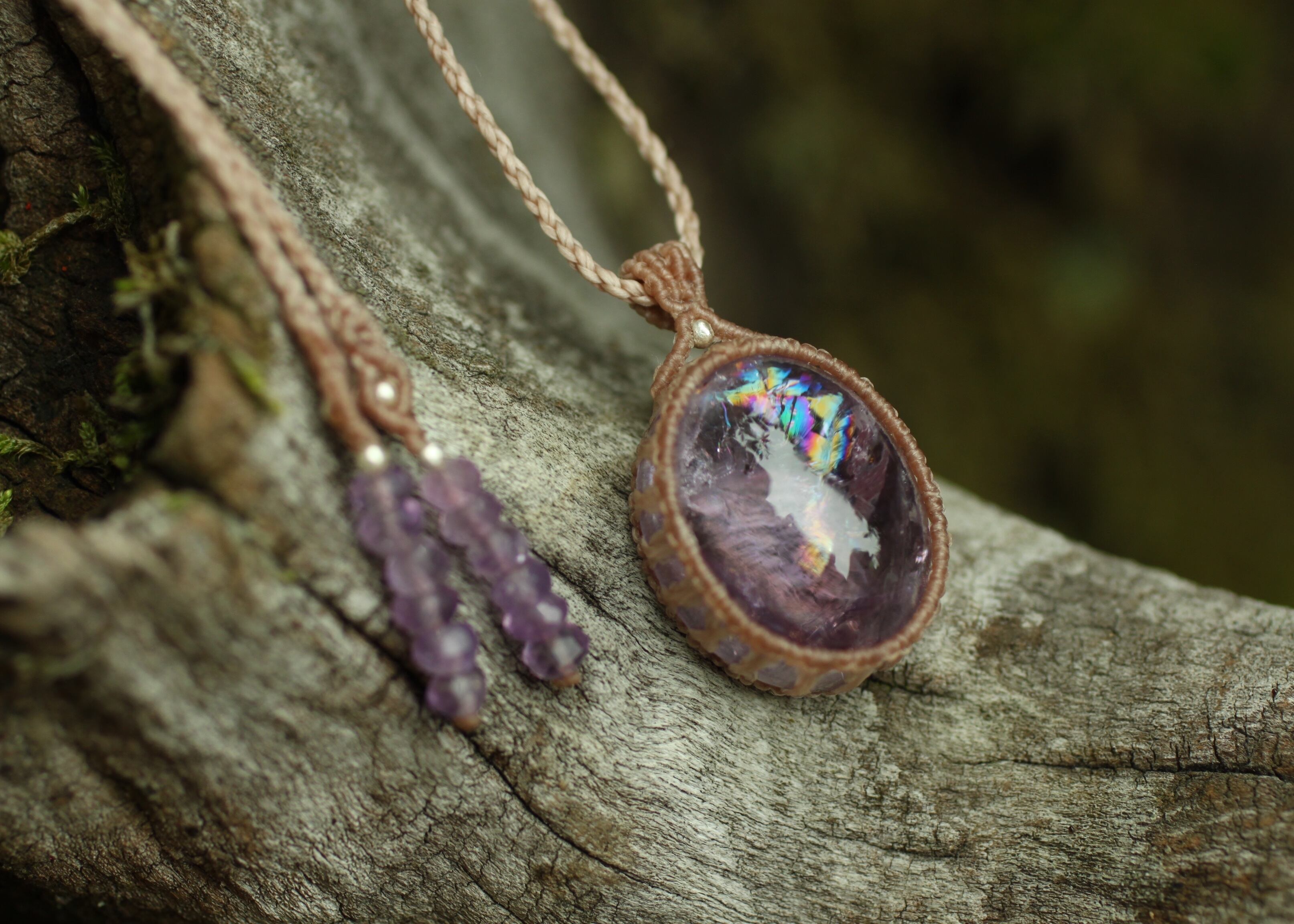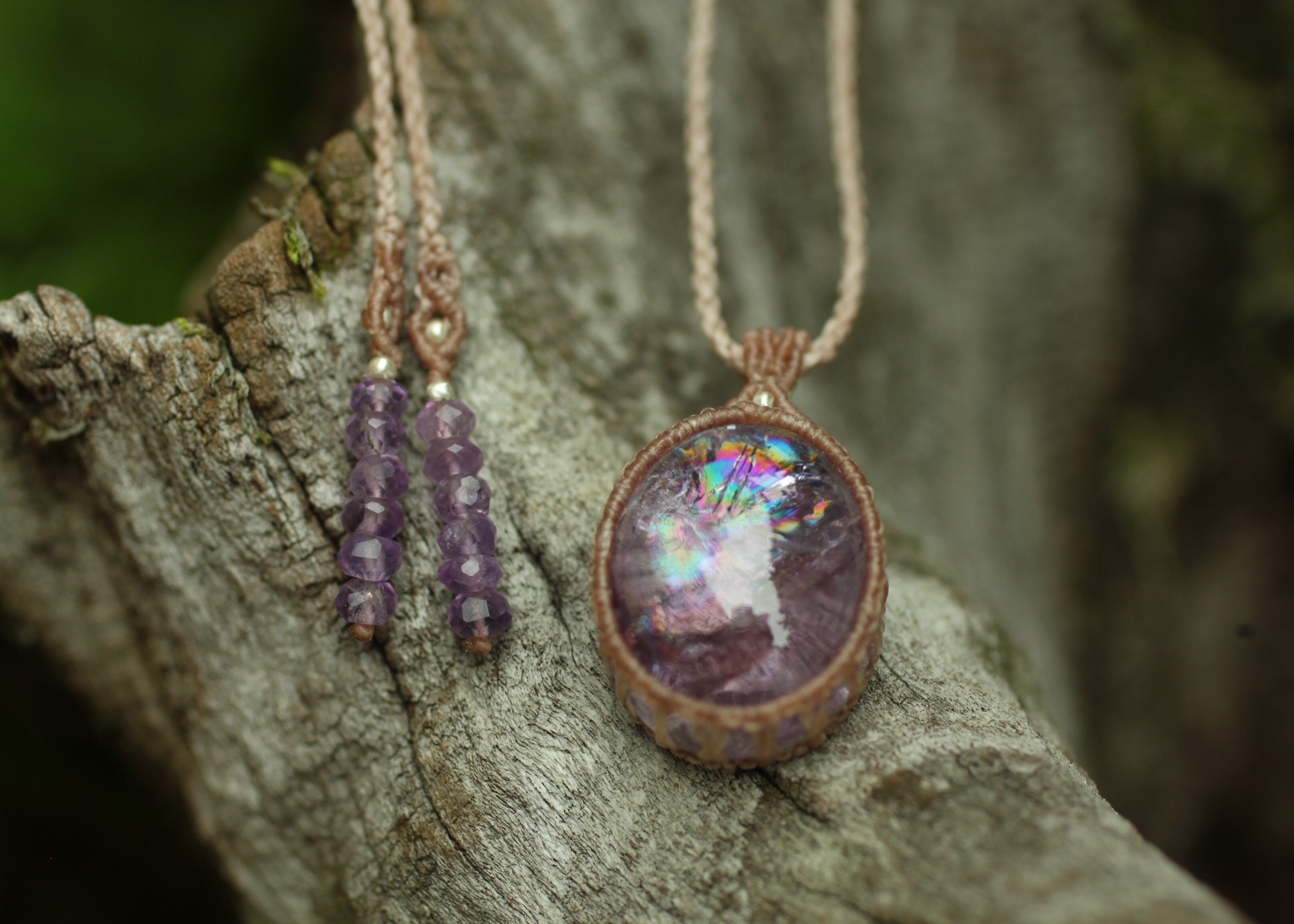 ※ 周囲に施したマクラメ編みは出来るだけ光りをアメシスト内に届け、