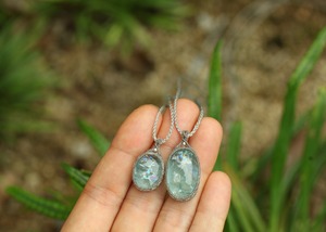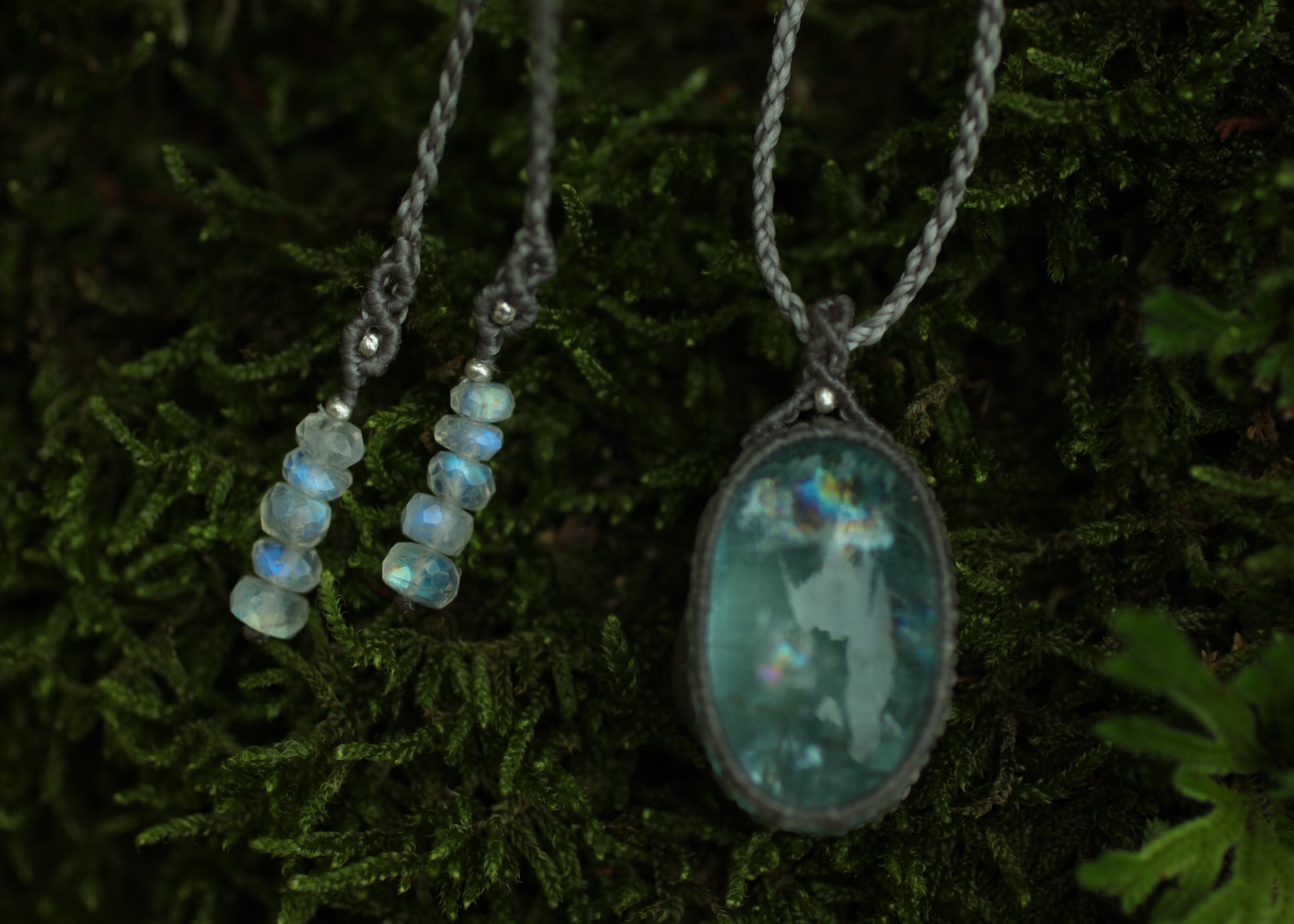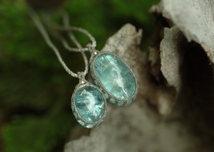 手縫い糸ほどの細いコードを使い出来る限り天然石の表情と繊細な仕上がりを重視し時間をかけ丁寧に編みました。