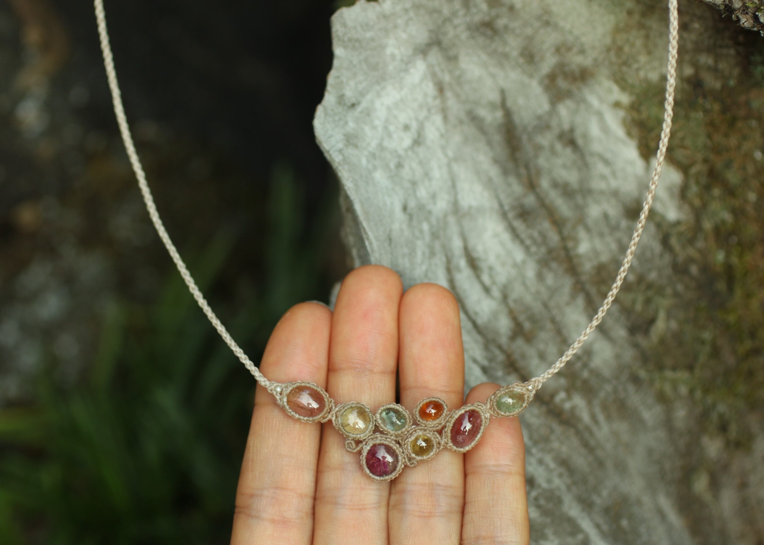 手縫い糸ほどの細いコードを使い出来る限り天然石の表情と繊細な仕上がりを重視し時間をかけ丁寧に編みました。