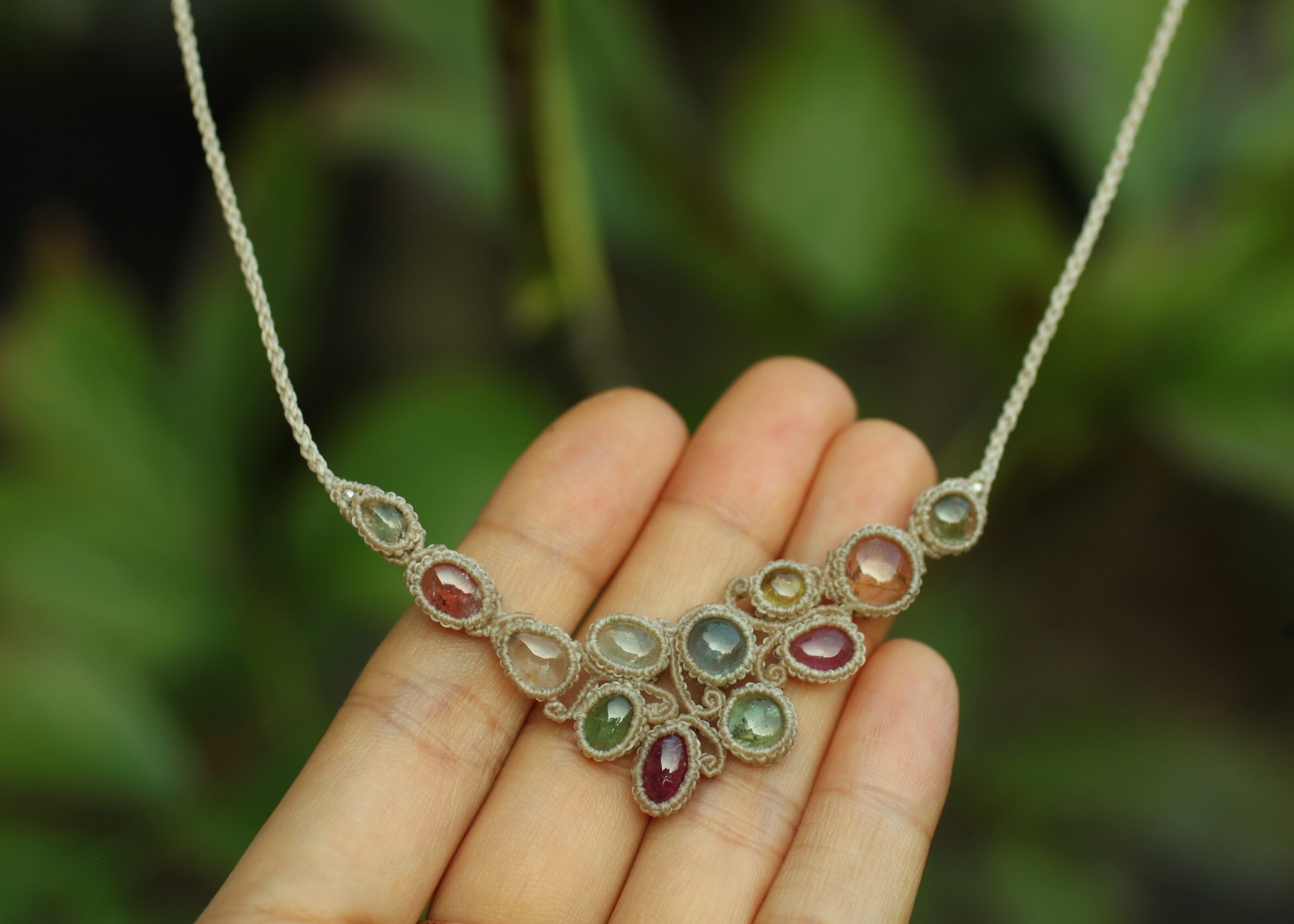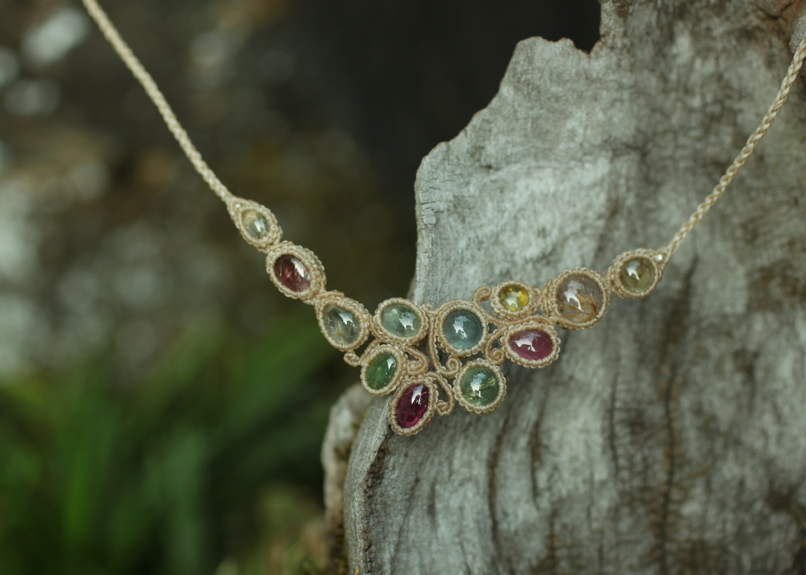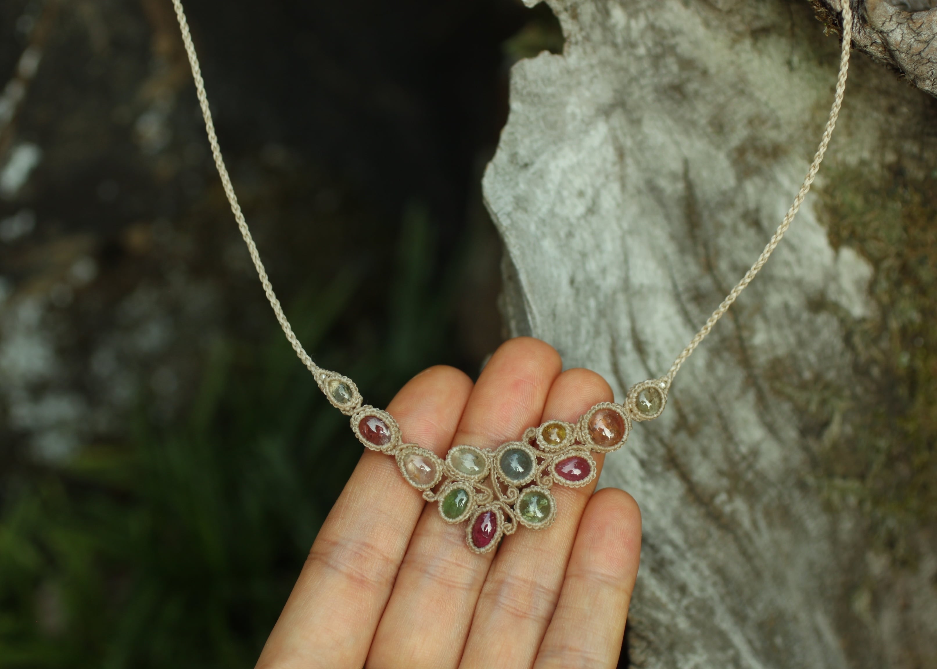 手縫い糸ほどの細いコードを使い出来る限り天然石の表情と繊細な仕上がりを重視し時間をかけ丁寧に編みました。