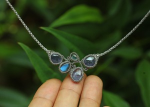 手縫い糸ほどの細いコードを使い出来る限り天然石の表情と繊細な仕上がりを重視し時間をかけ丁寧に編みました。