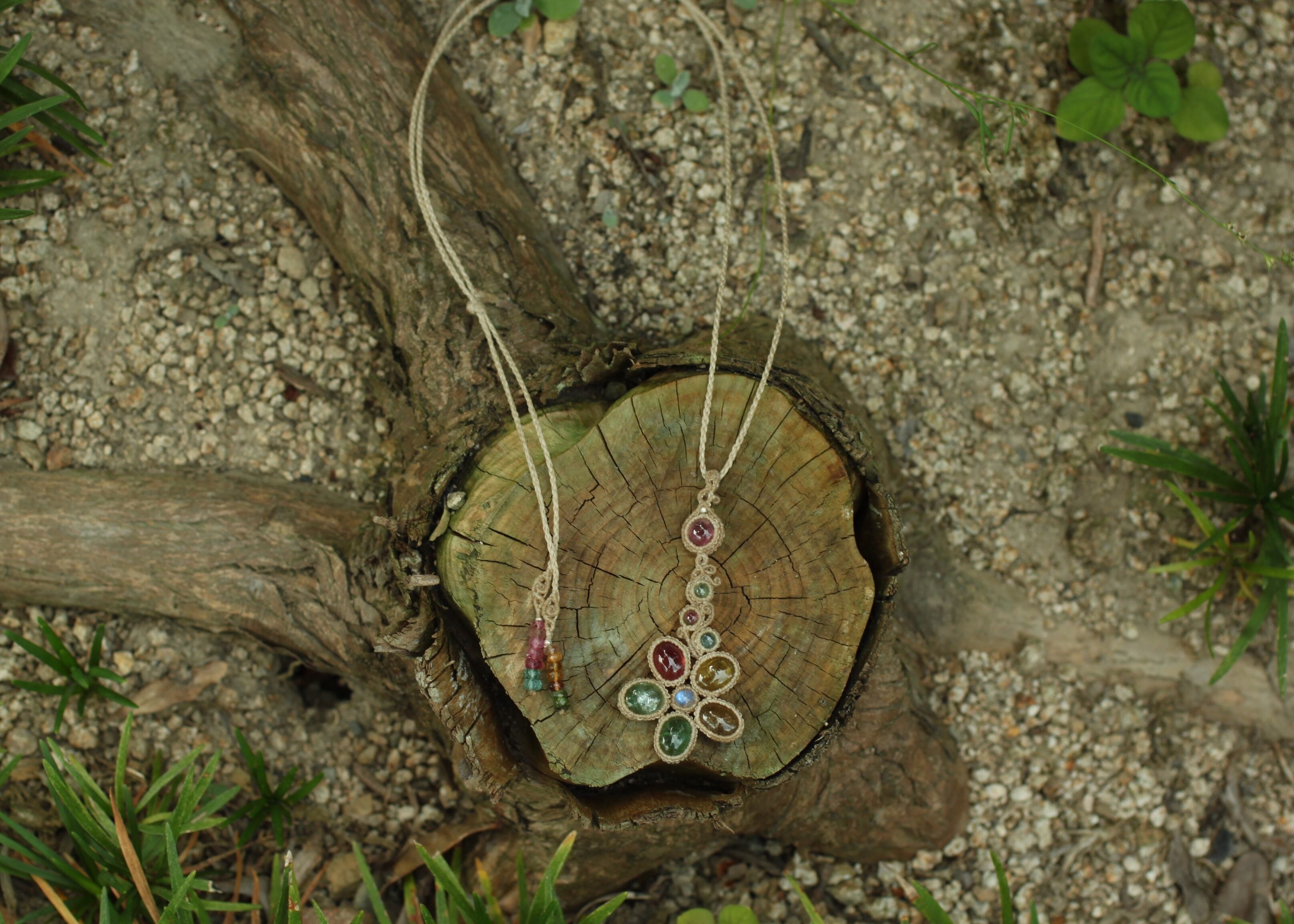 トルマリンの特性、多色性を活かした色とりどりな天然石による花のあしらいペンダント