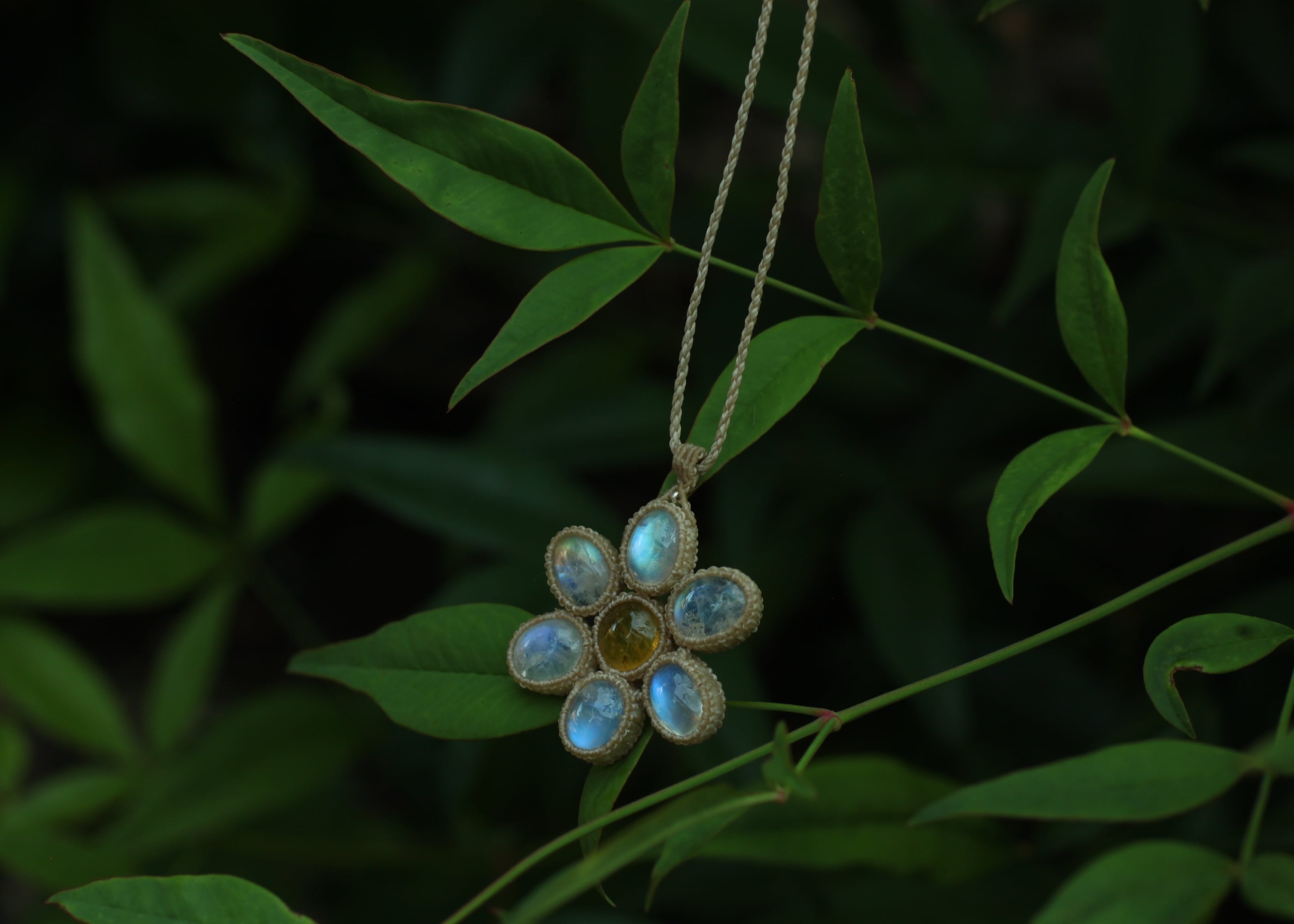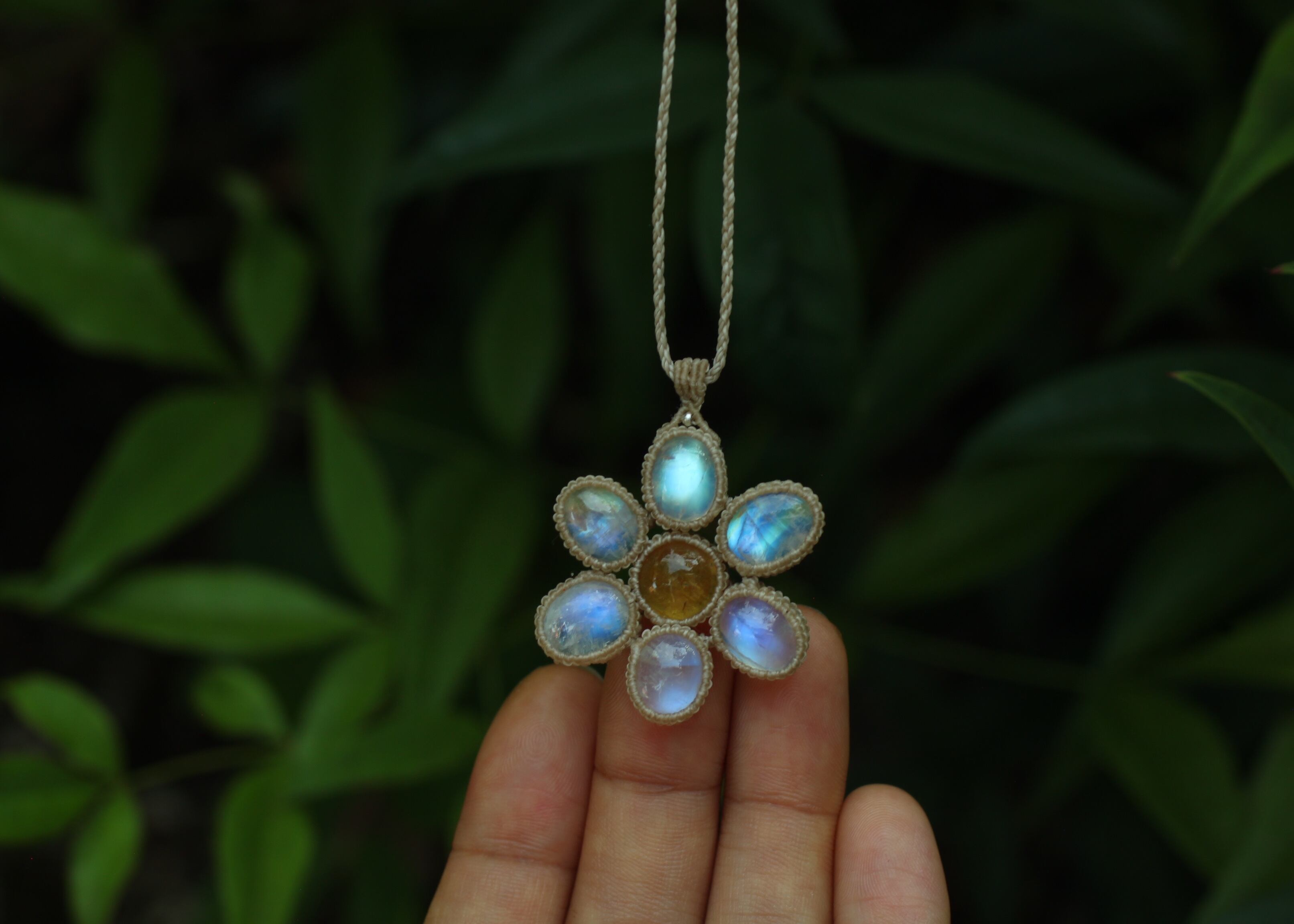 手縫い糸ほどの細いコードを使い出来る限り天然石の表情と繊細な仕上がりを重視し時間をかけ丁寧に編みました。