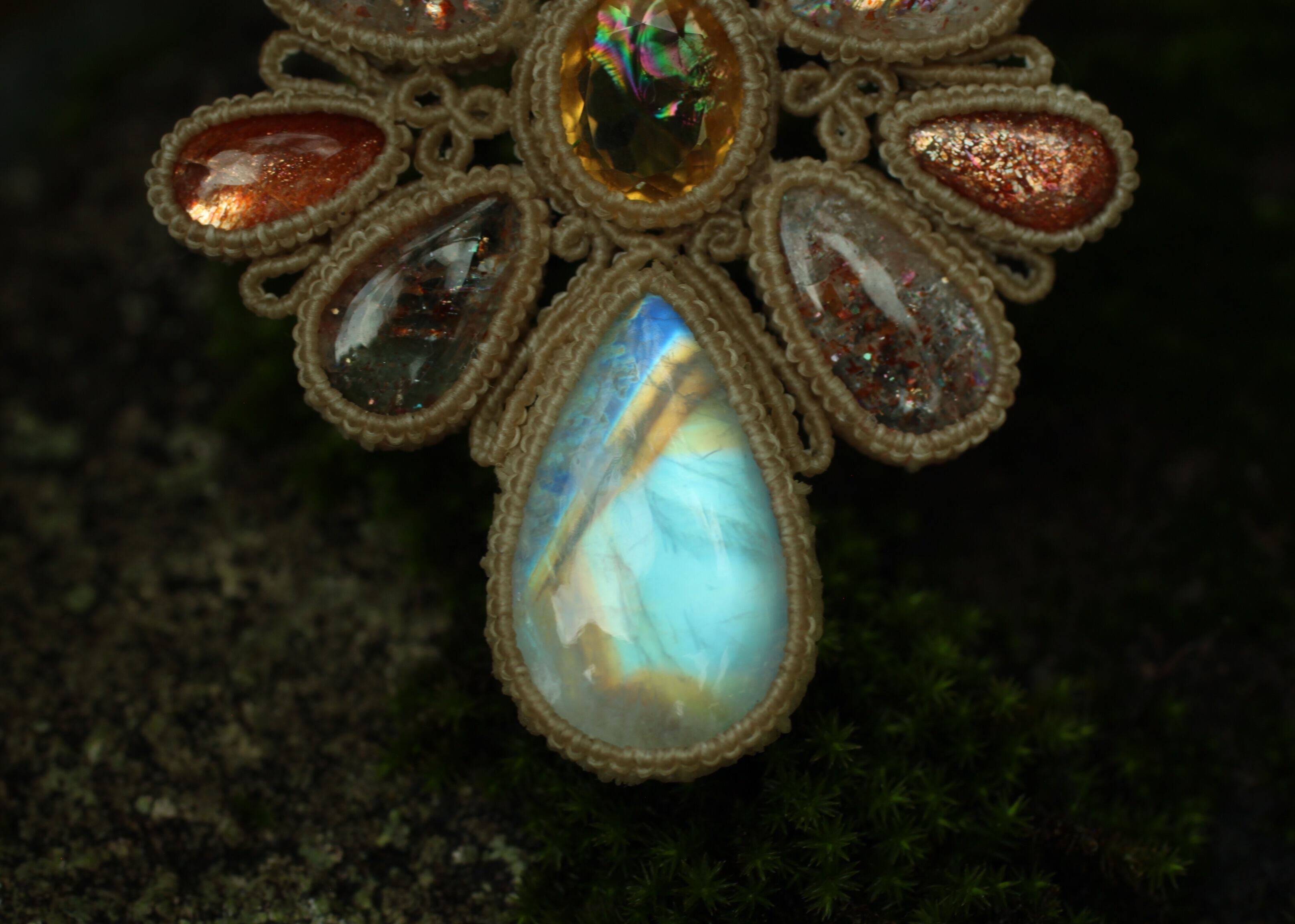 手縫い糸ほどの細いコードを使い出来る限り天然石の表情と繊細な仕上がりを重視し時間をかけ丁寧に編みました。