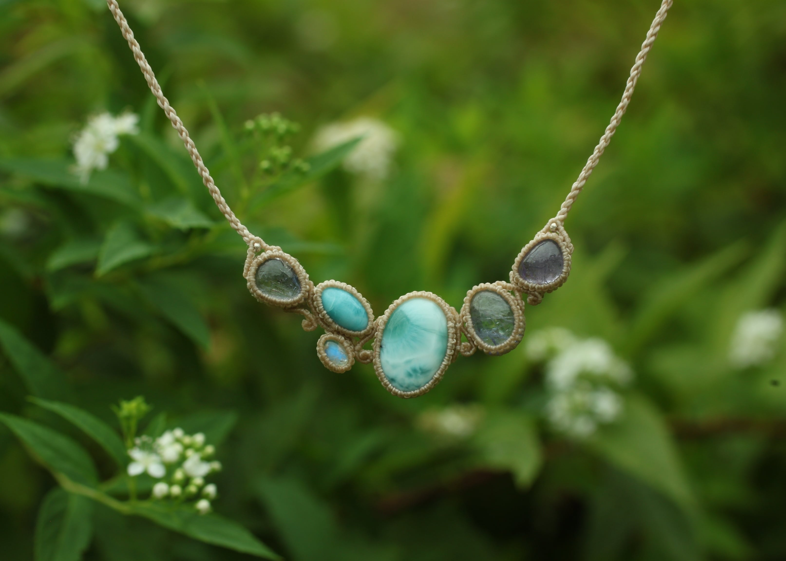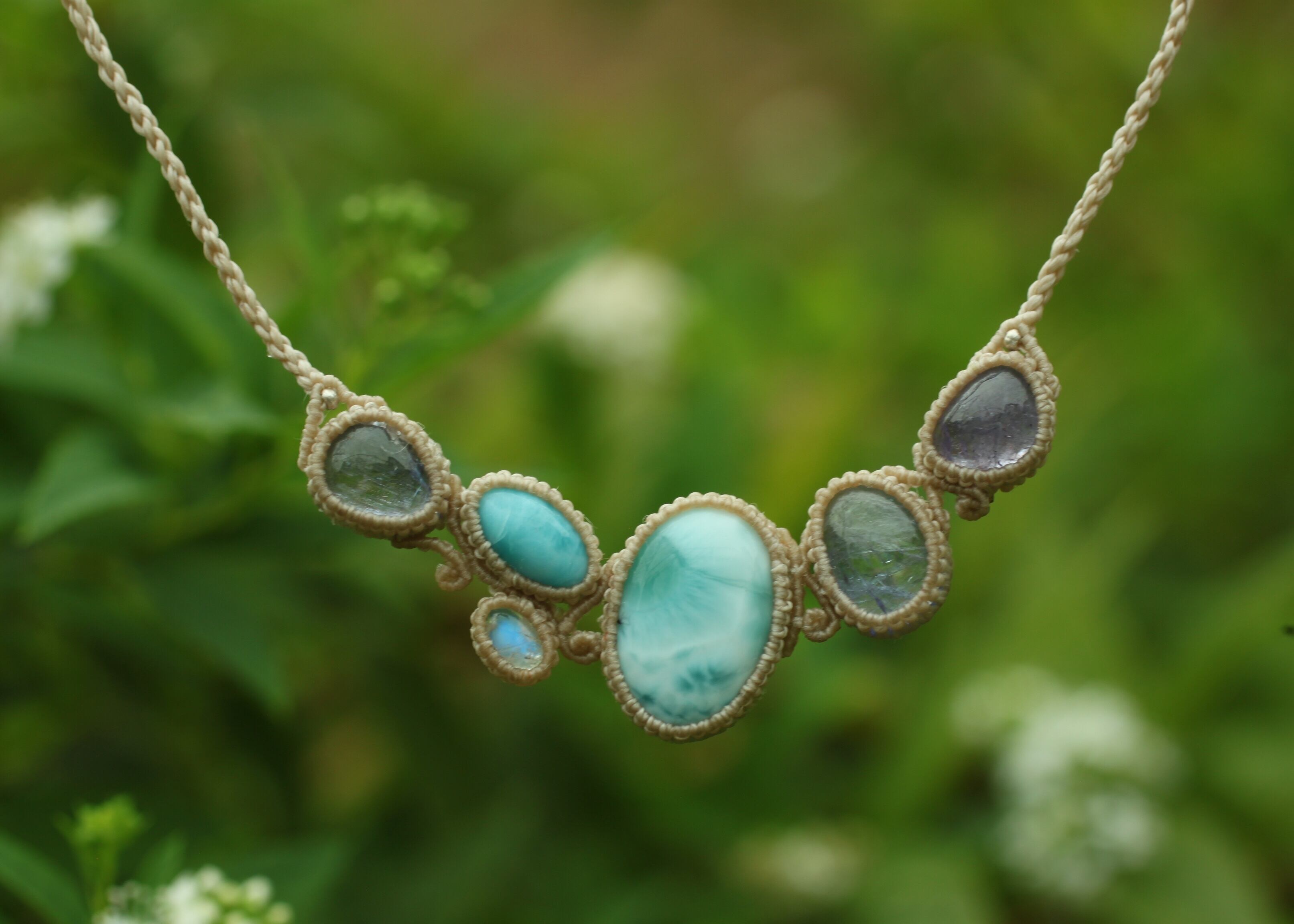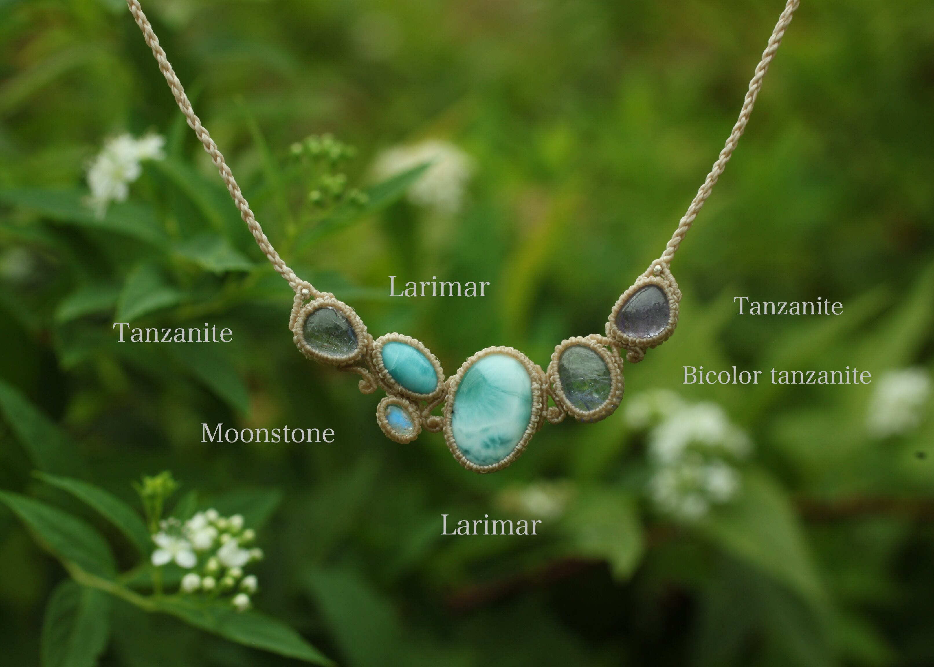 手縫い糸ほどの細いコードを使い出来る限り天然石の表情と繊細な仕上がりを重視し時間をかけ丁寧に編みました。