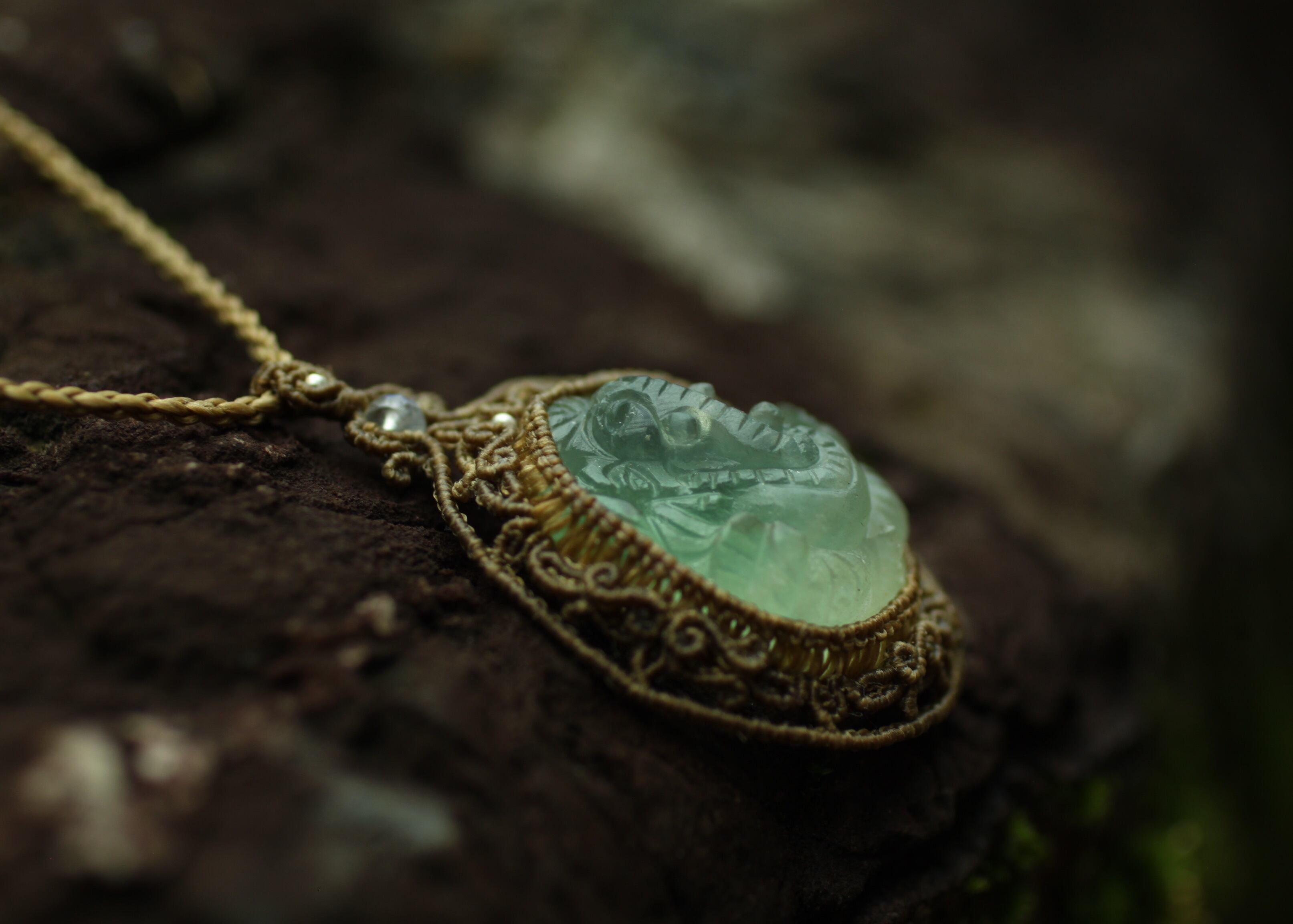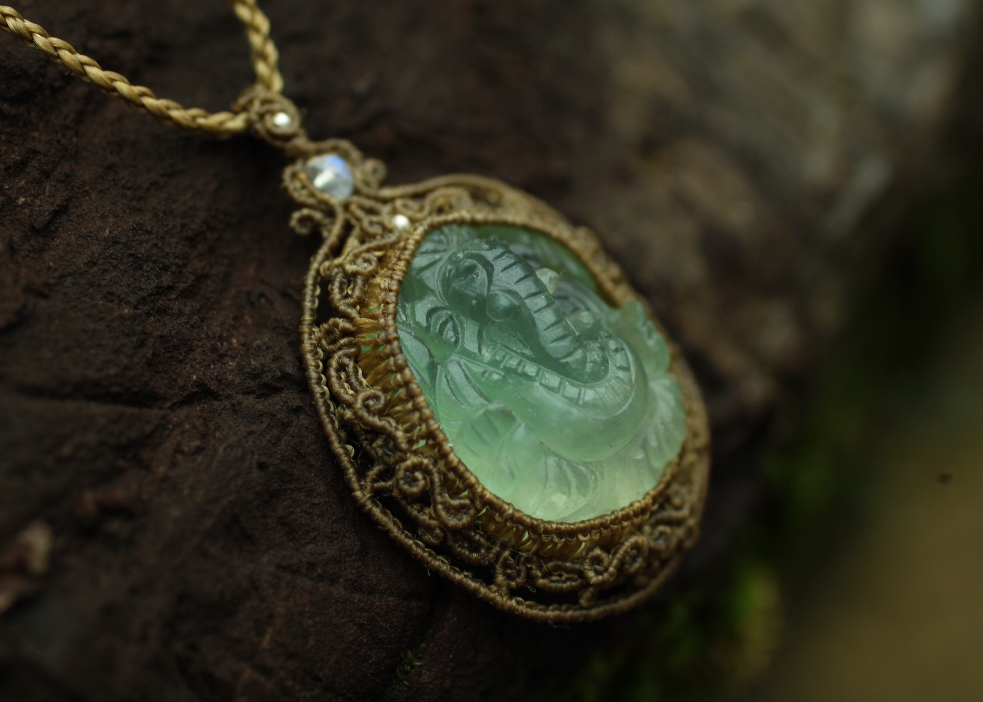 手縫い糸ほどの細いコードを使い出来る限り天然石の表情と繊細な仕上がりを重視し時間をかけ丁寧に編みました。