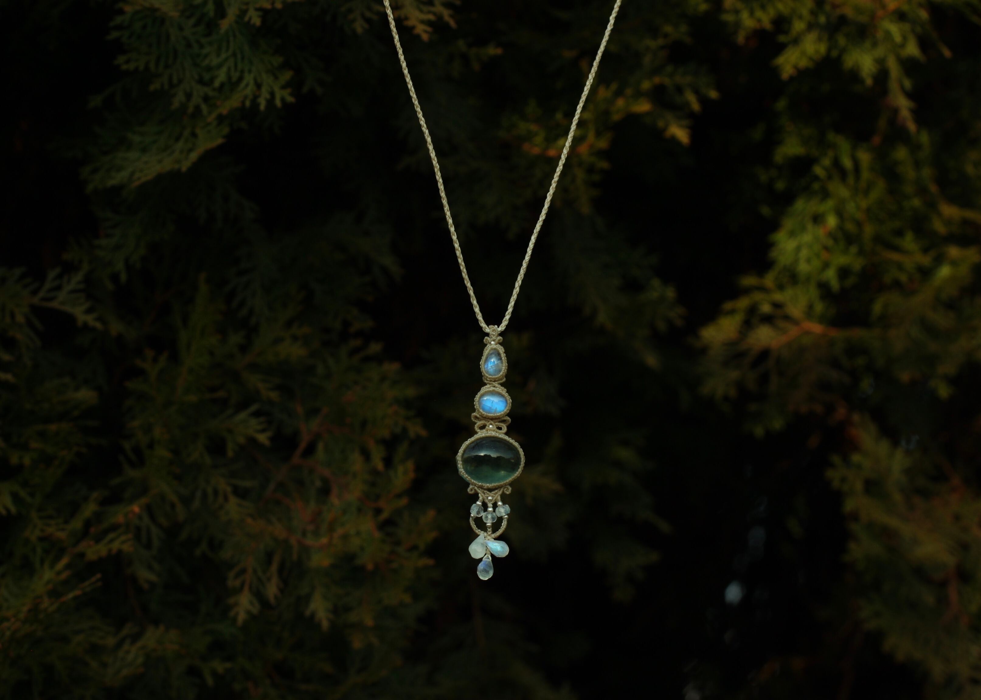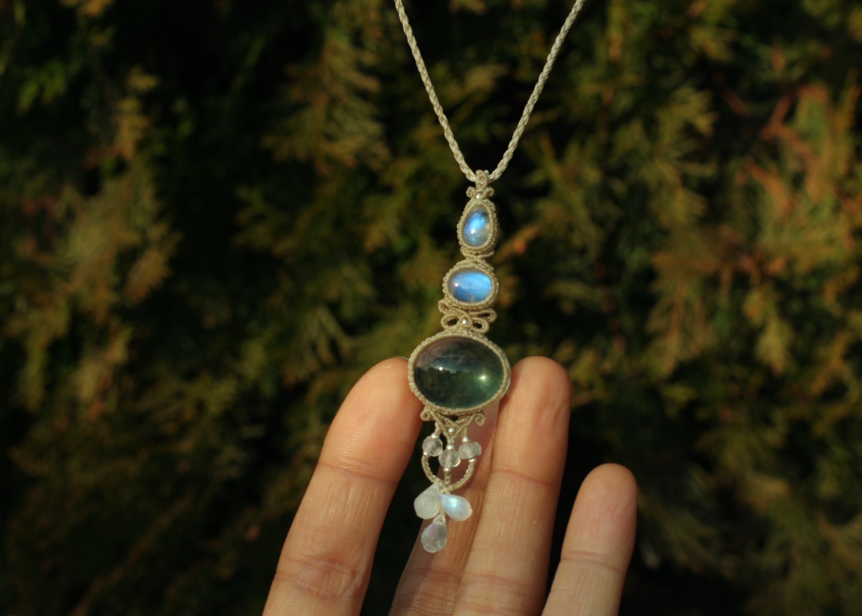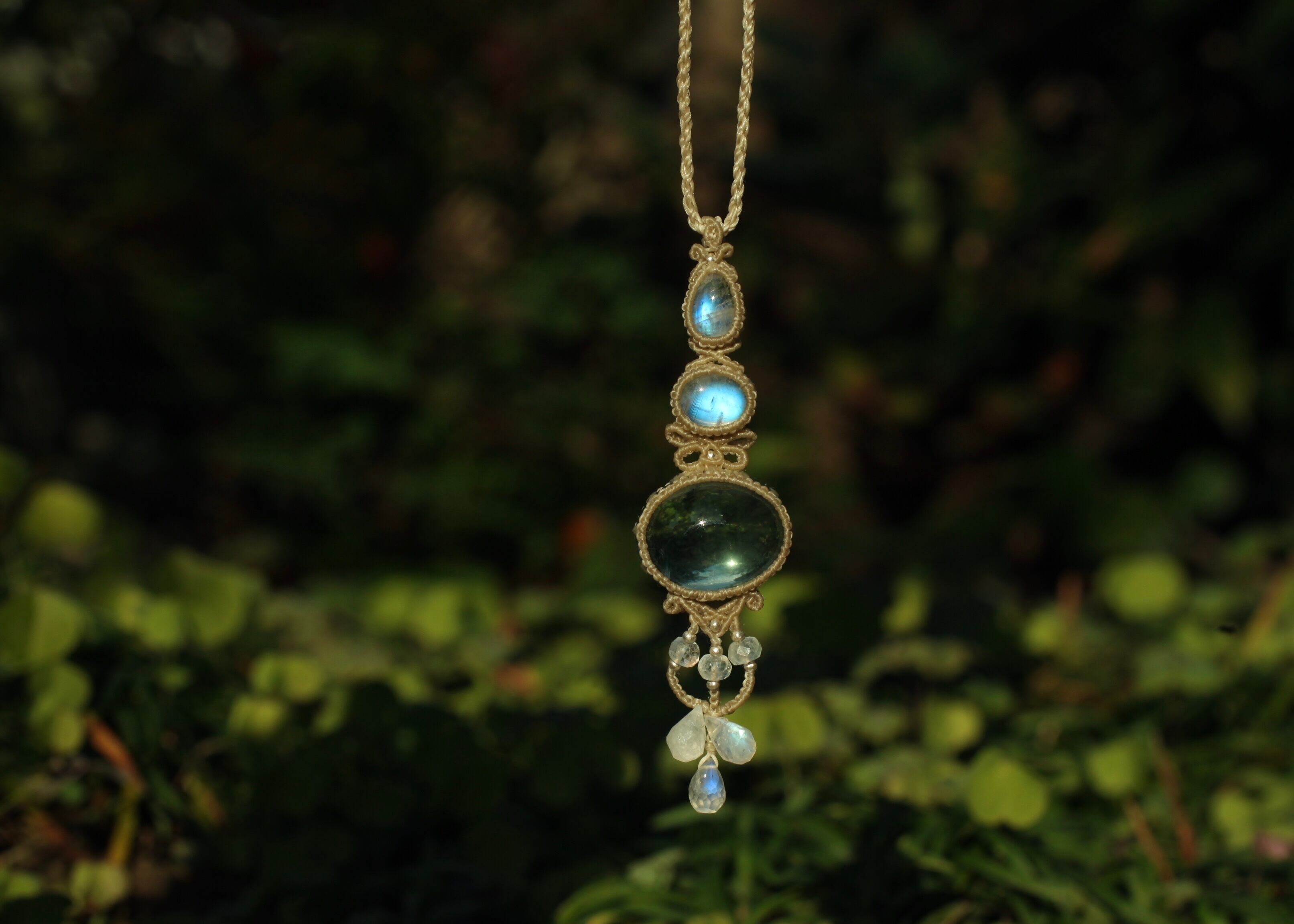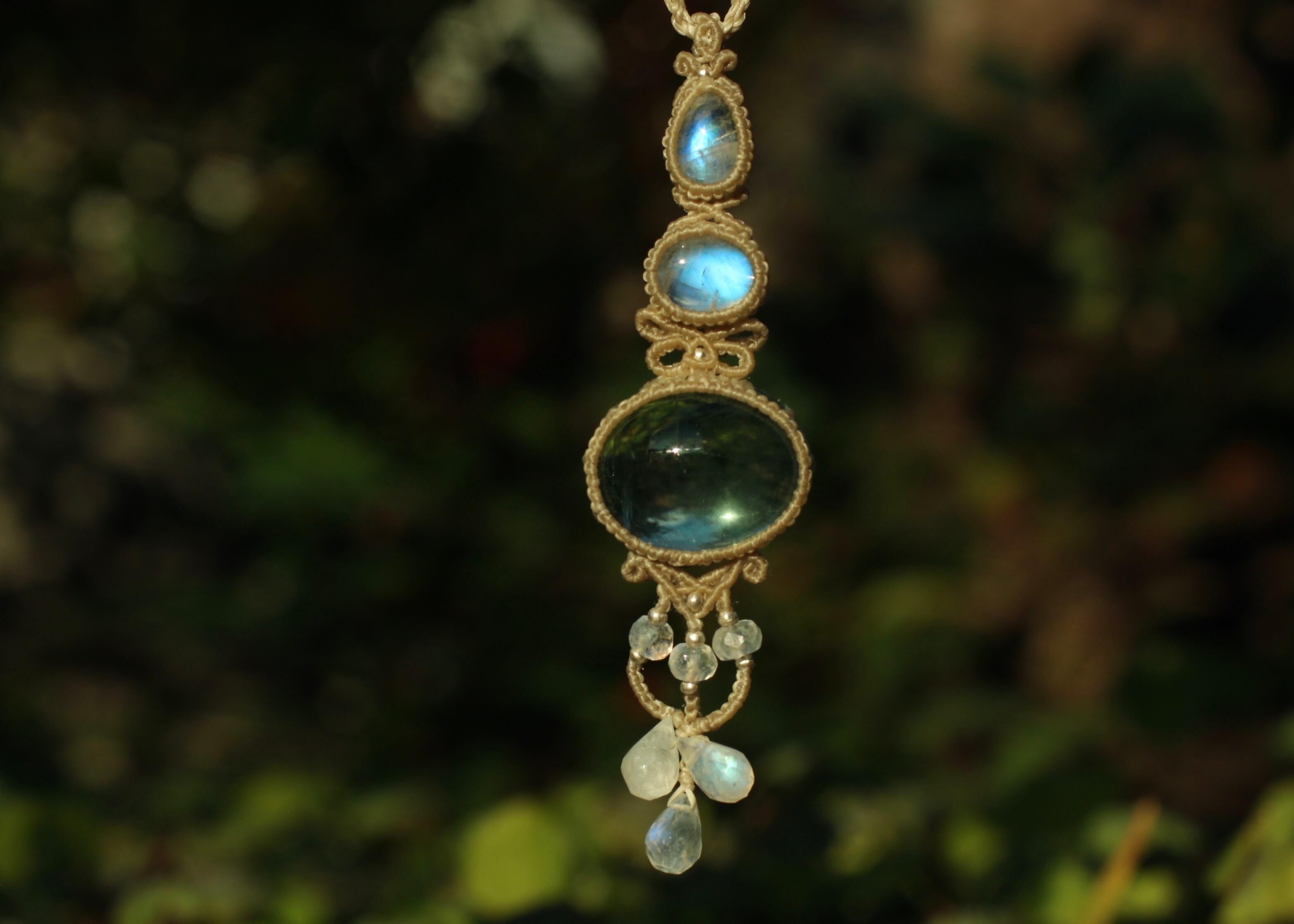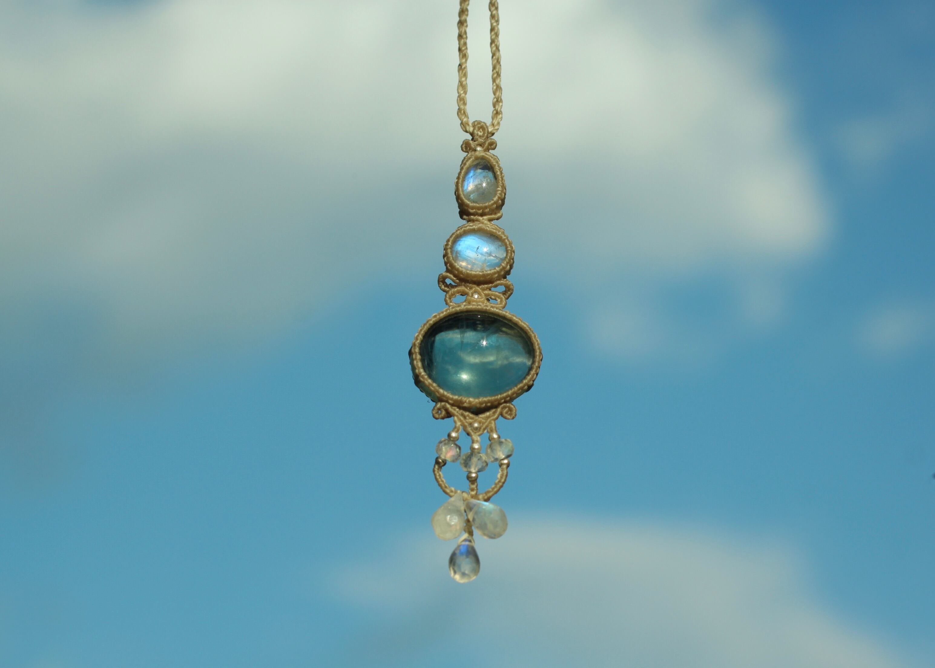 フローライトの周りを透かすようなマクラメ編みを施しました。