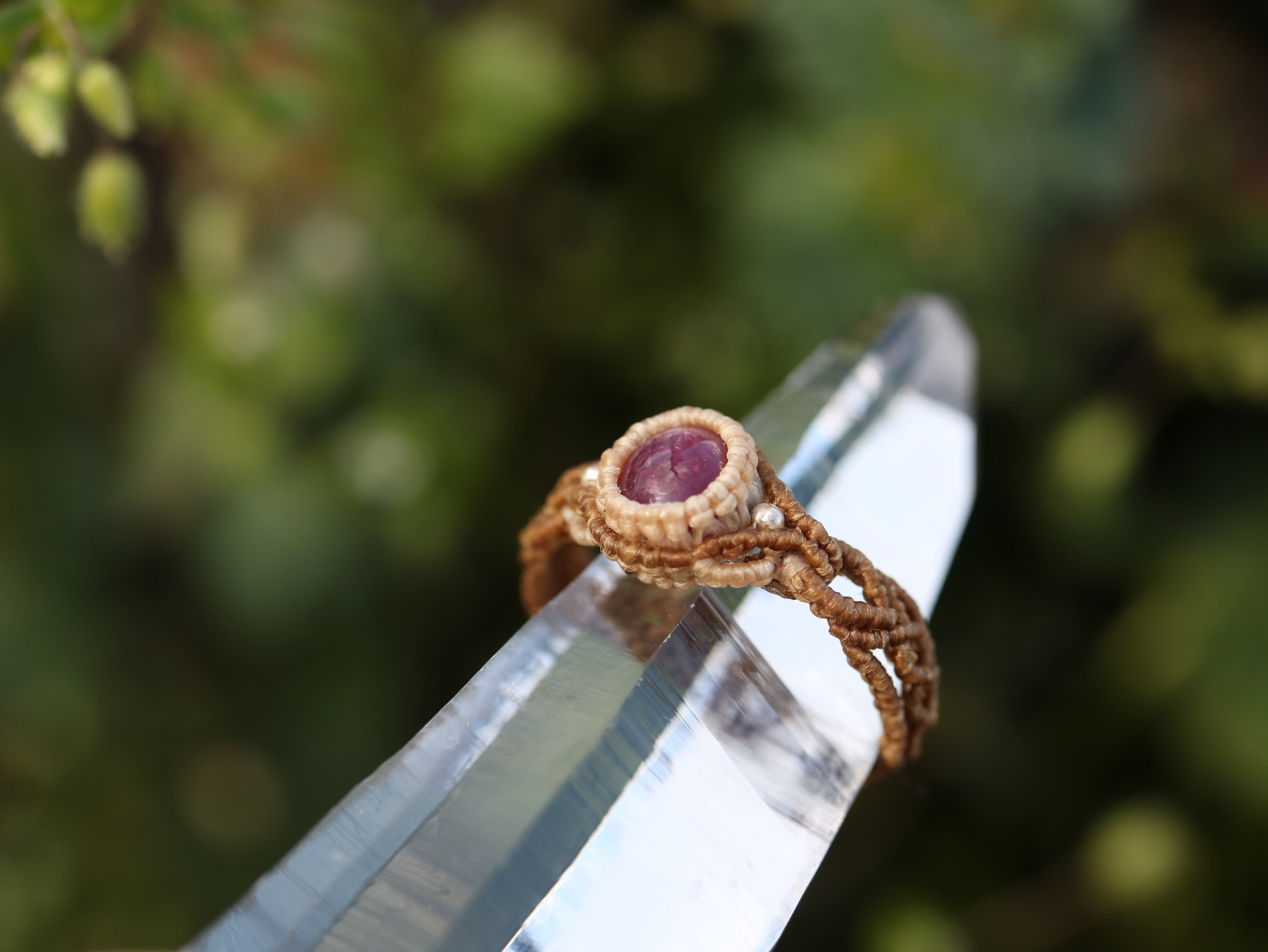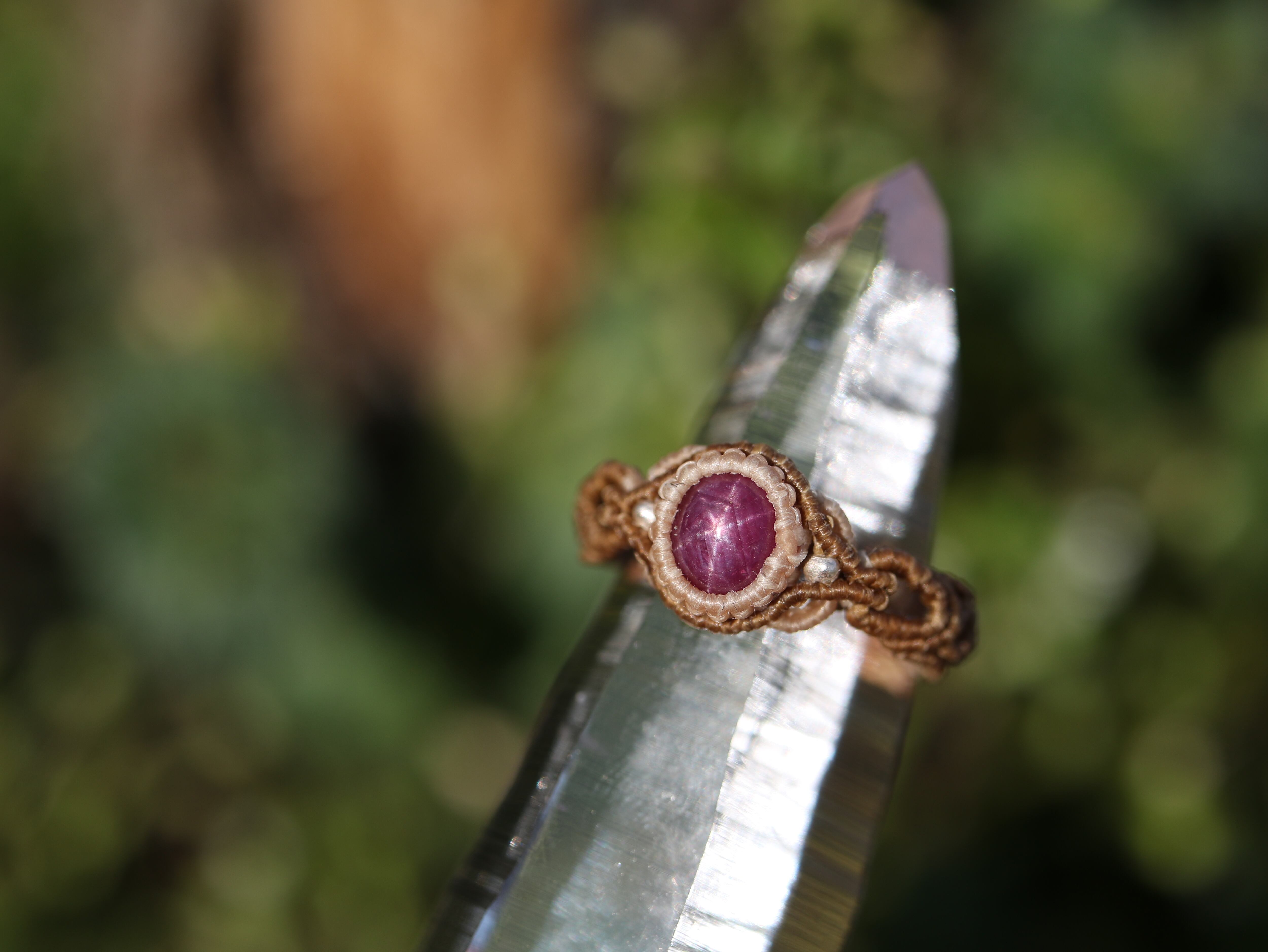 小さなスタールビーの周りに明るい色のコードを合わせて