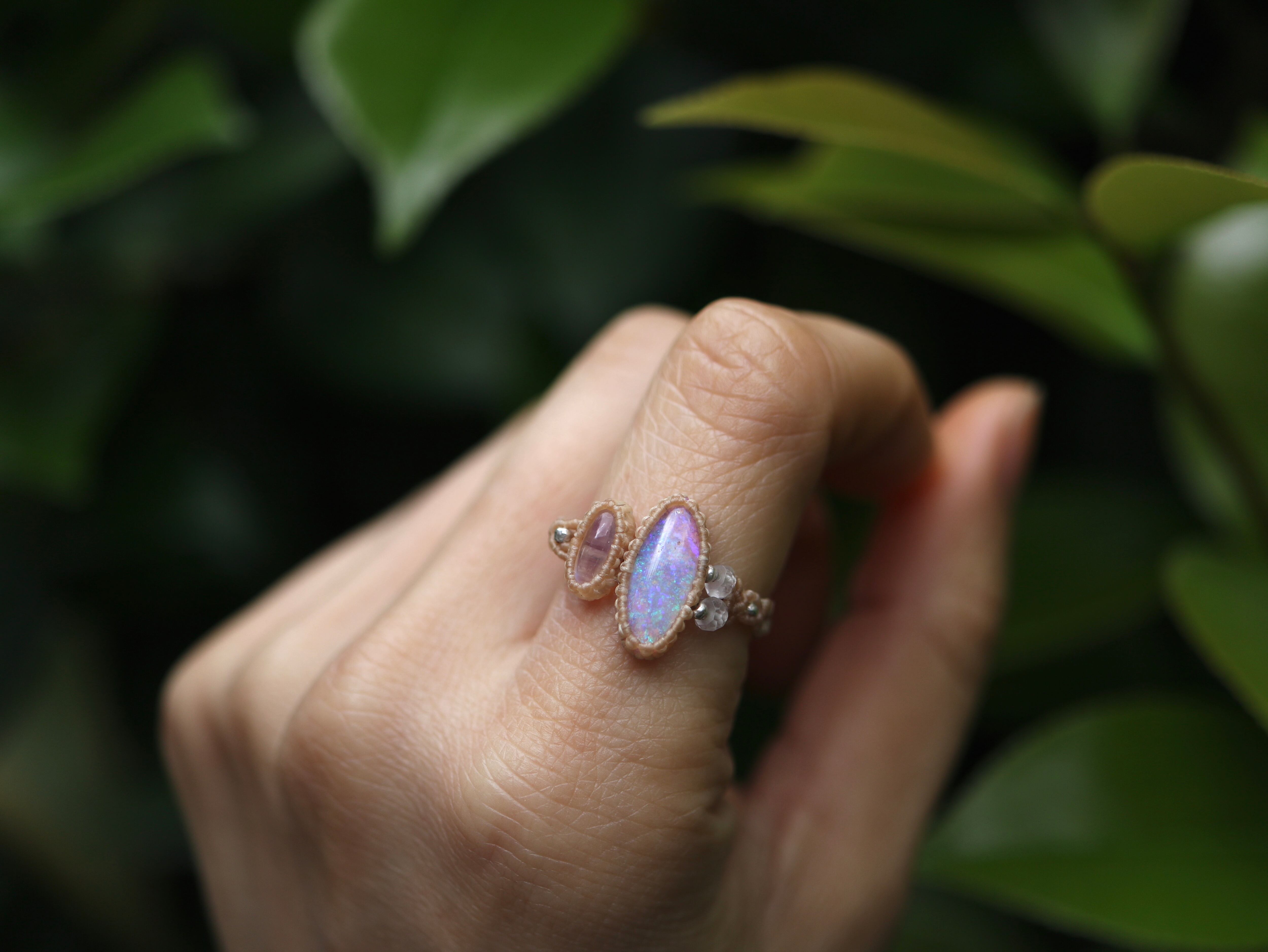 手縫い糸ほどの細いコードを使い、天然石の表情を引き立てるようひと目ひと目丁寧に編み上げています。