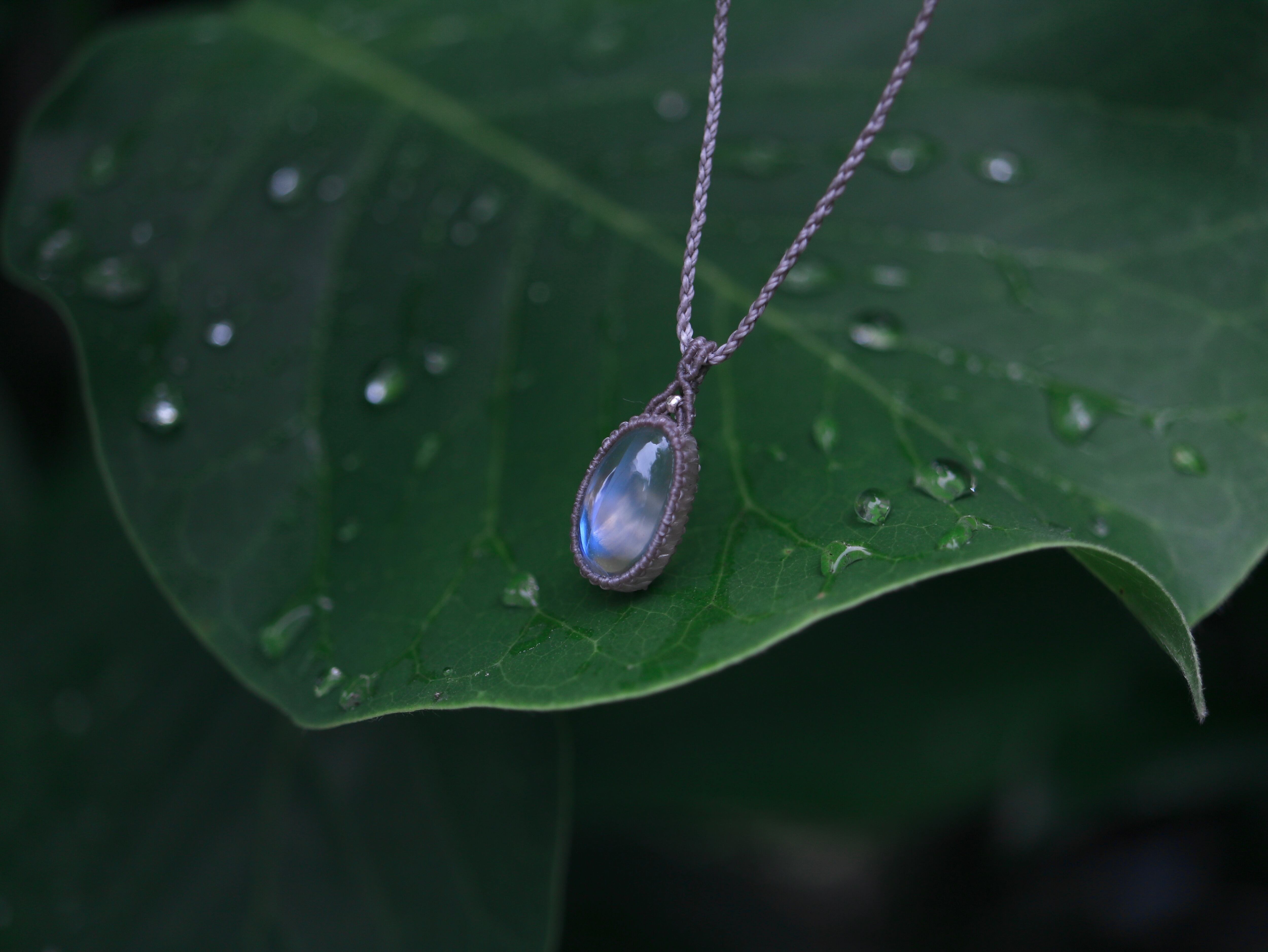 手縫い糸ほどの細いコードを使い、天然石の表情を引き立てるよう