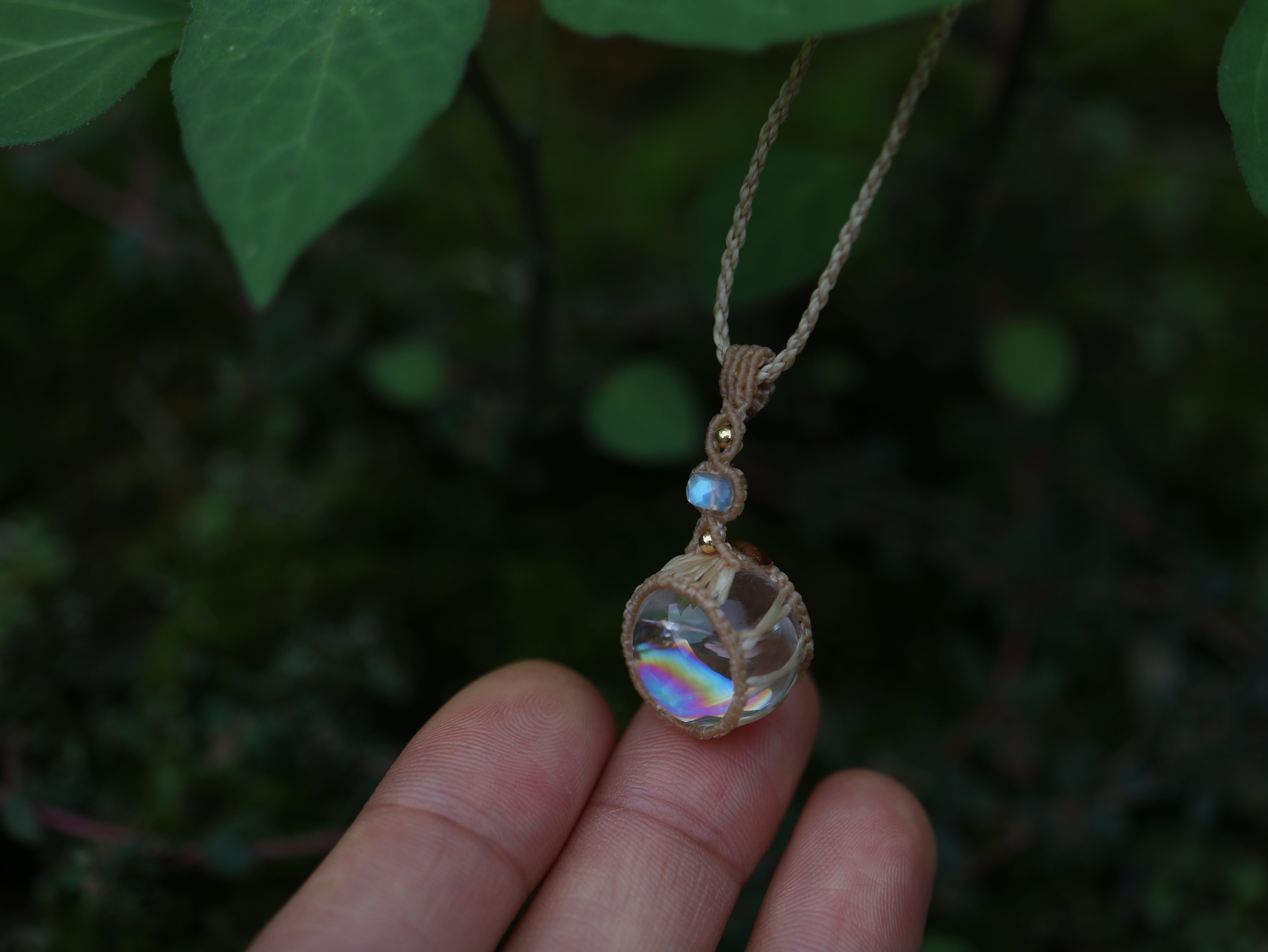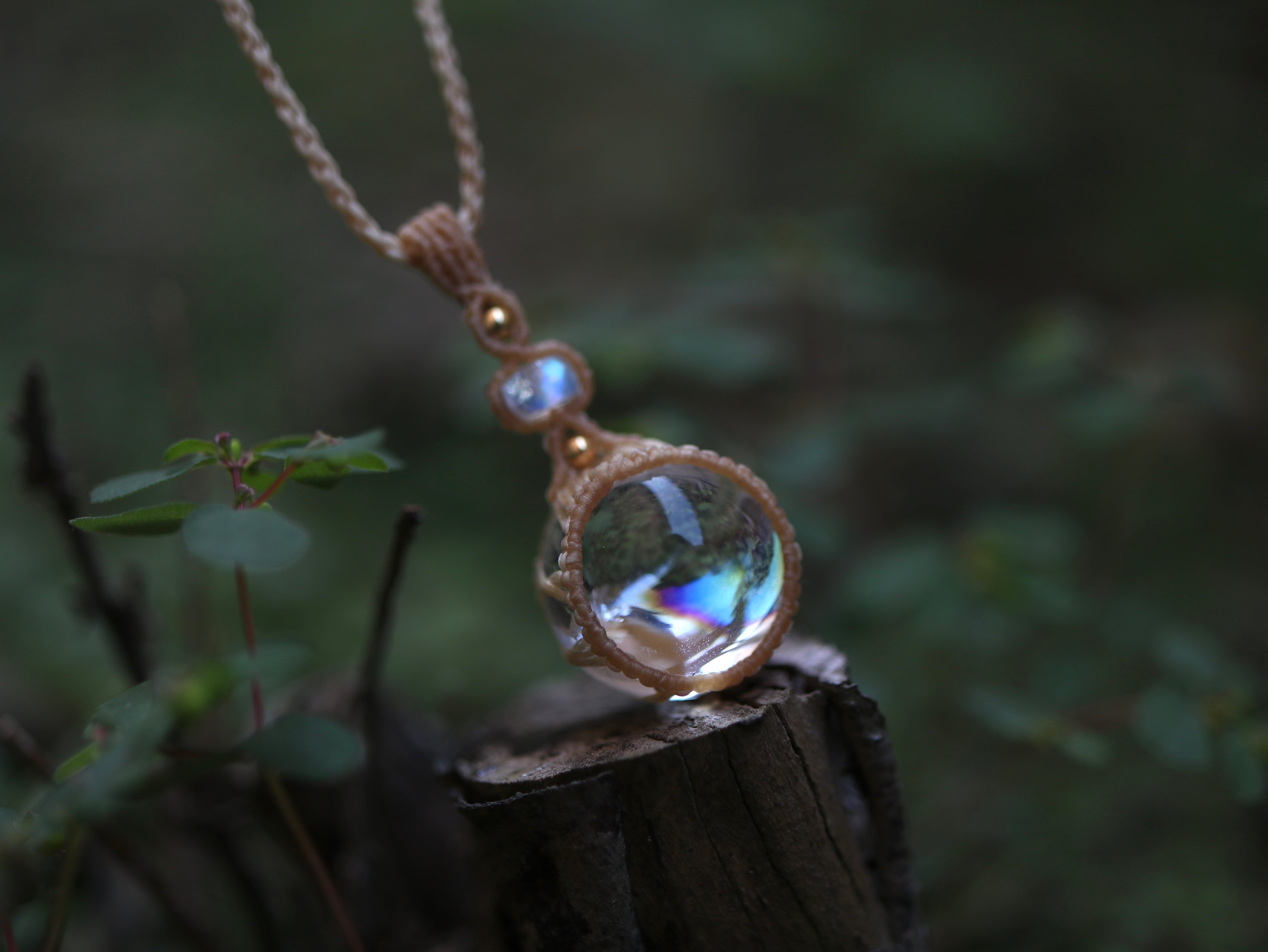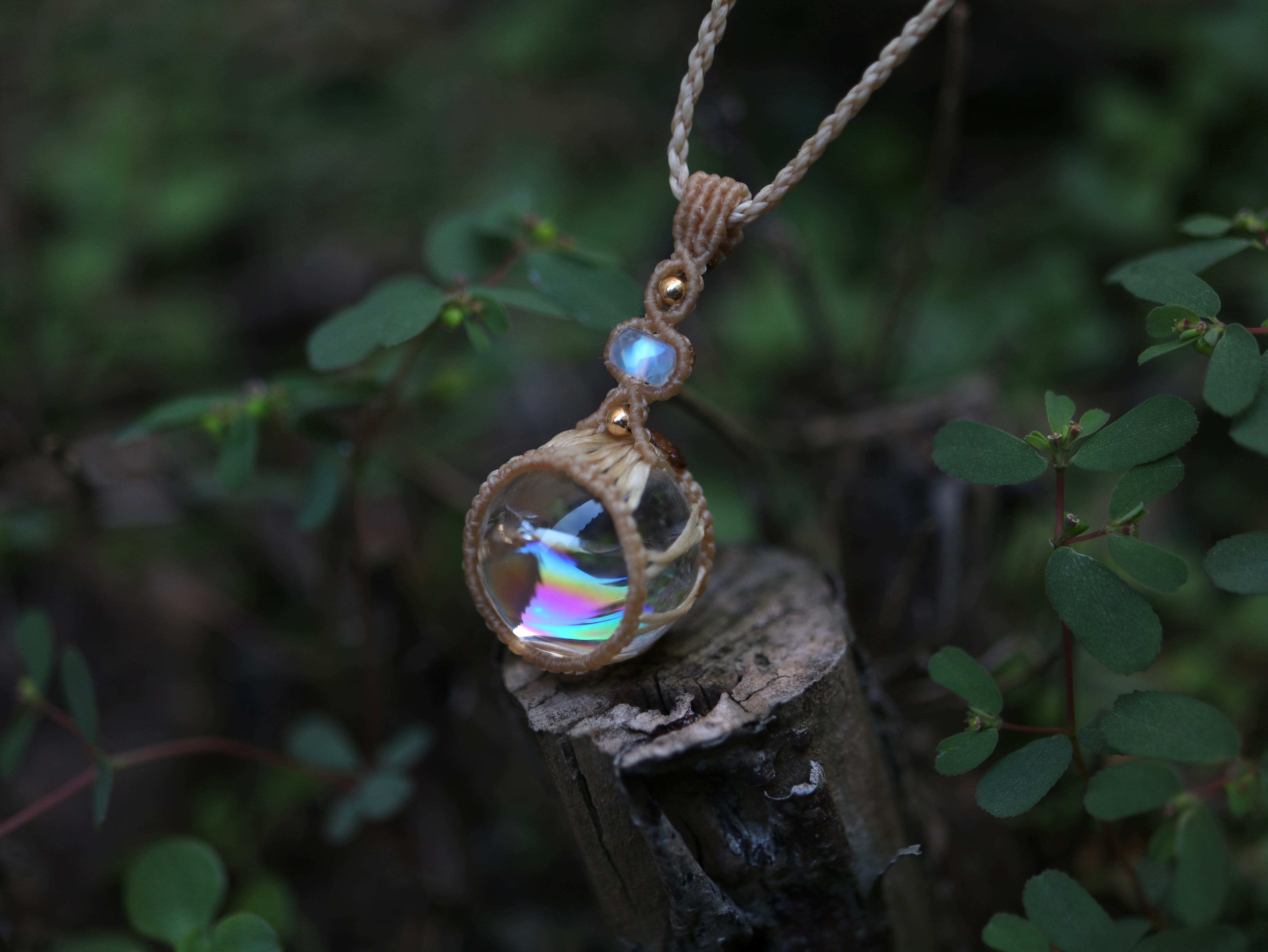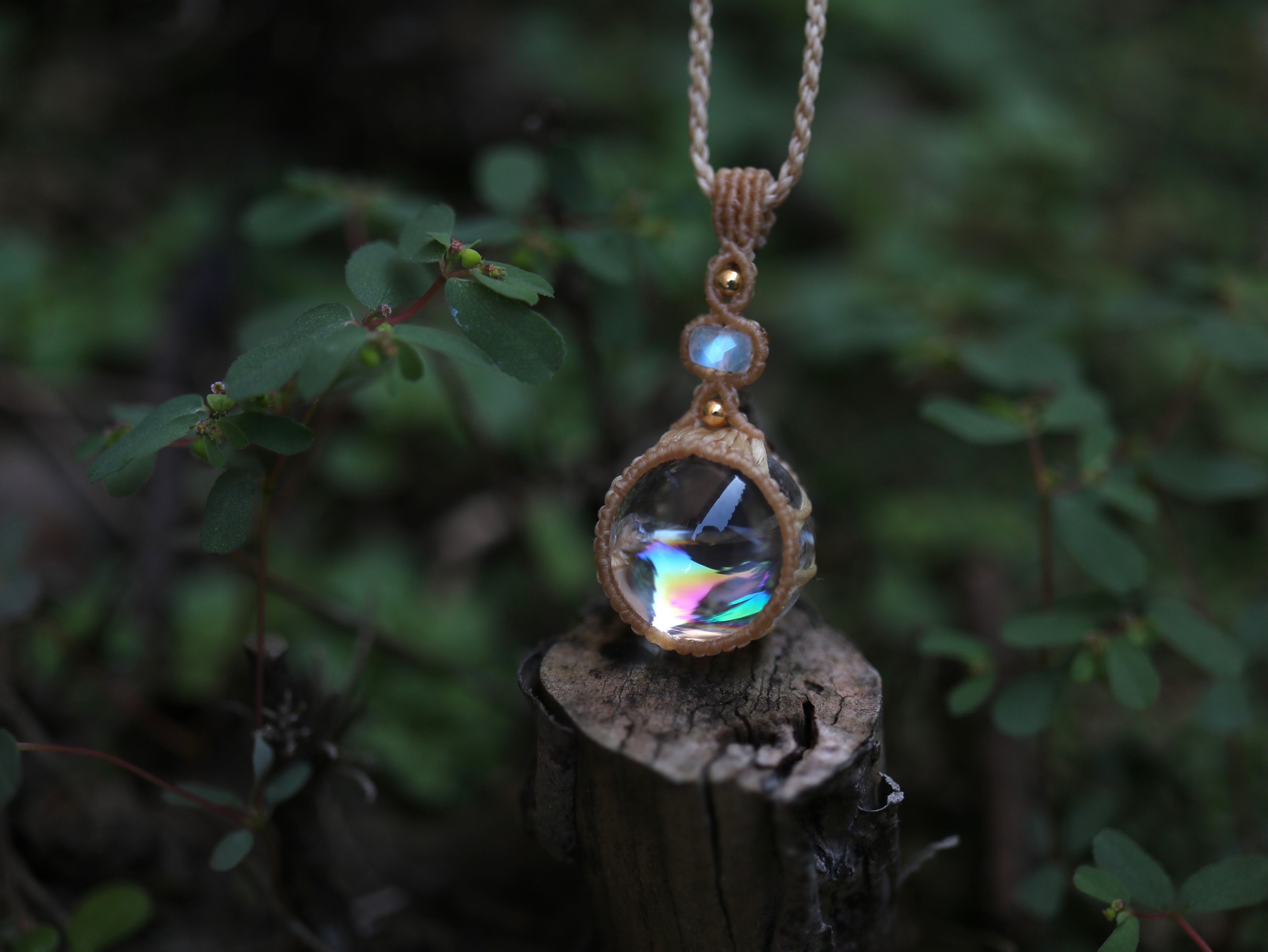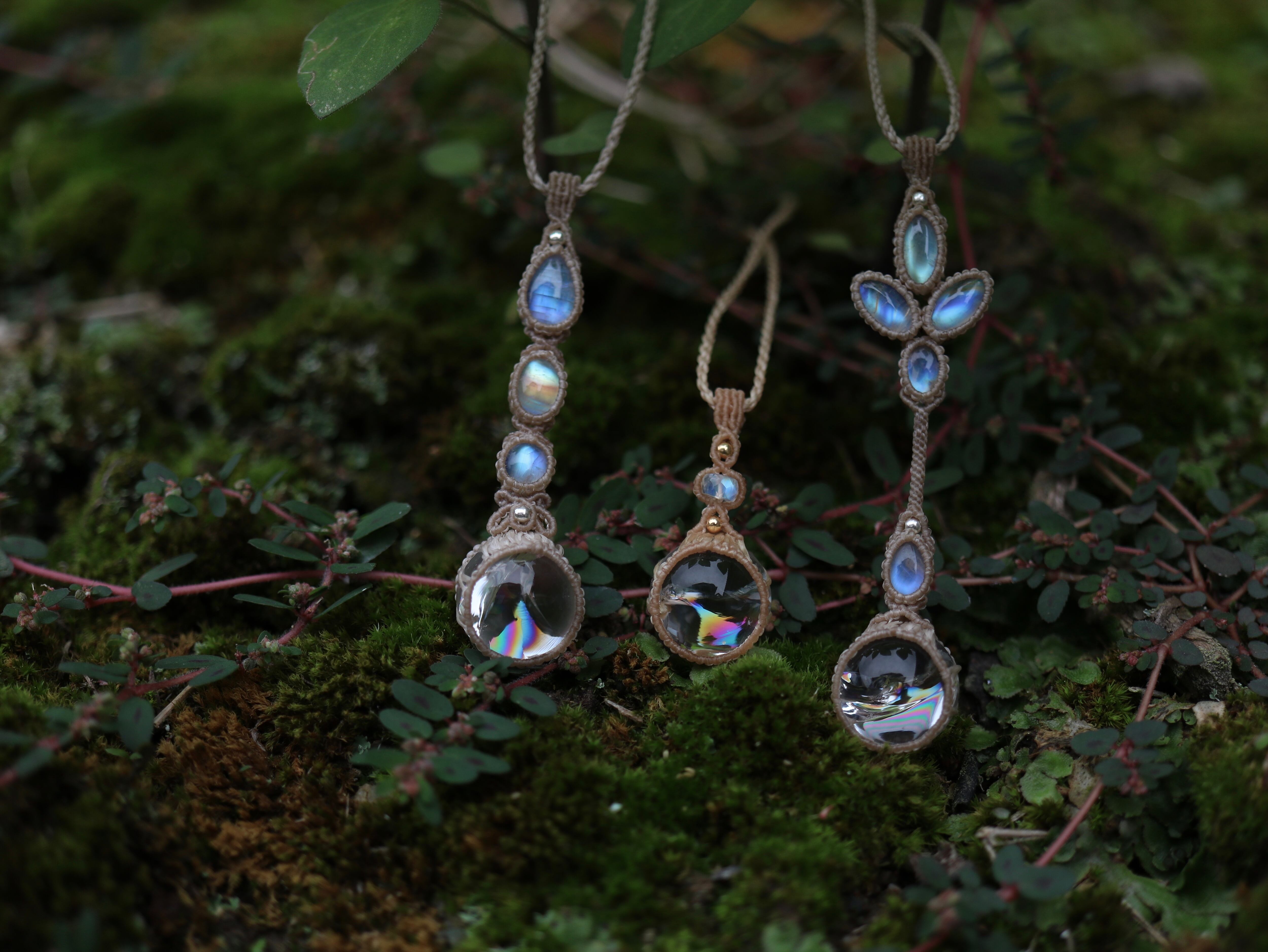 ※ 天然石を包むコードを始めトップ部分に使用したマクラメ編みコードは手縫い糸ほどの細いコードを使い、天然石の表情を引き立てるようひと目ひと目丁寧に編み上げています。
