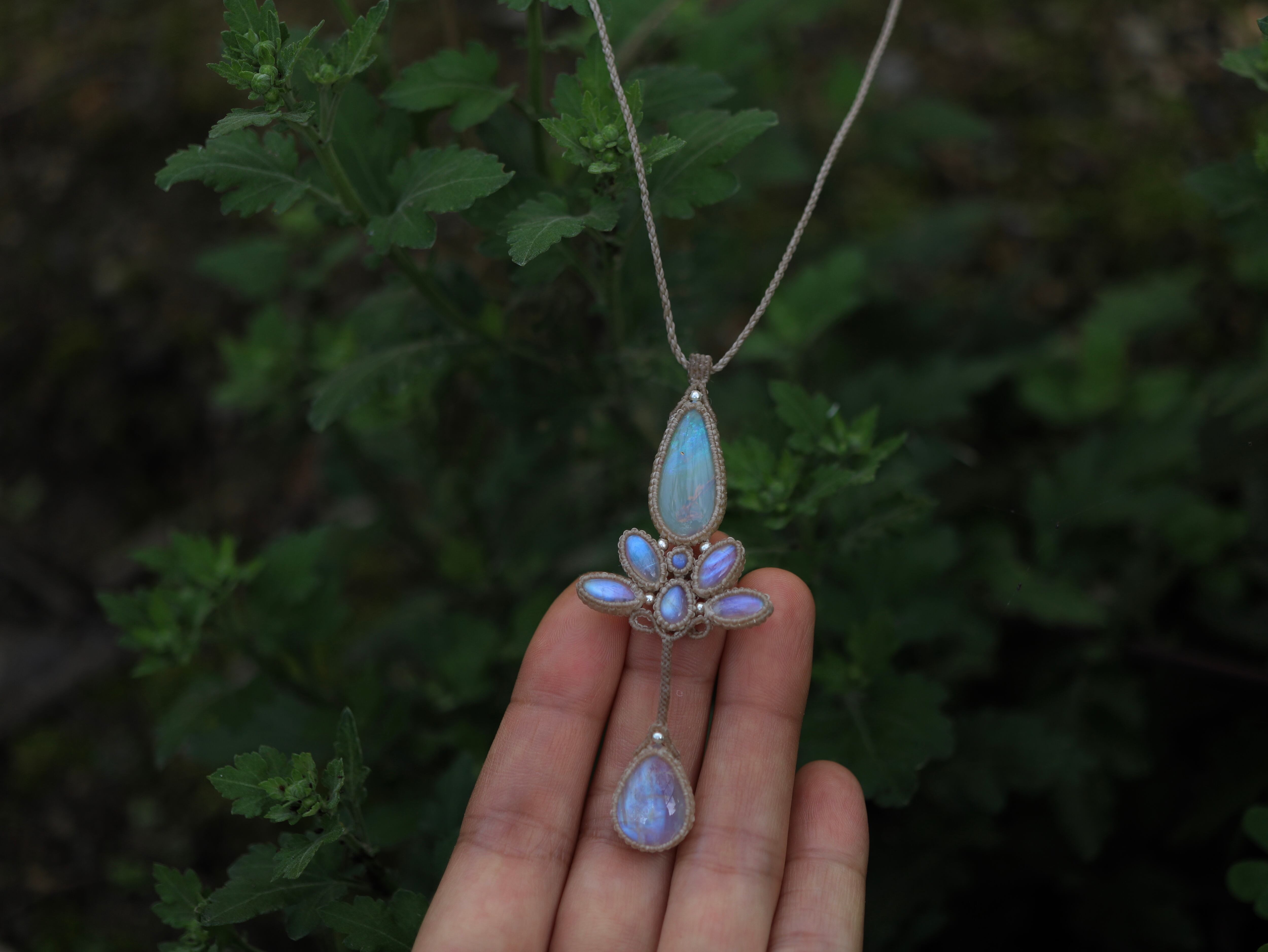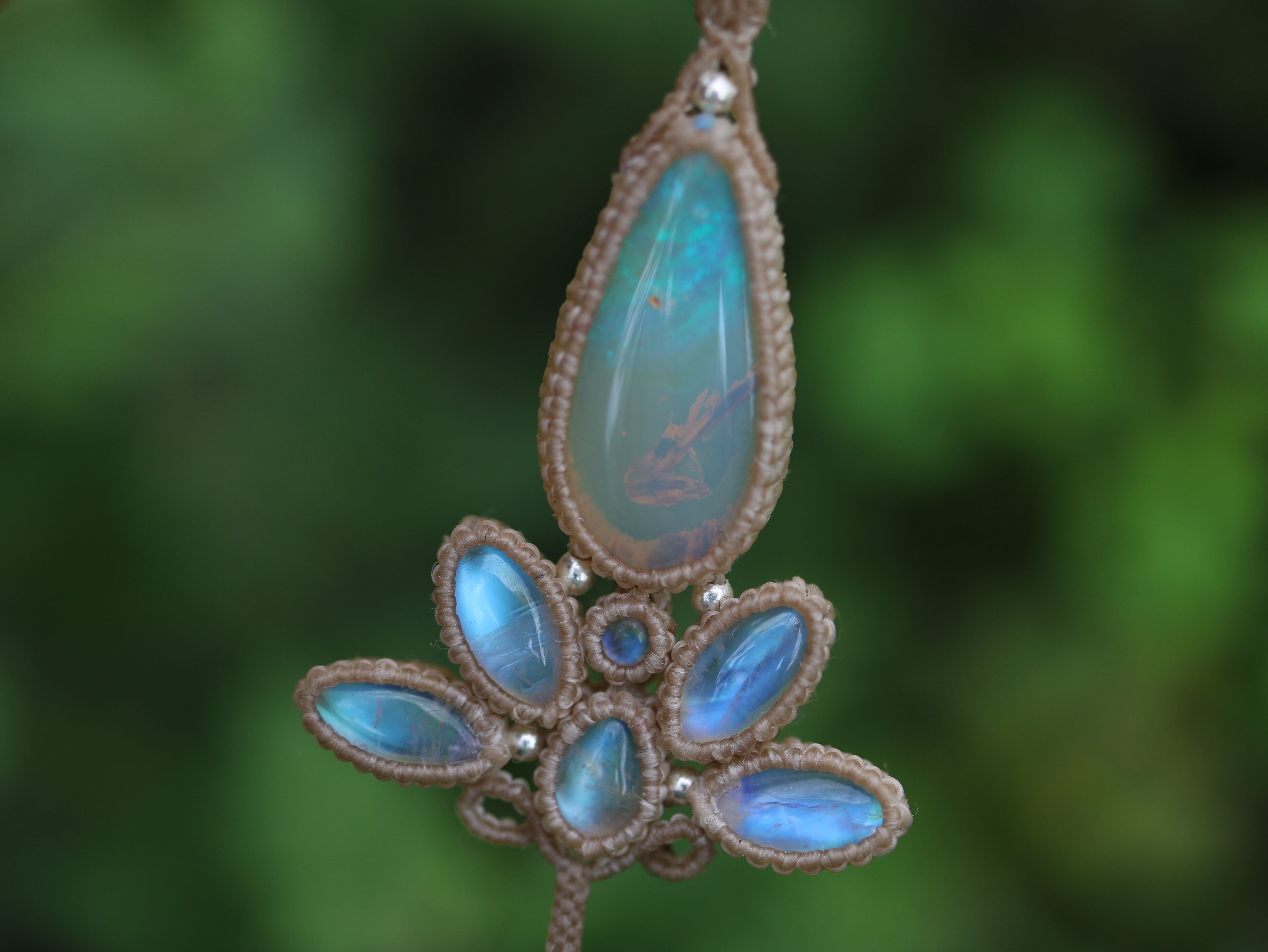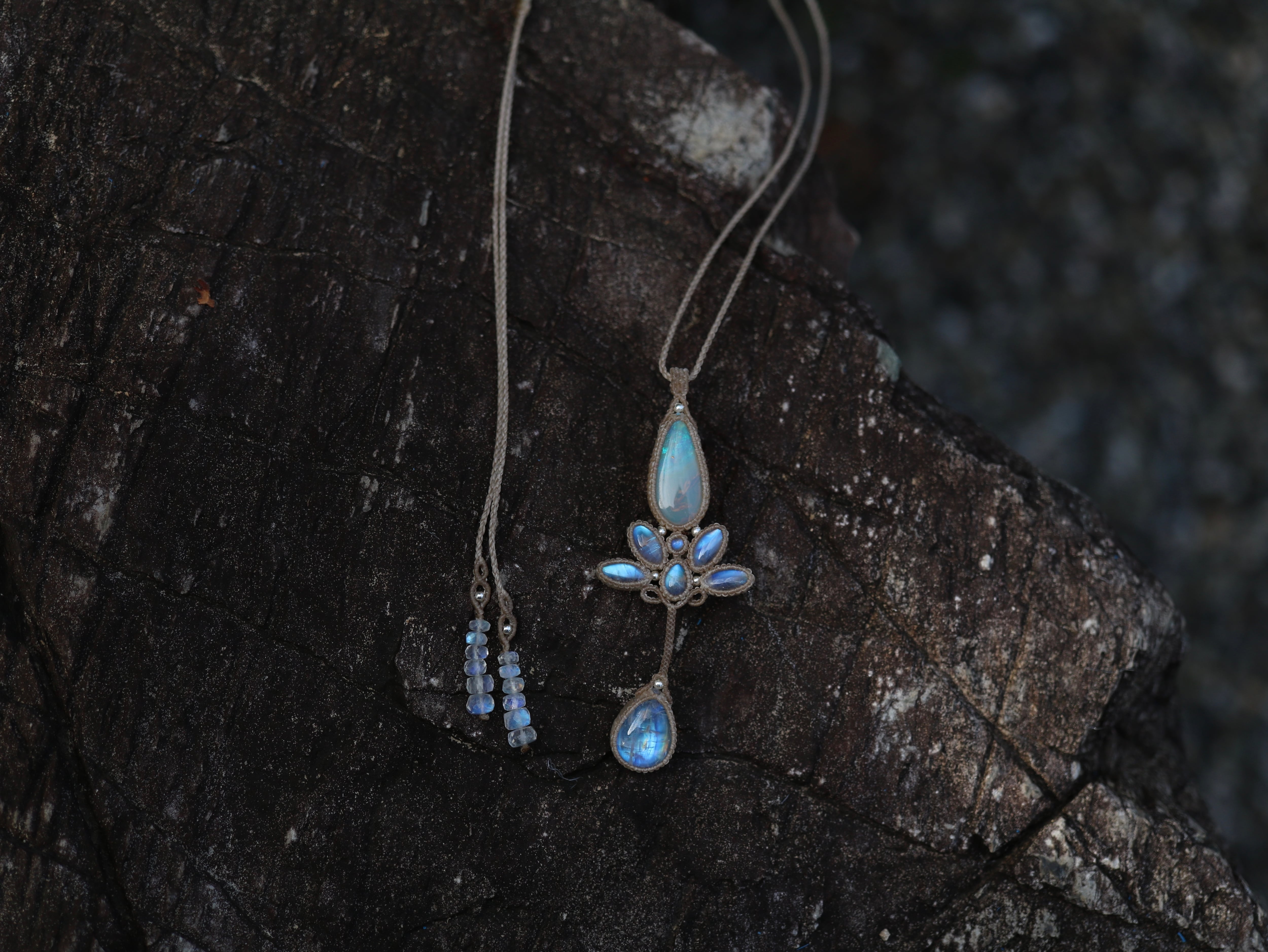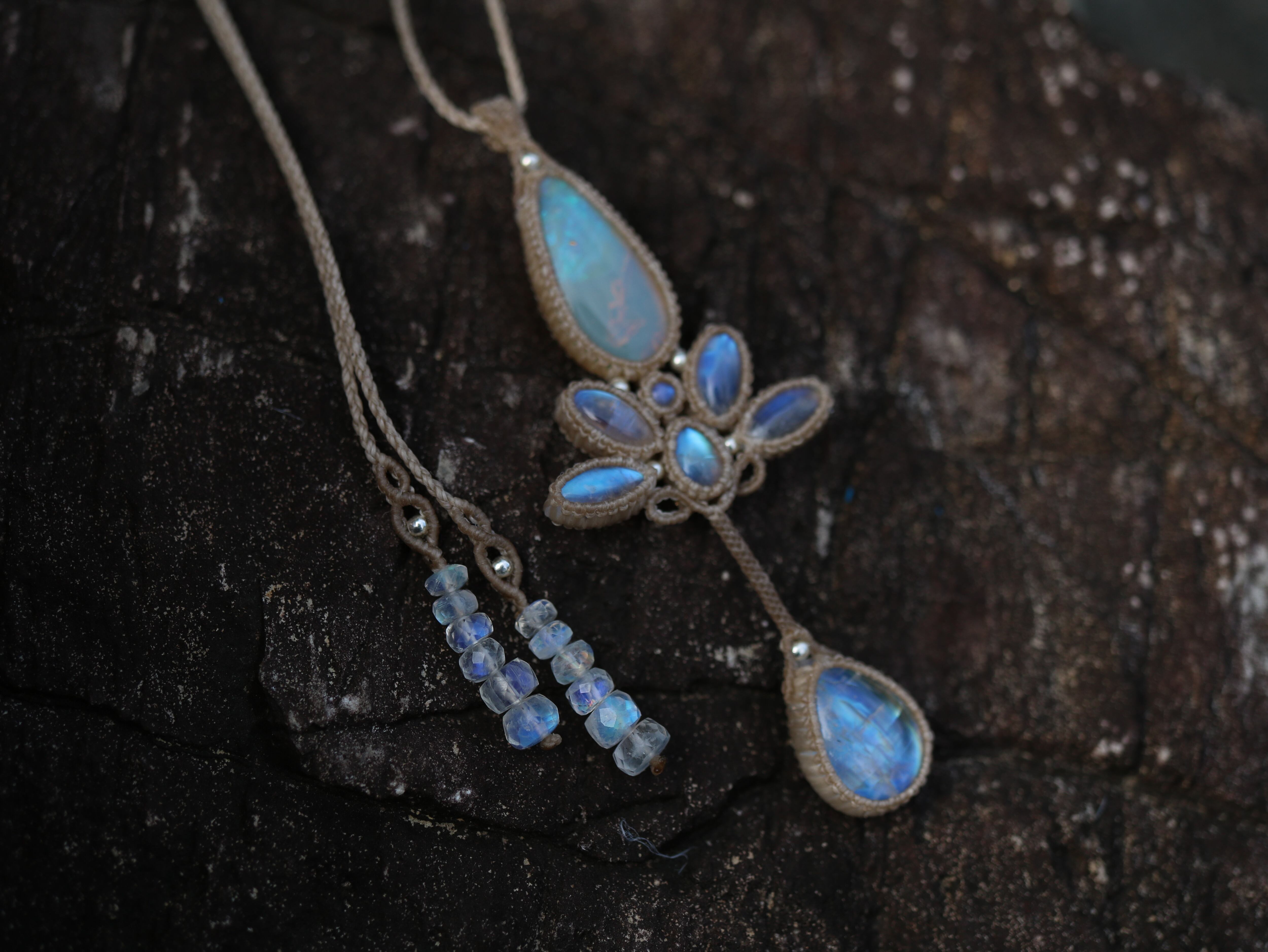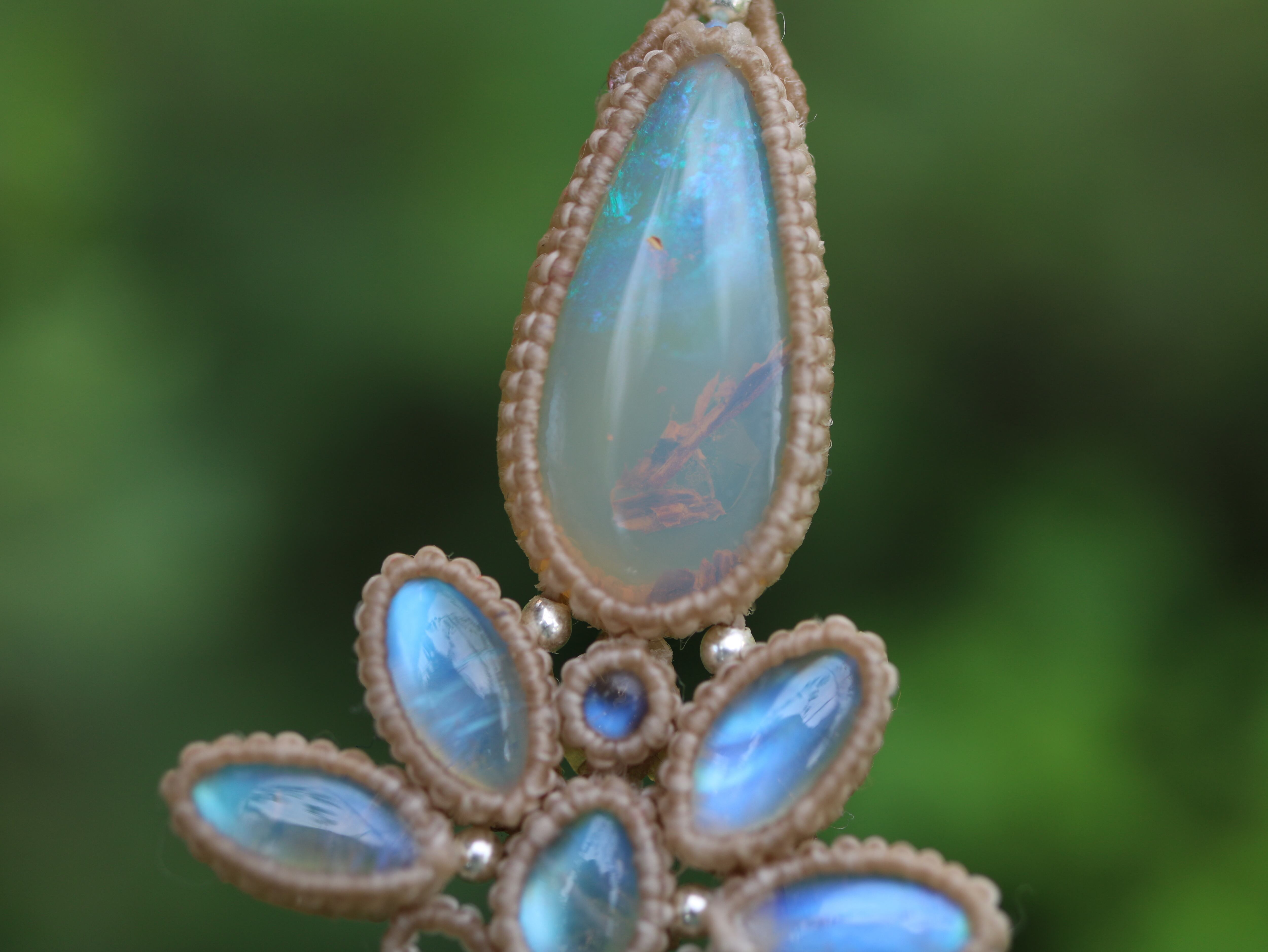 ※ 天然石を包むコードを始めトップ部分に使用したマクラメ編みコードは手縫い糸ほどの細いコードを使い、天然石の表情を引き立てるようひと目ひと目丁寧に編み上げています。