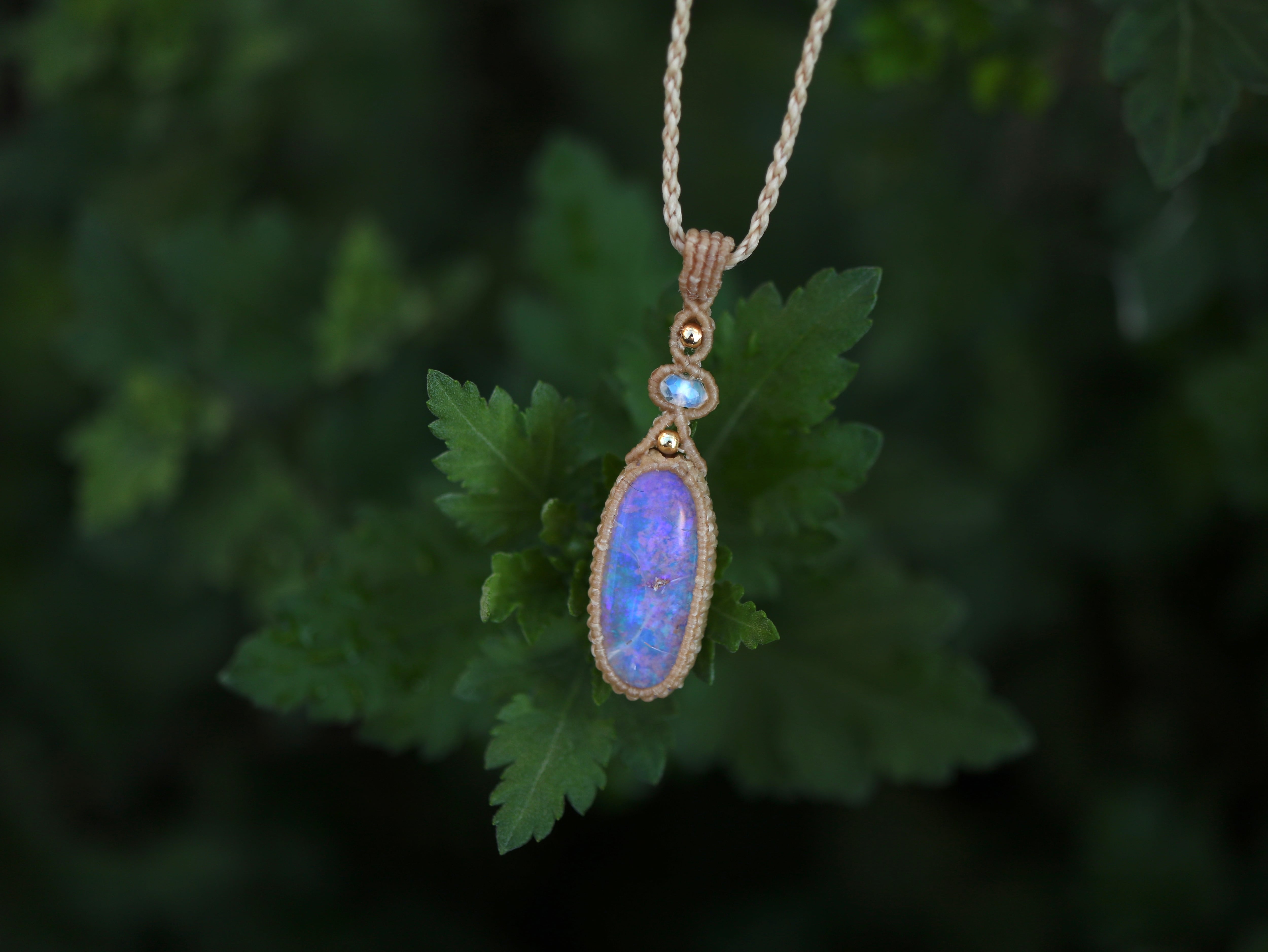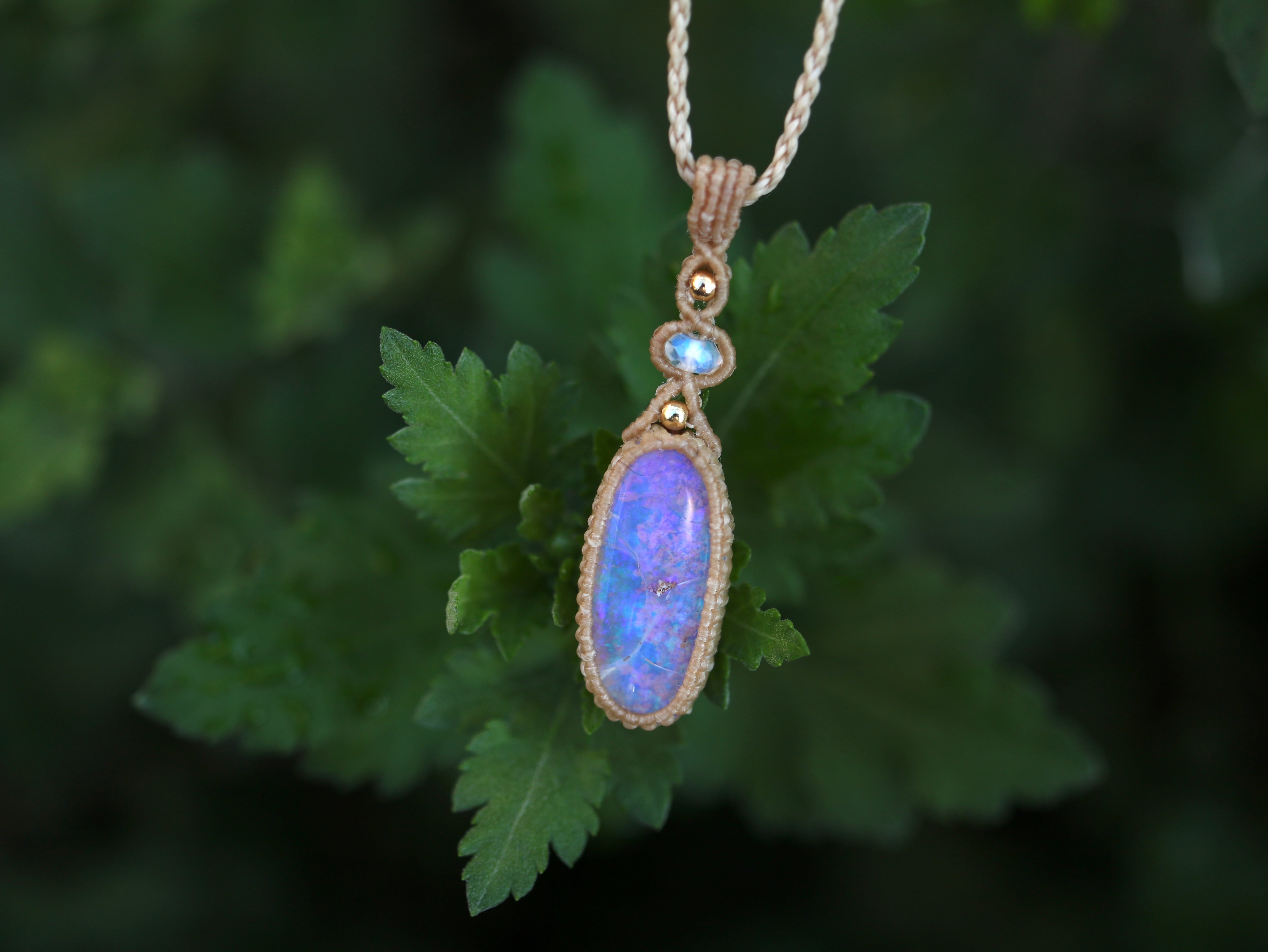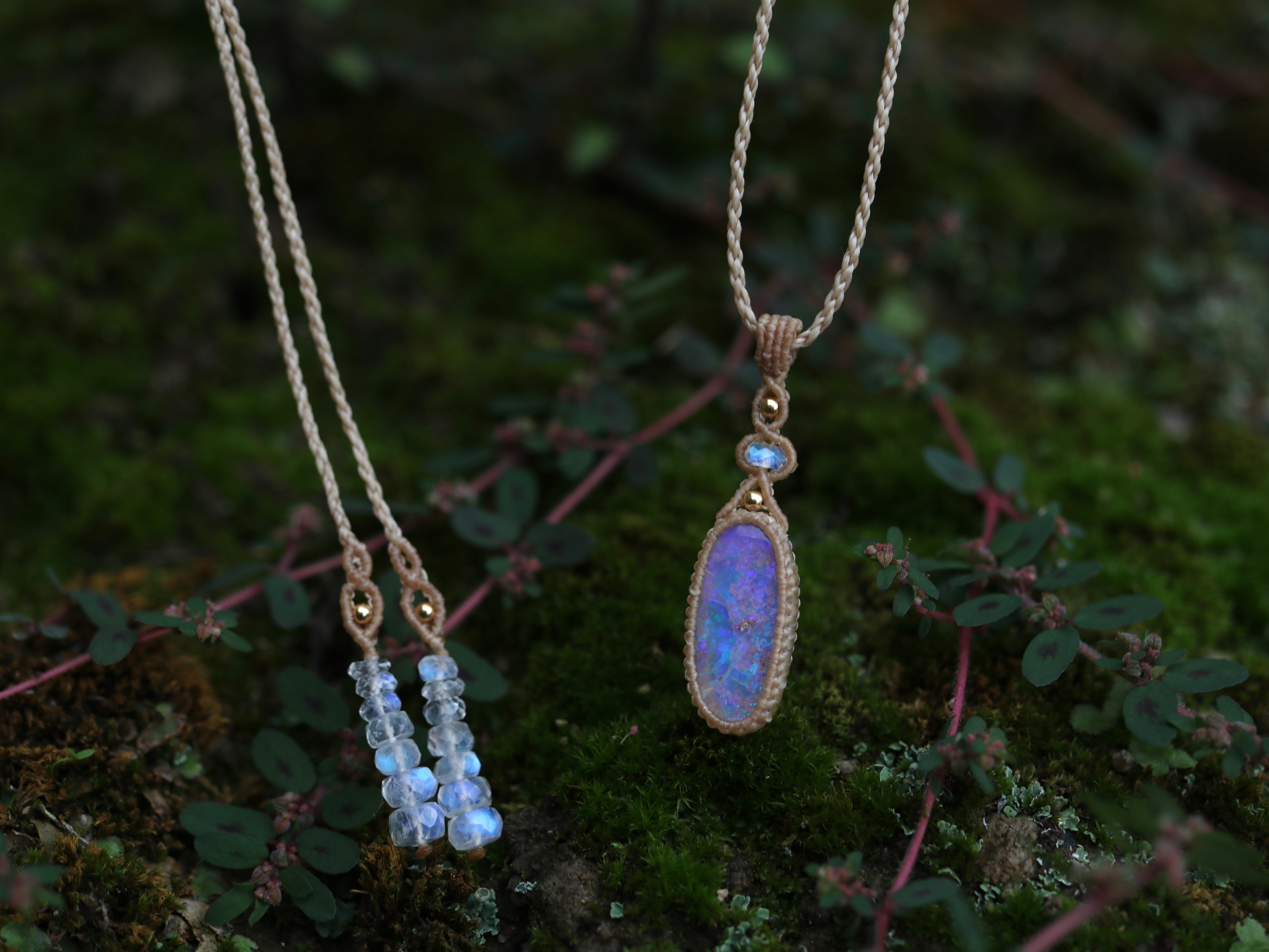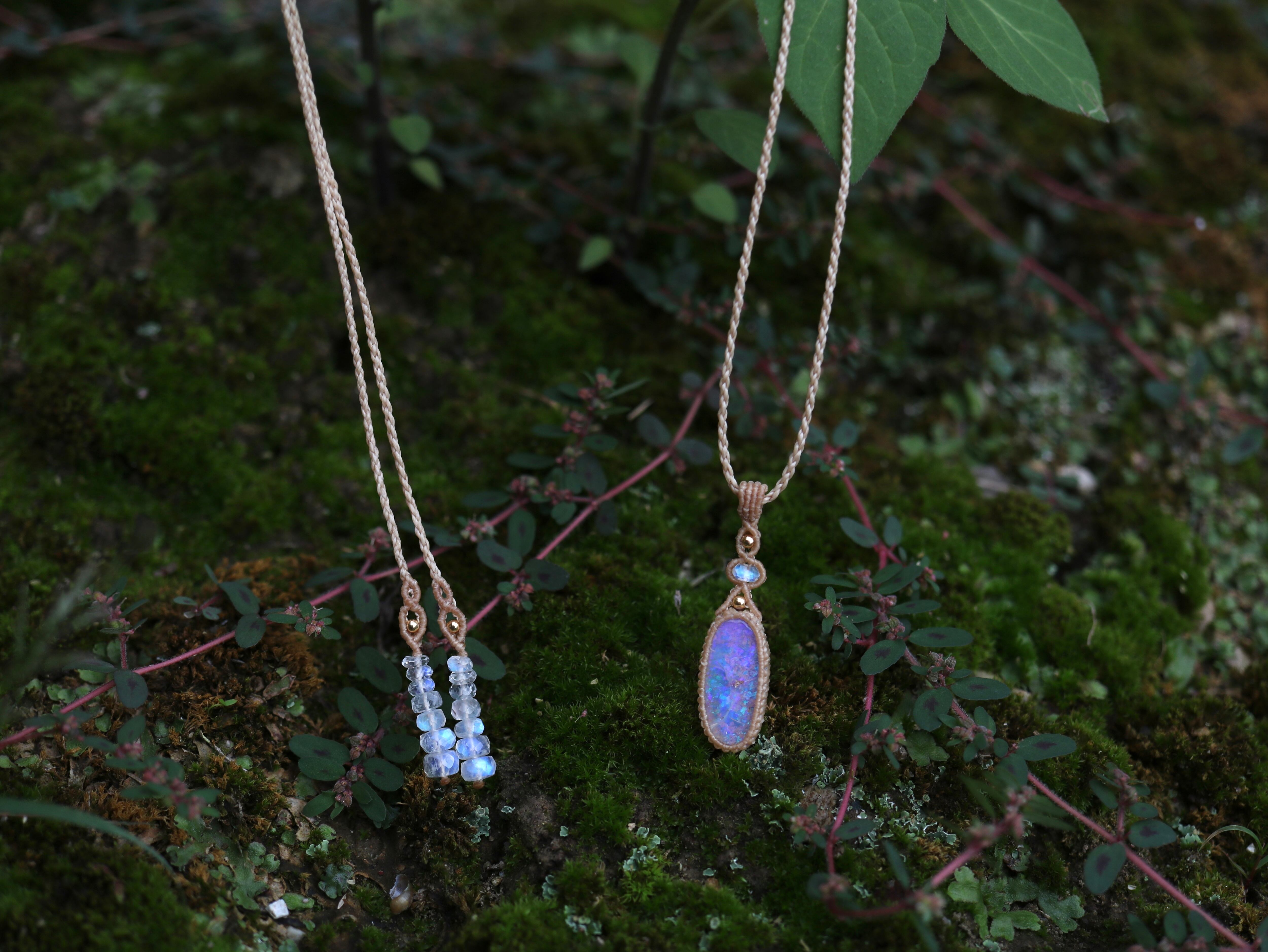 ※ 天然石を包むコードを始めトップ部分に使用したマクラメ編みコードは手縫い糸ほどの細いコードを使い、天然石の表情を引き立てるようひと目ひと目丁寧に編み上げています。