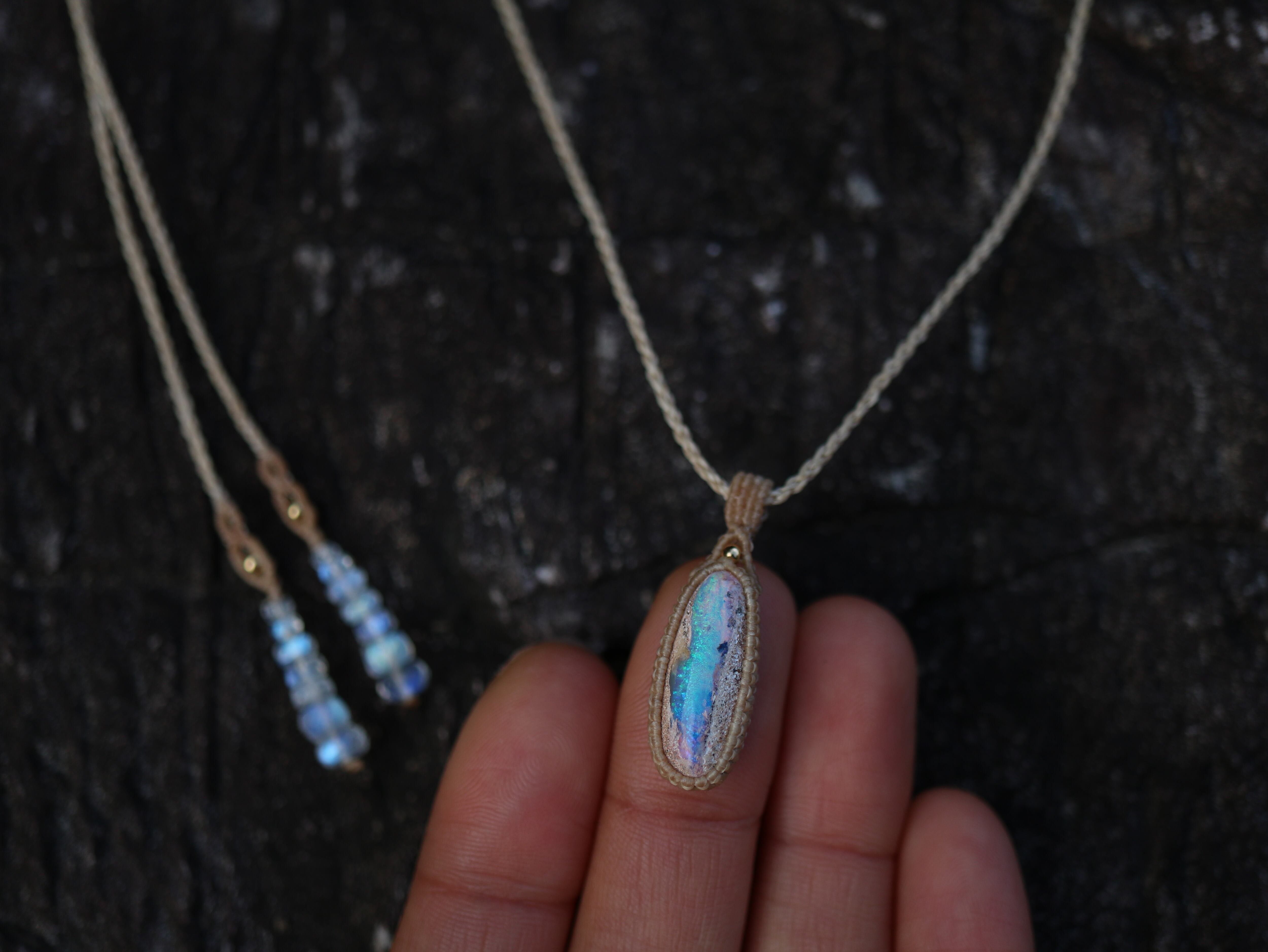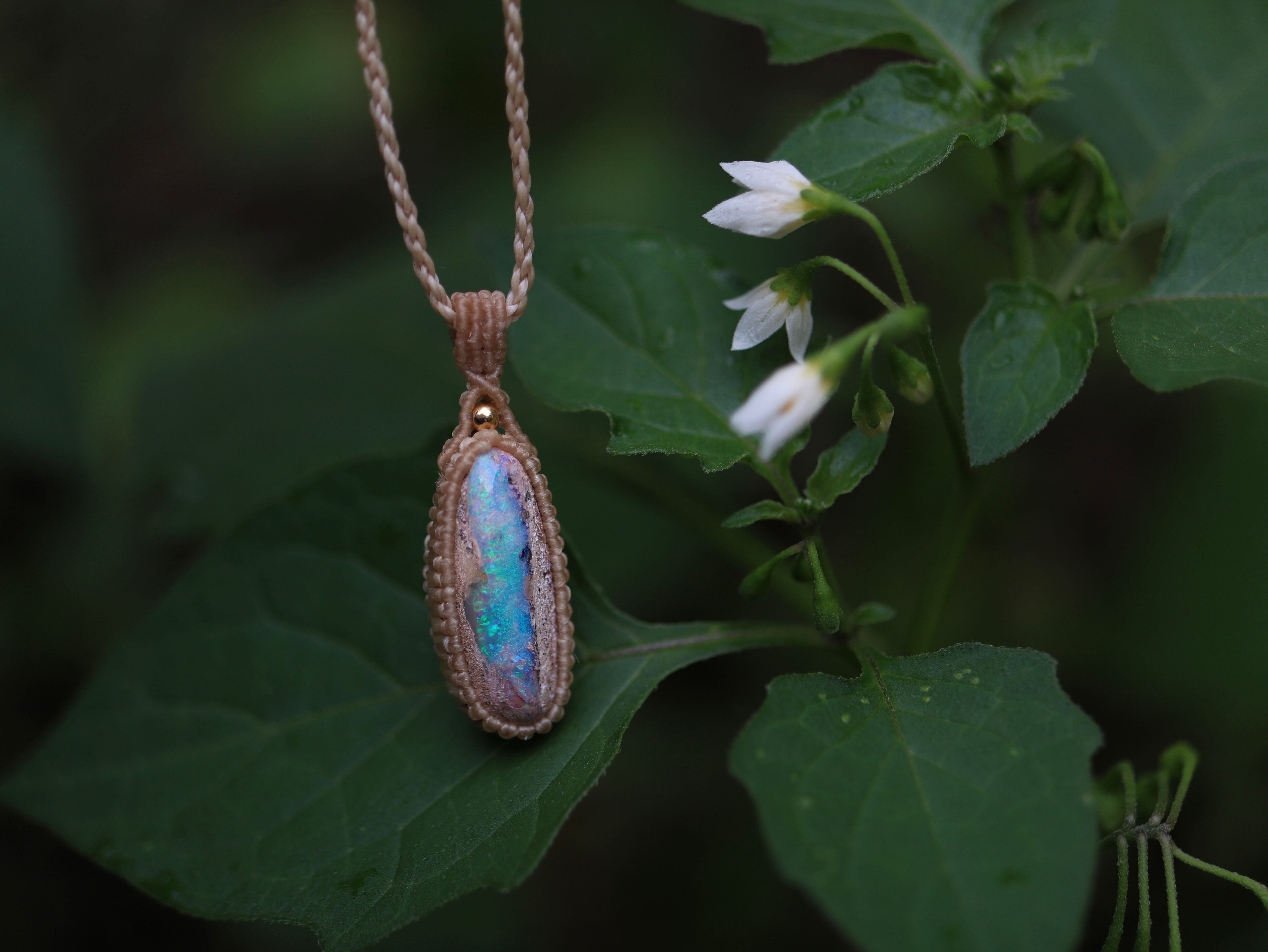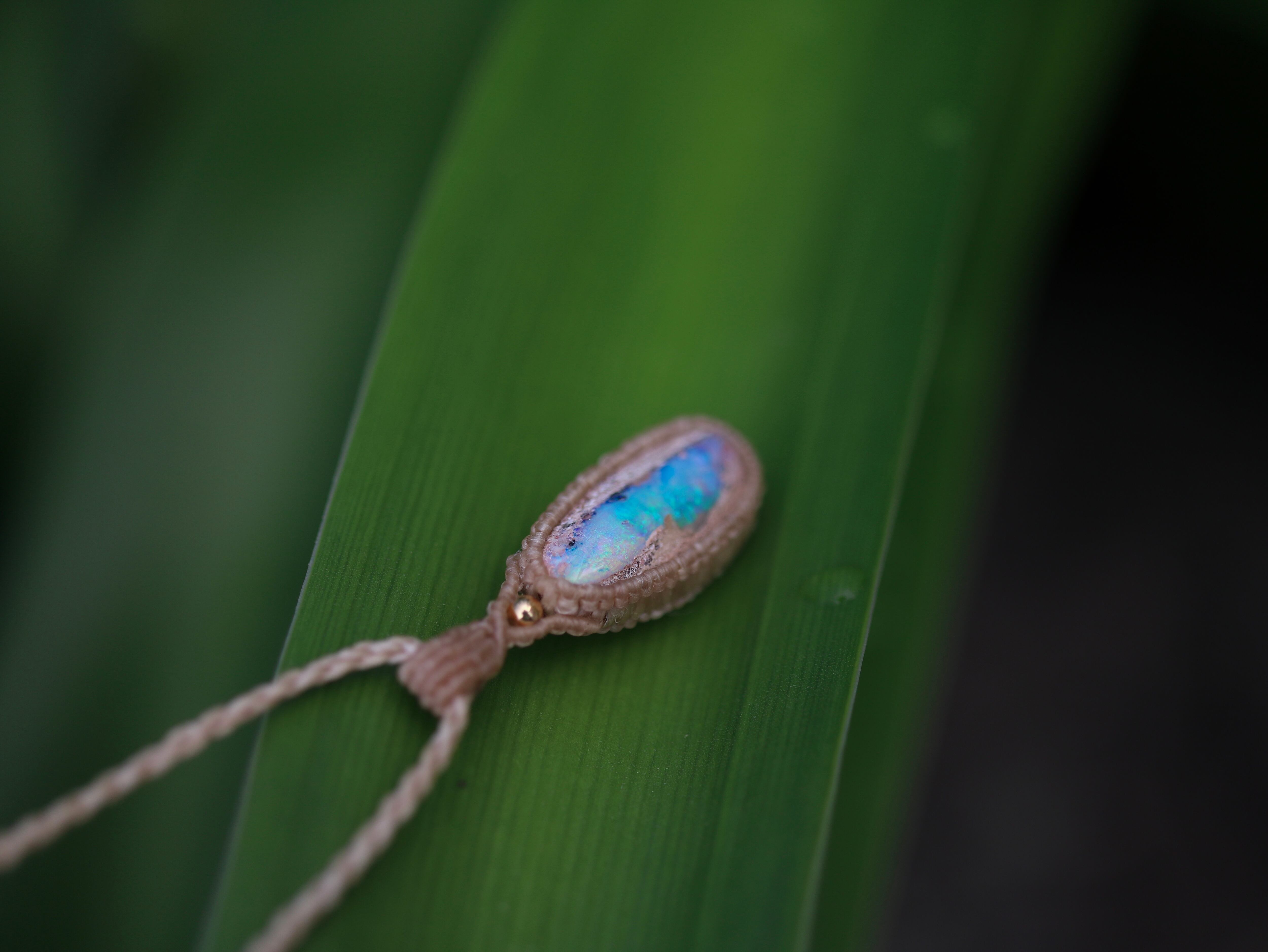 ※ 天然石を包むコードを始めトップ部分に使用したマクラメ編みコードは手縫い糸ほどの細いコードを使い、天然石の表情を引き立てるようひと目ひと目丁寧に編み上げています。