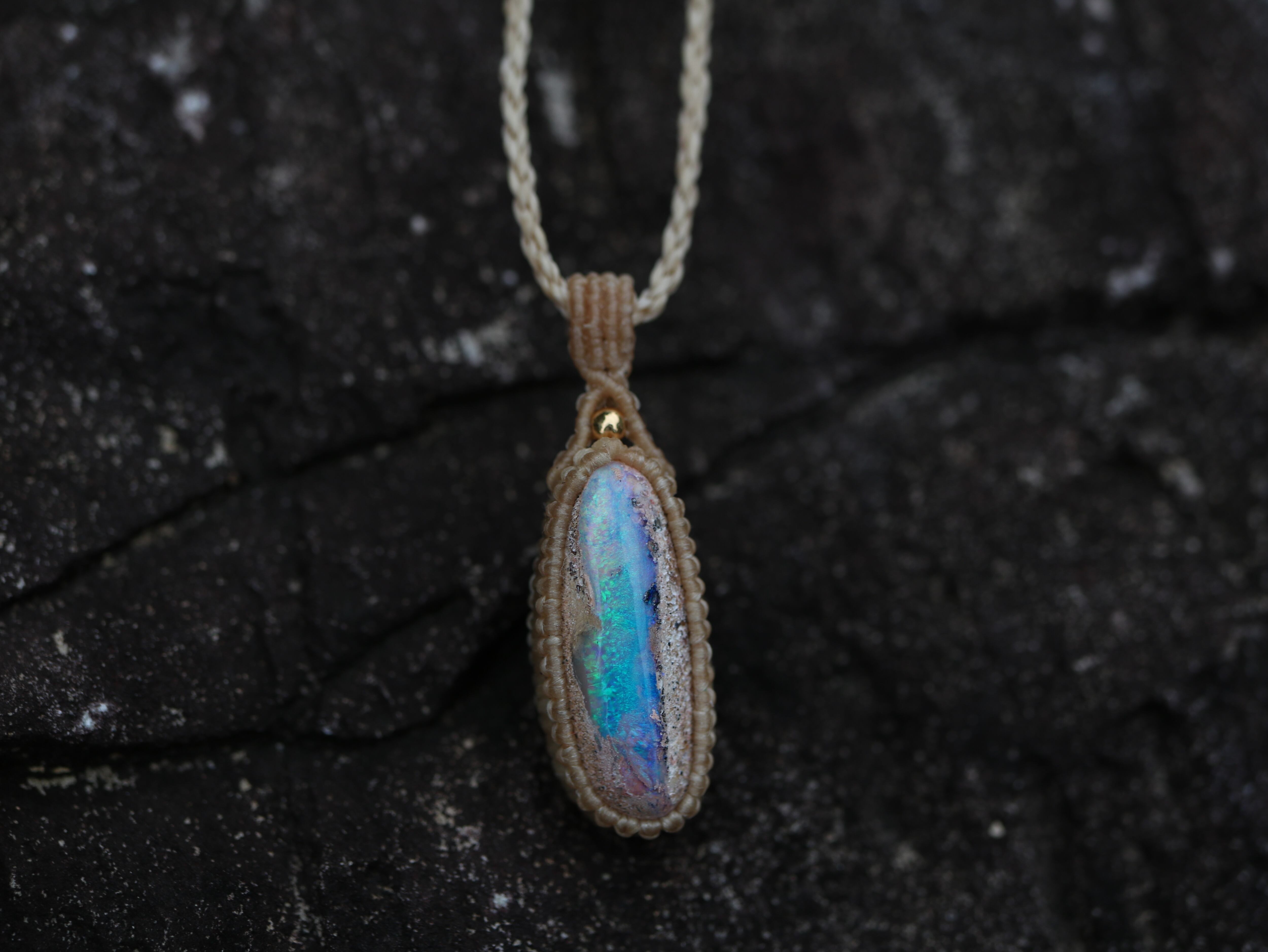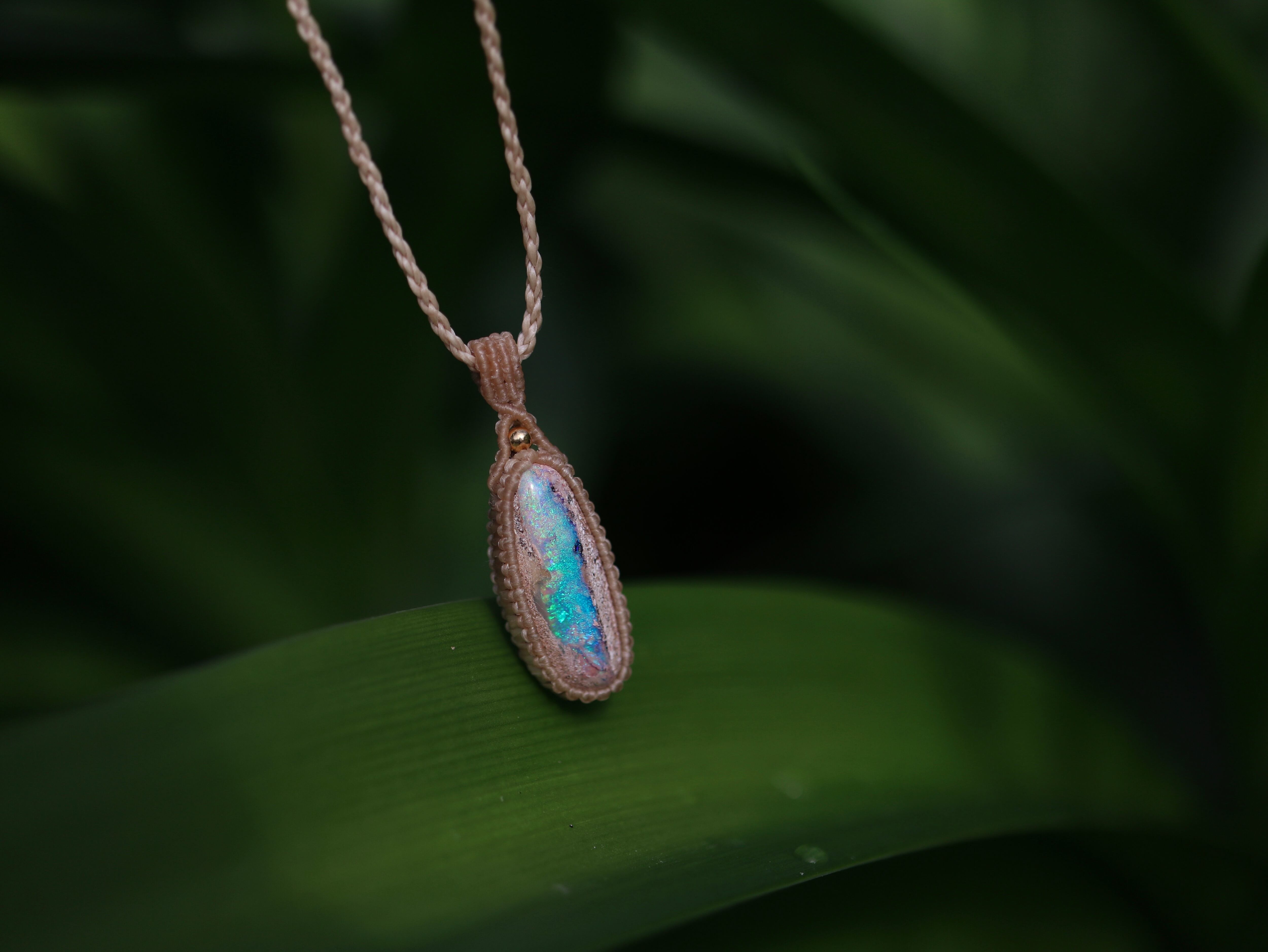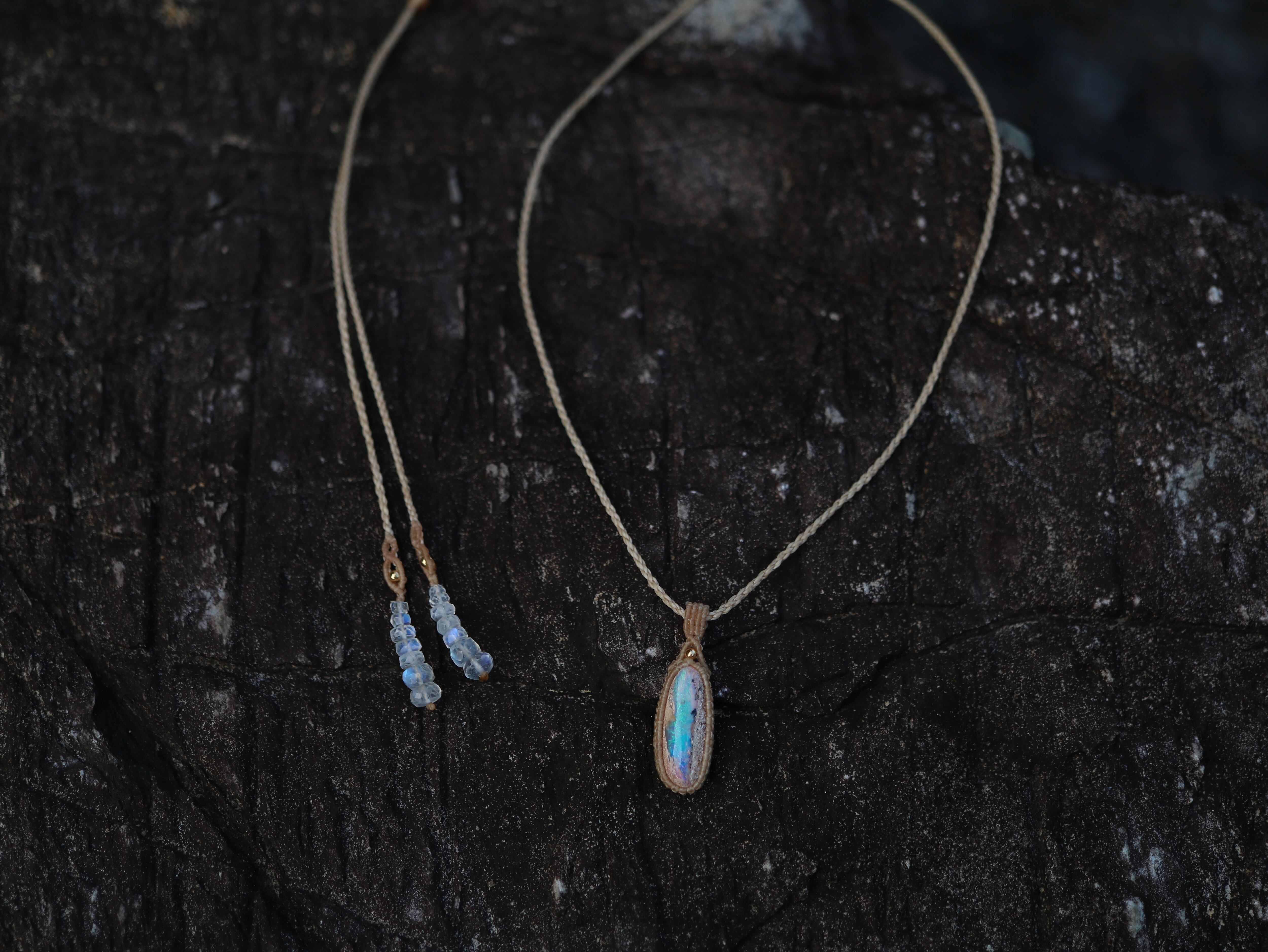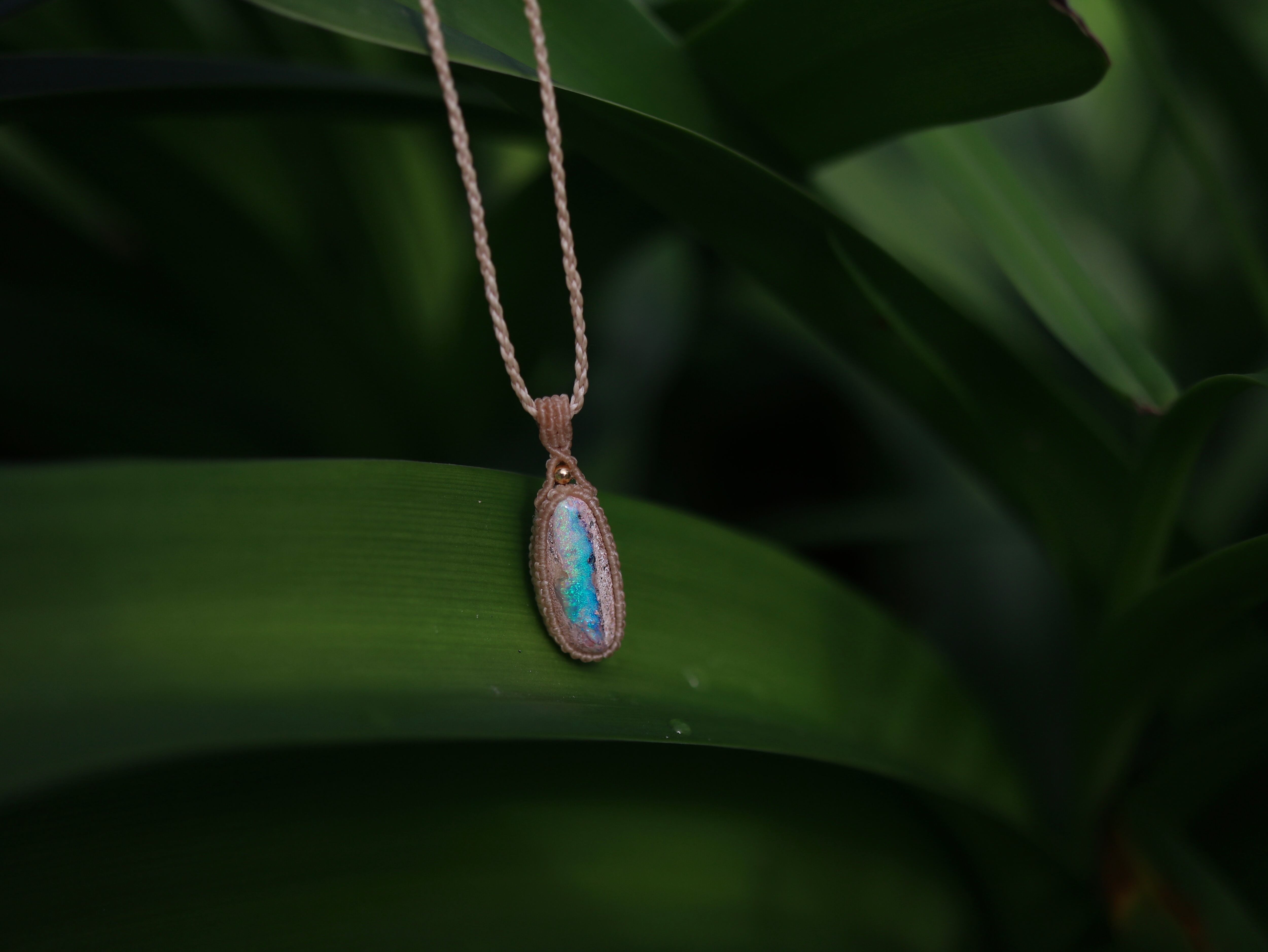 ※ 天然石を包むコードを始めトップ部分に使用したマクラメ編みコードは手縫い糸ほどの細いコードを使い、天然石の表情を引き立てるようひと目ひと目丁寧に編み上げています。