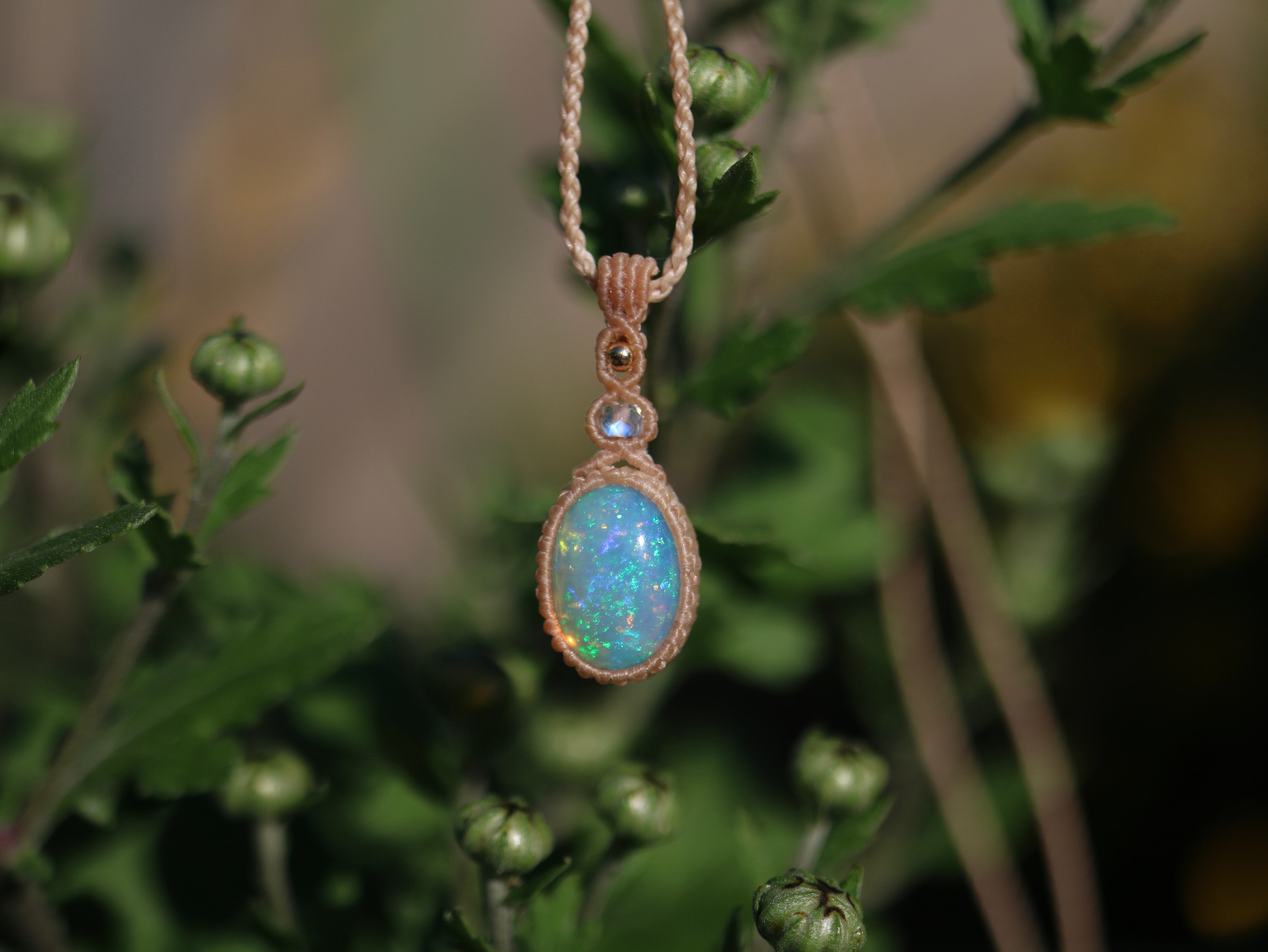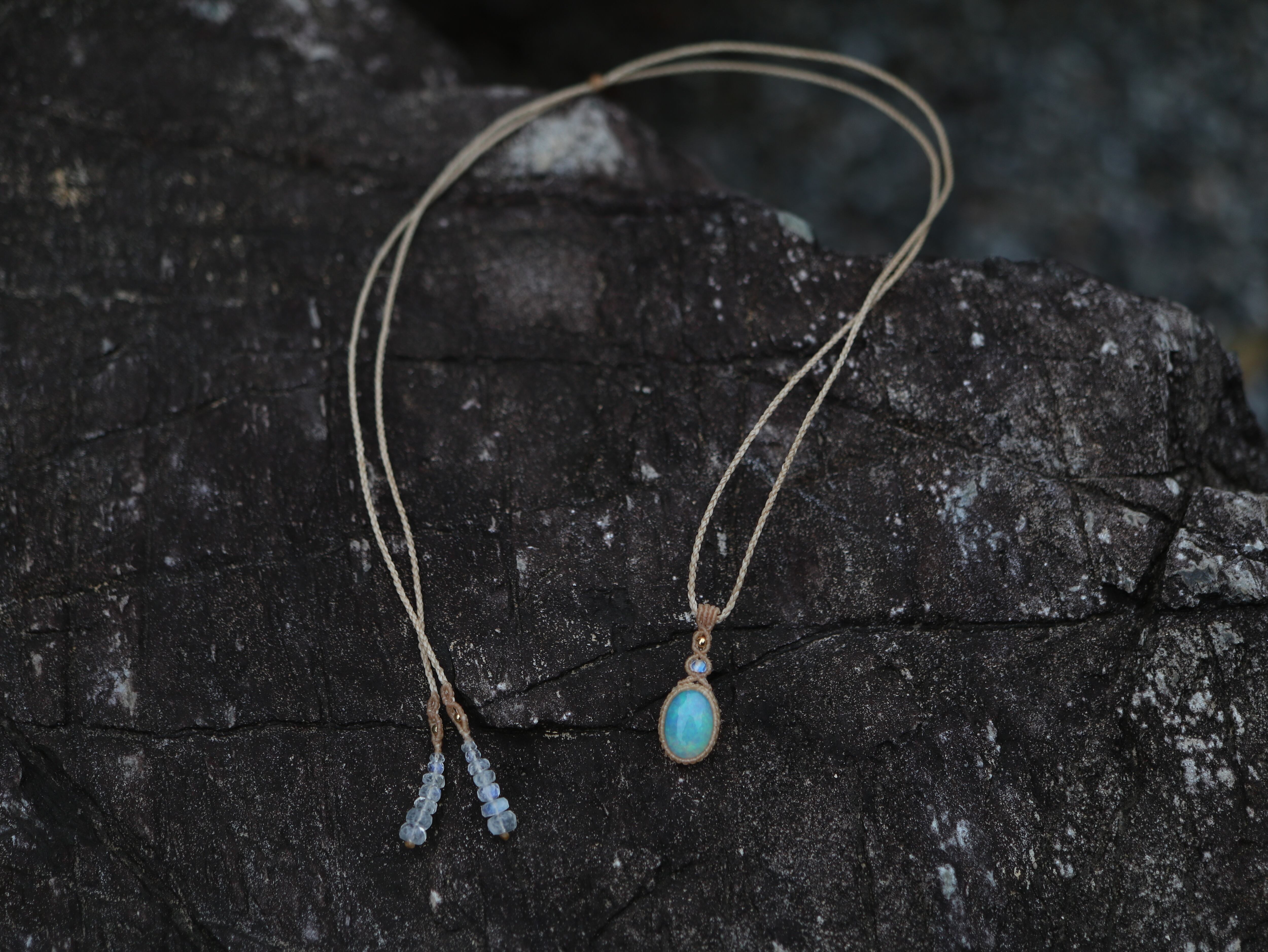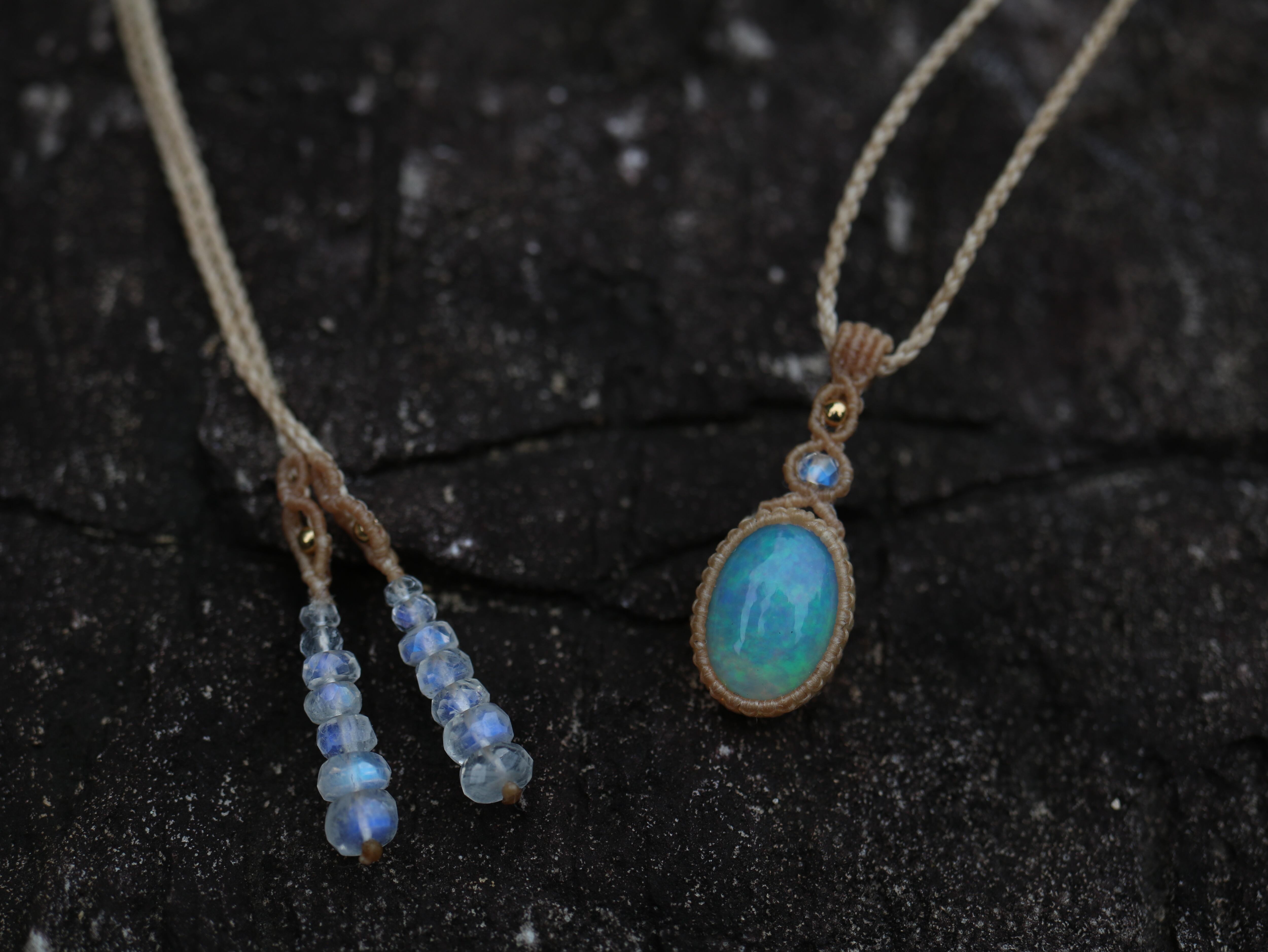 ※ 天然石を包むコードを始めトップ部分に使用したマクラメ編みコードは、手縫い糸ほどの細いコードを使い、天然石の表情を引き立てるようひと目ひと目丁寧に編み上げています。