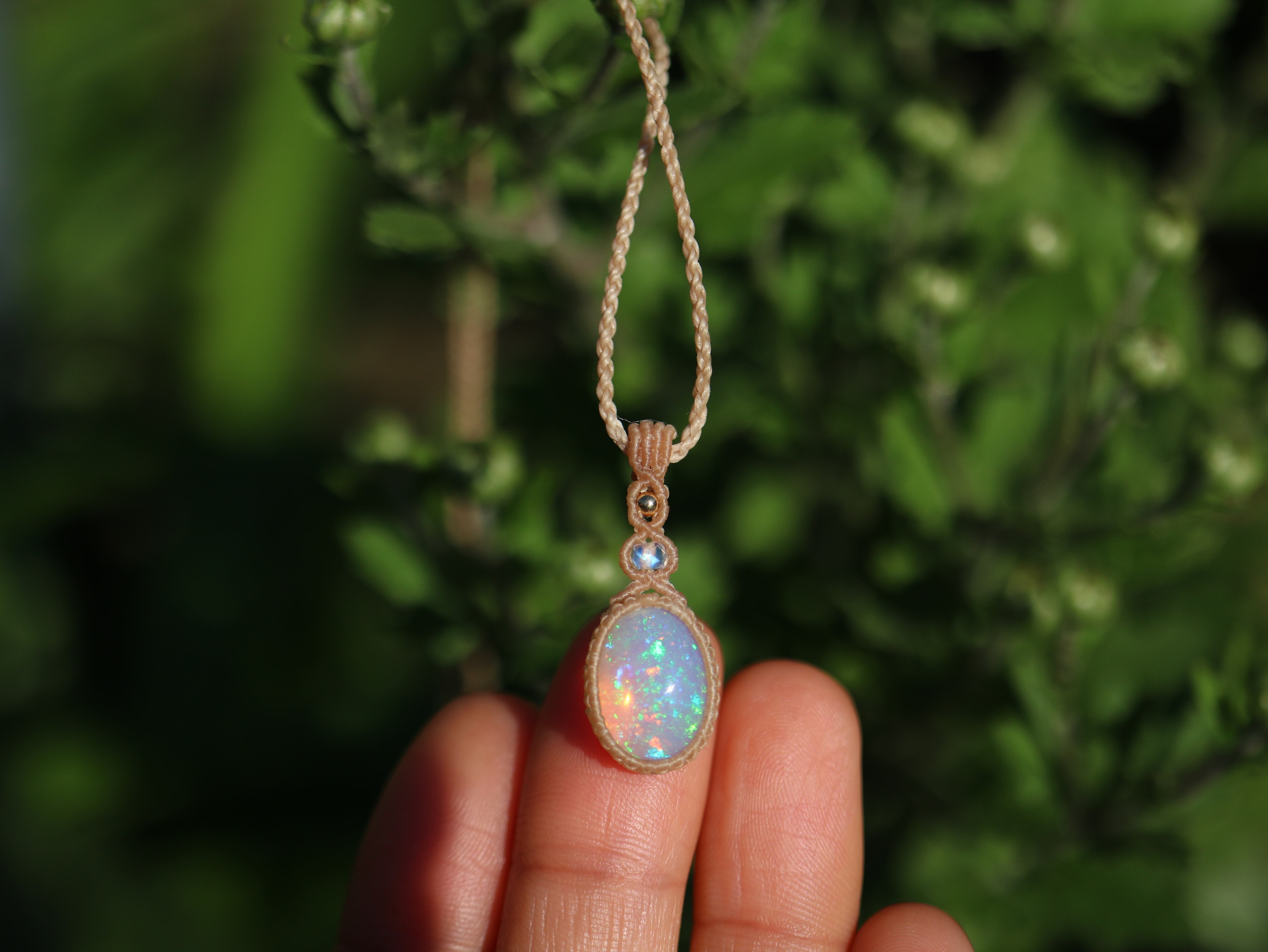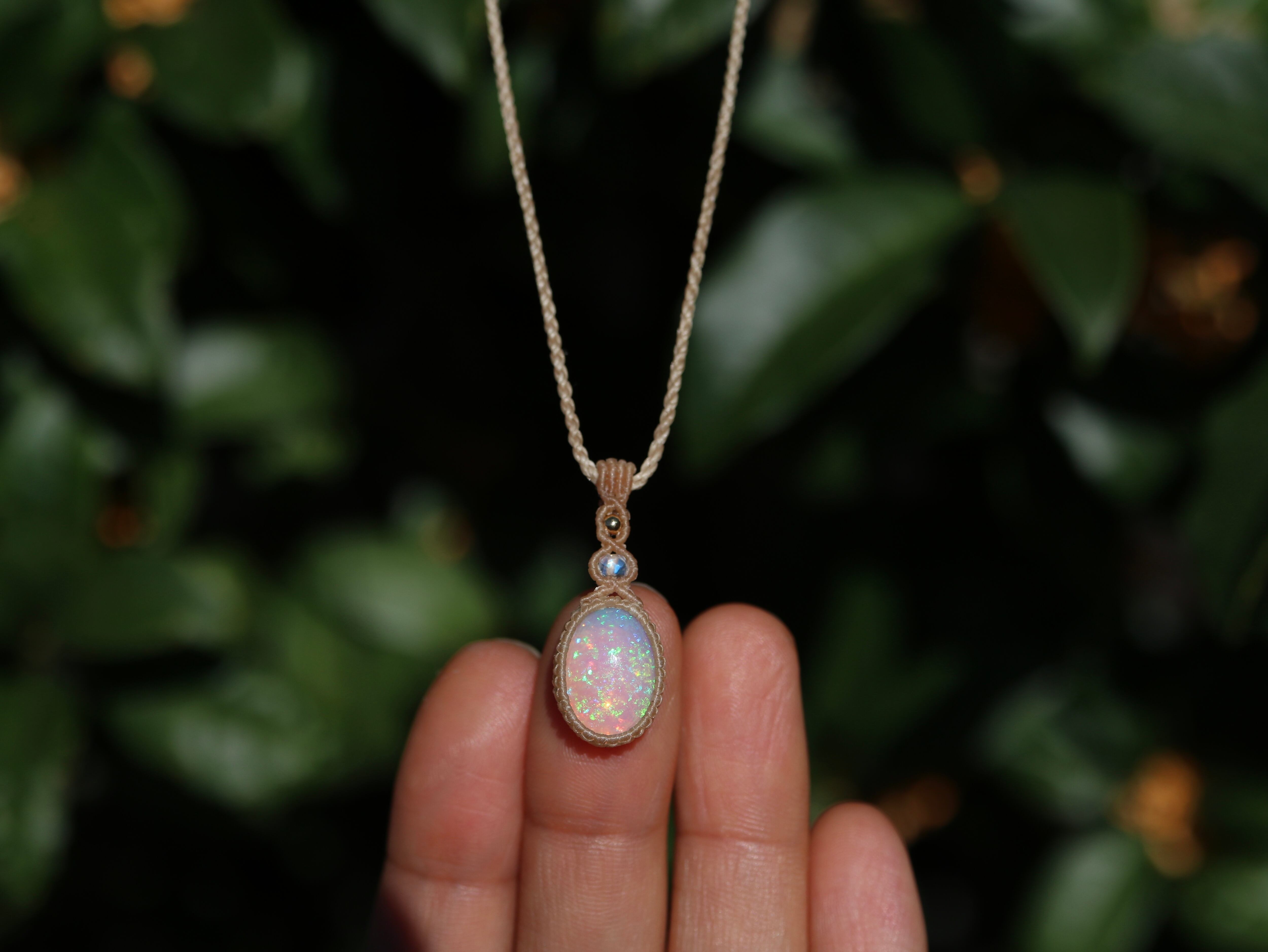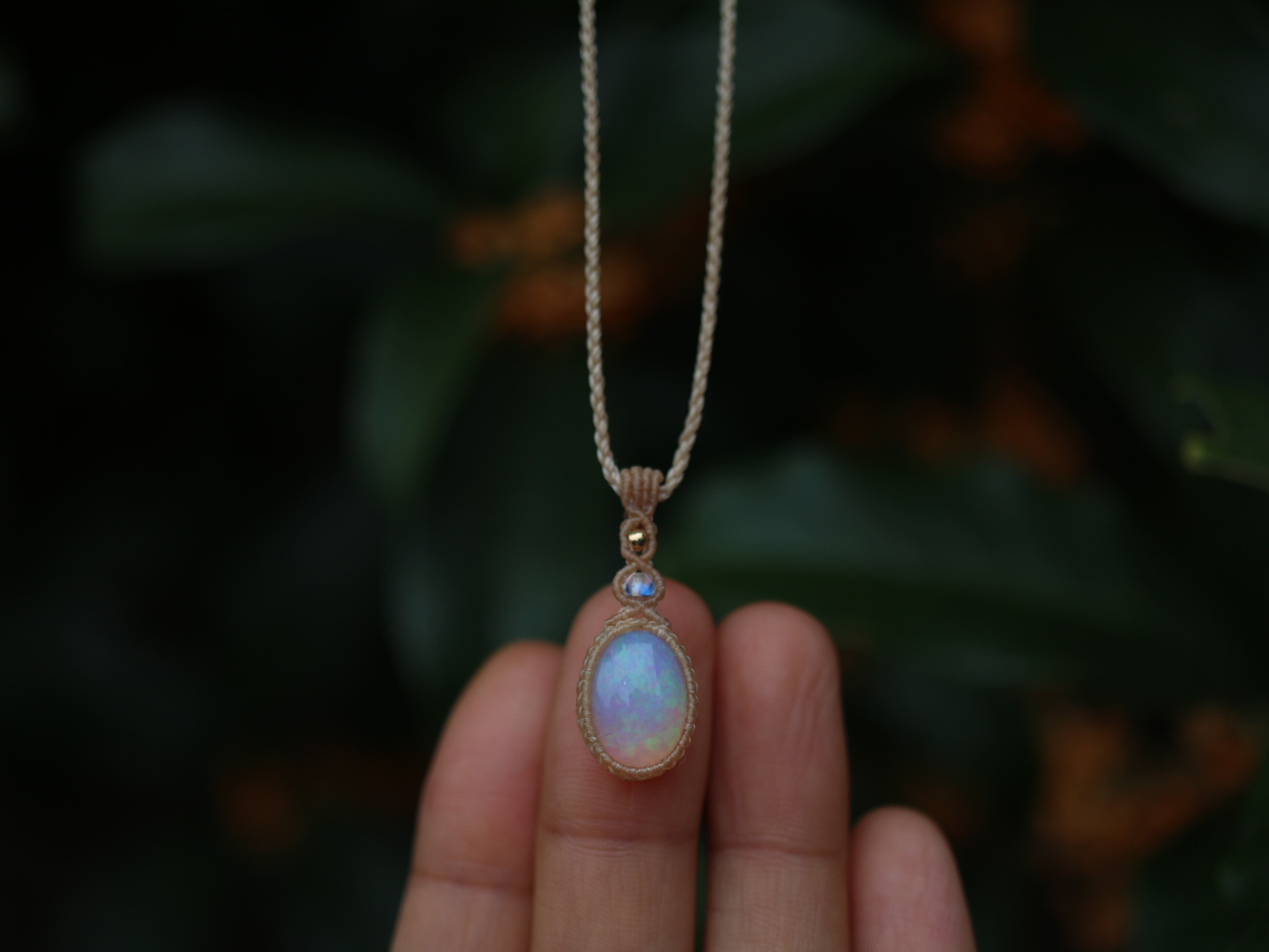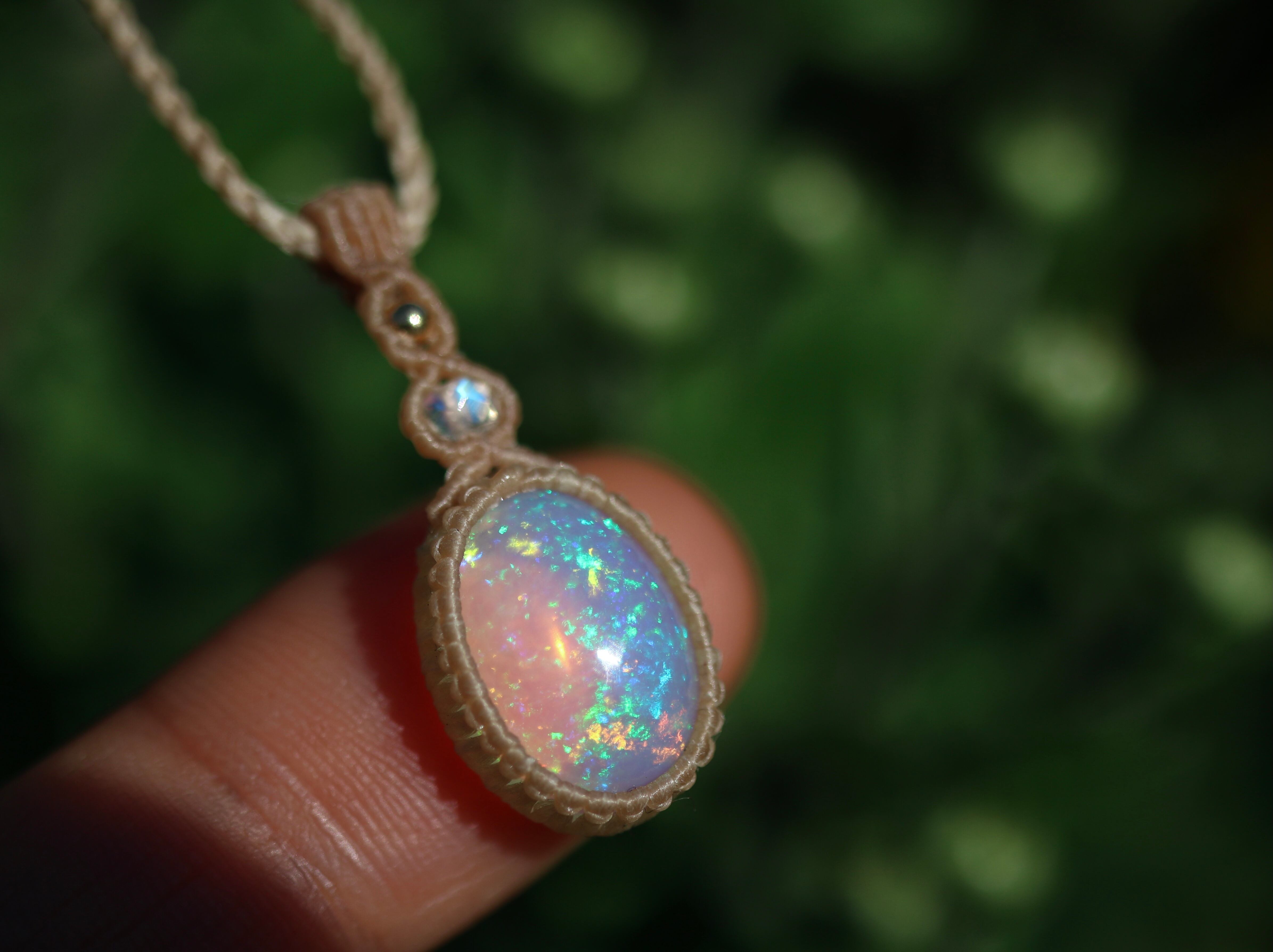 ※ 天然石を包むコードを始めトップ部分に使用したマクラメ編みコードは、手縫い糸ほどの細いコードを使い、天然石の表情を引き立てるようひと目ひと目丁寧に編み上げています。