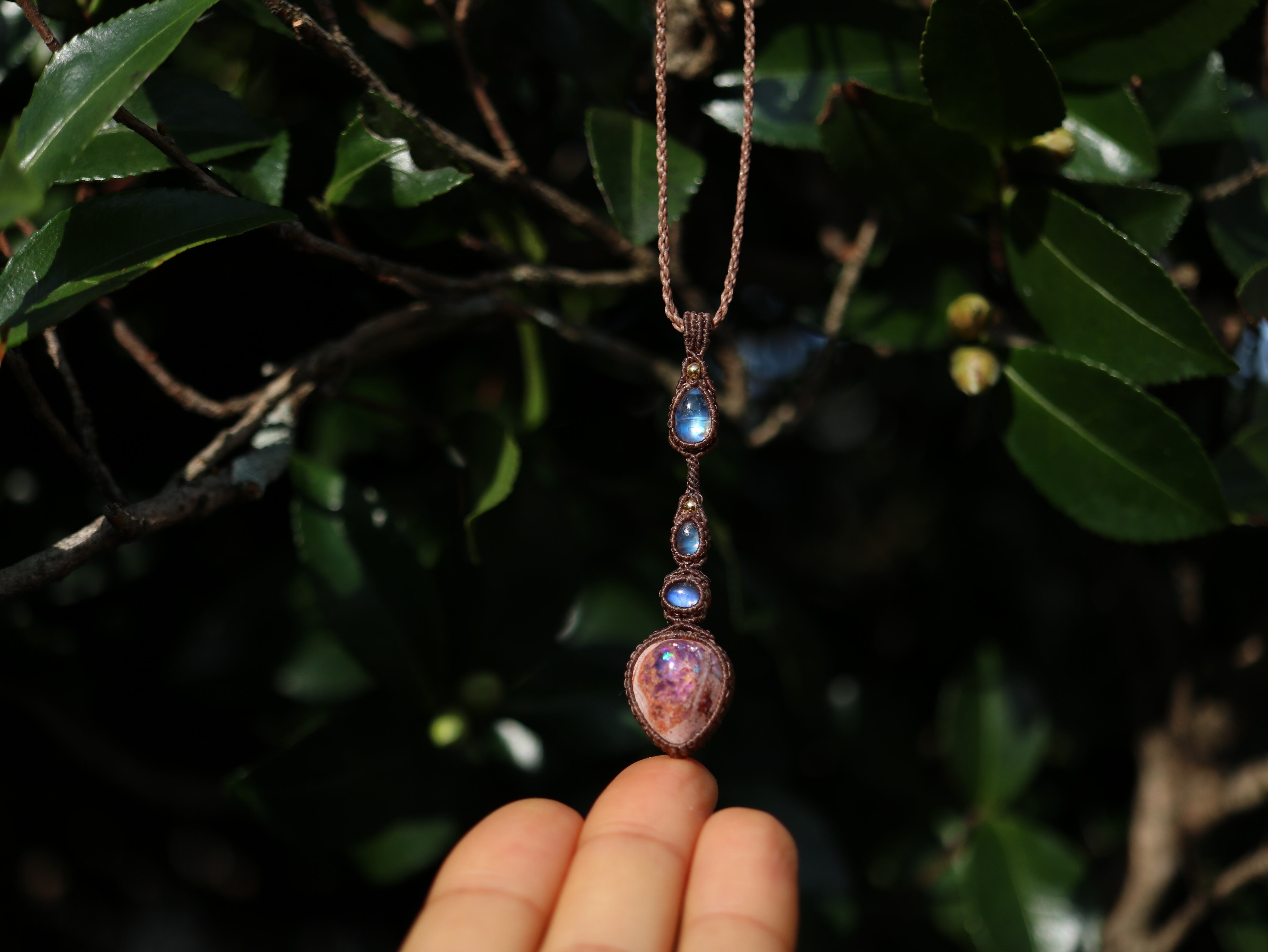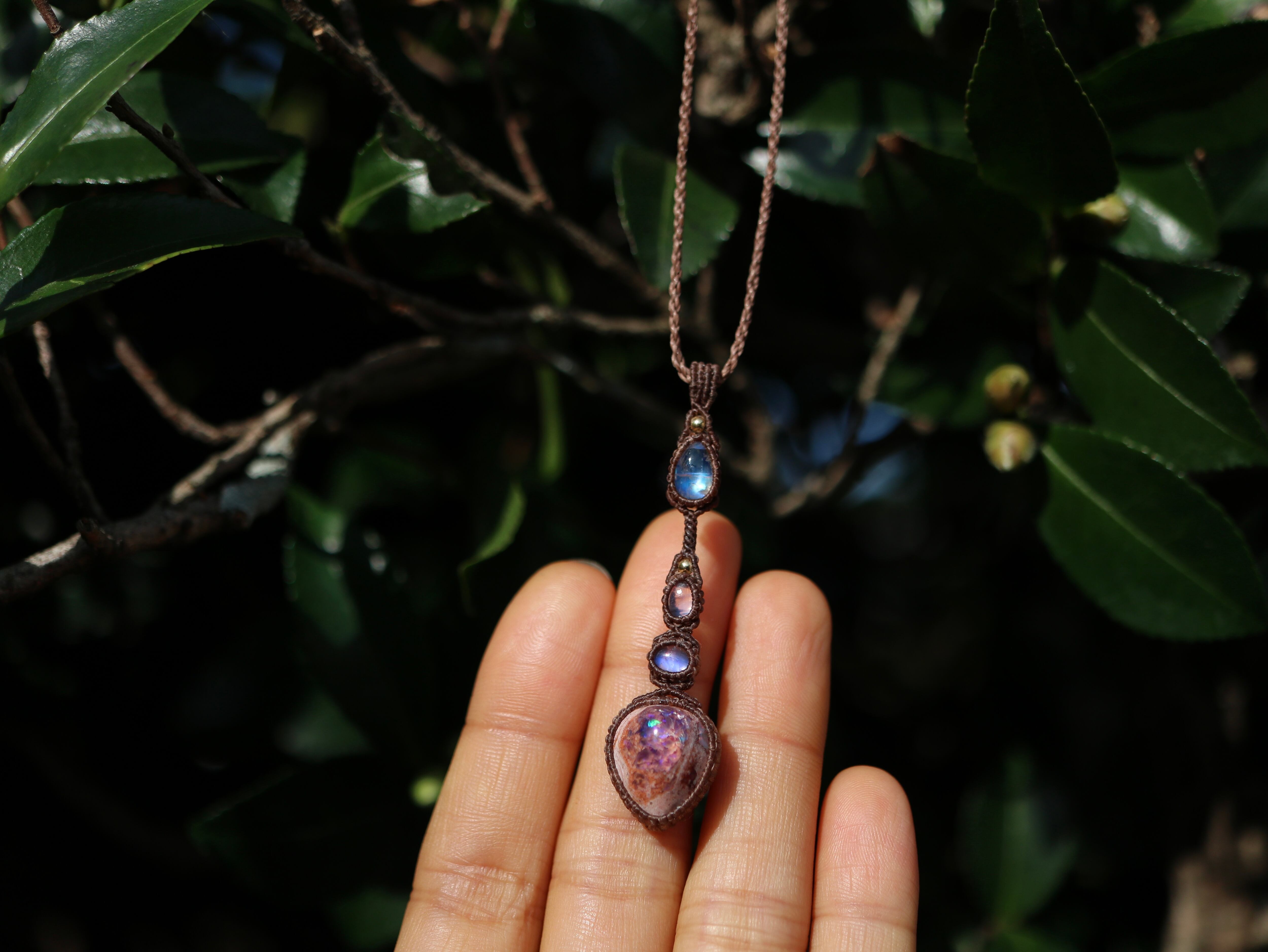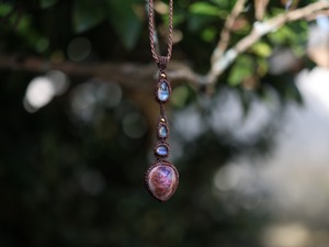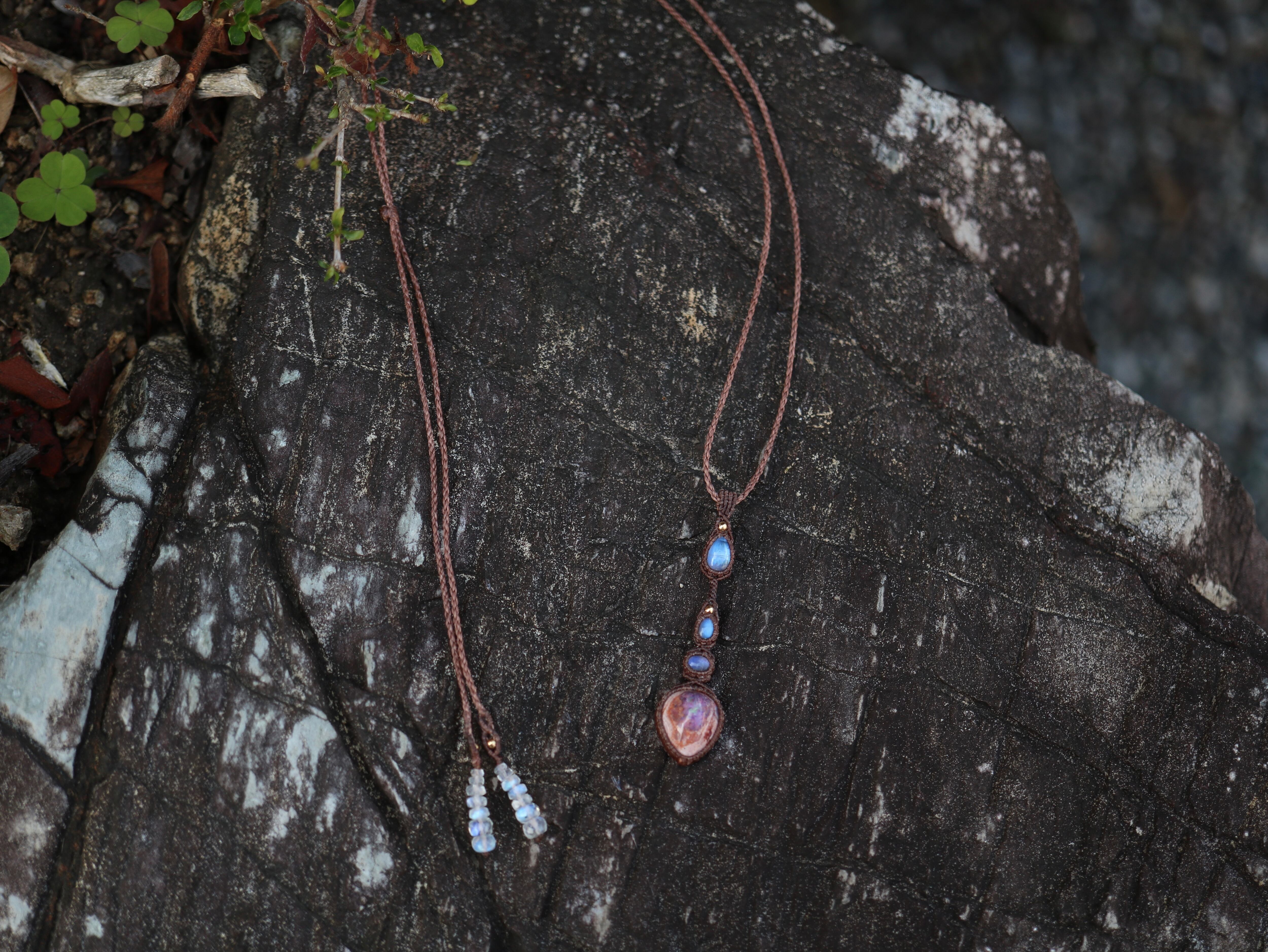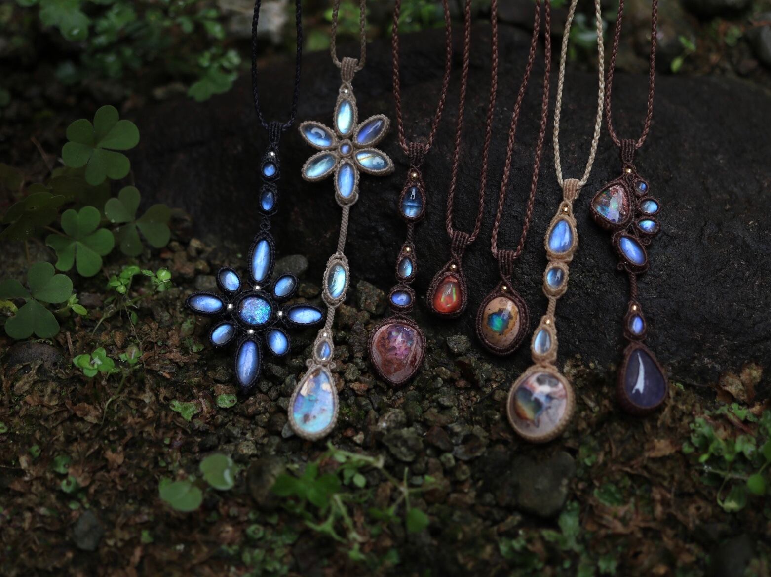 ※ 天然石を包むコードを始めトップ部分に使用したマクラメ編みコードは手縫い糸ほどの細いコードを使い、天然石の表情を引き立てるよう、ひと目ひと目丁寧に編み上げています。