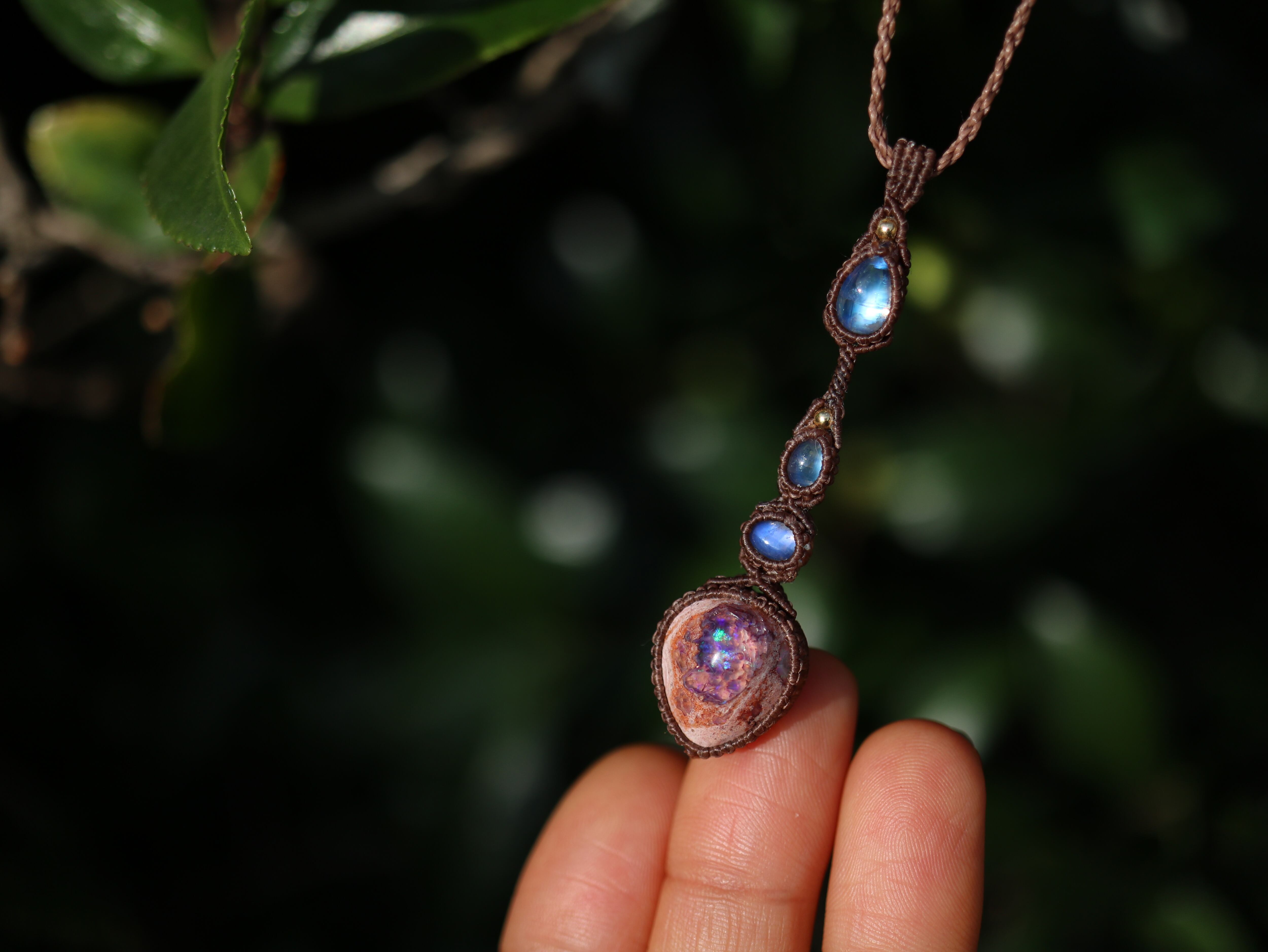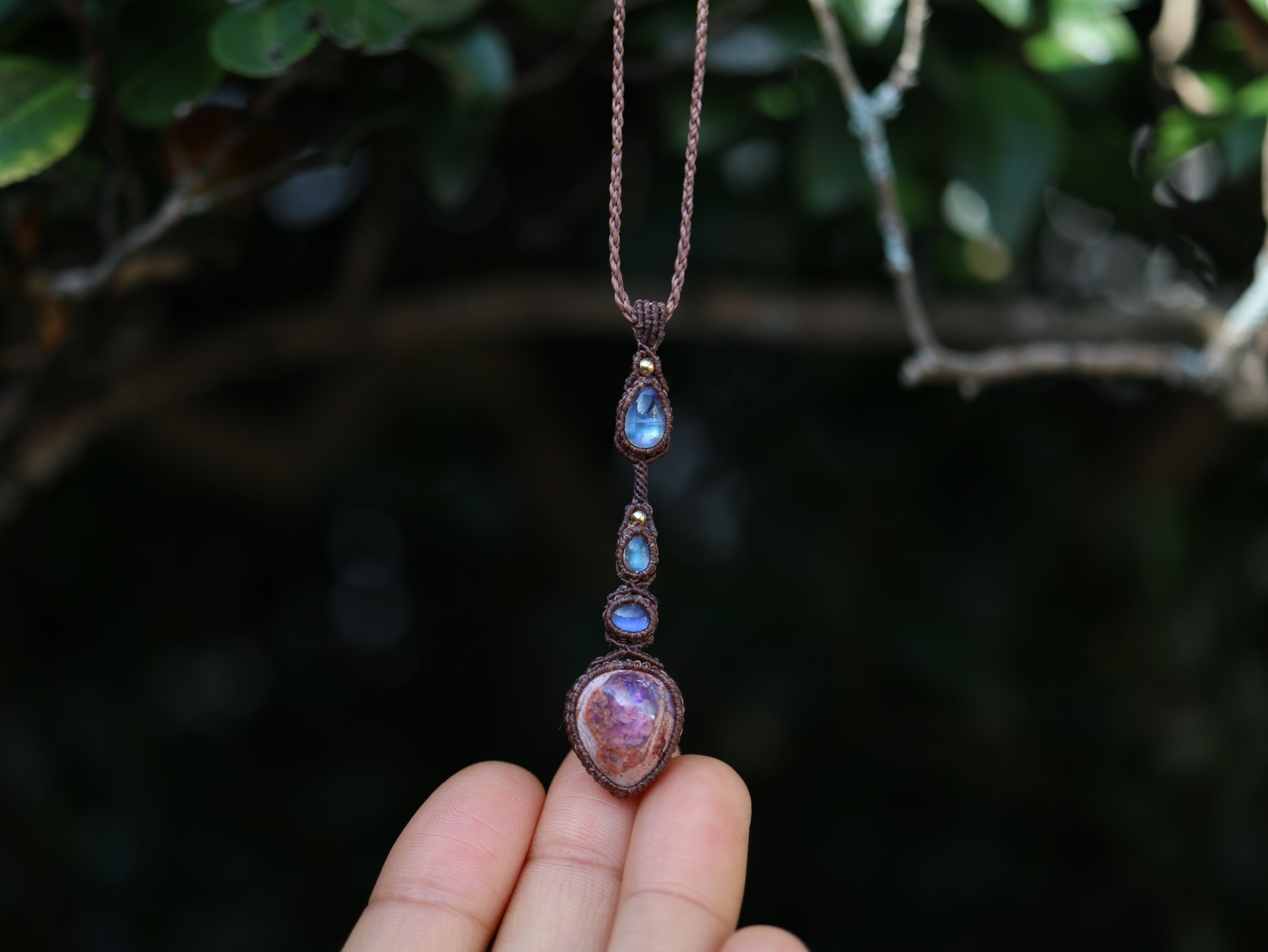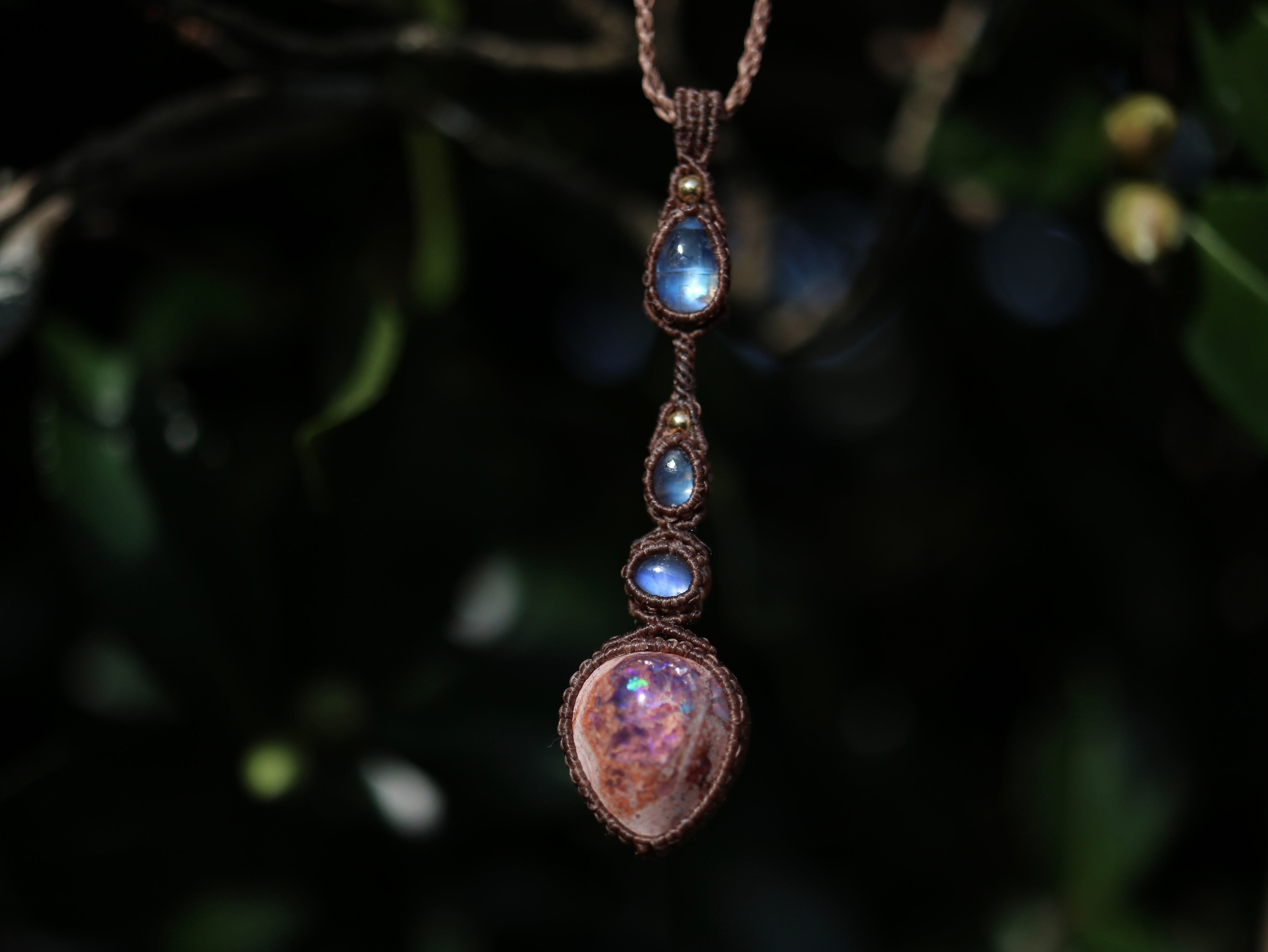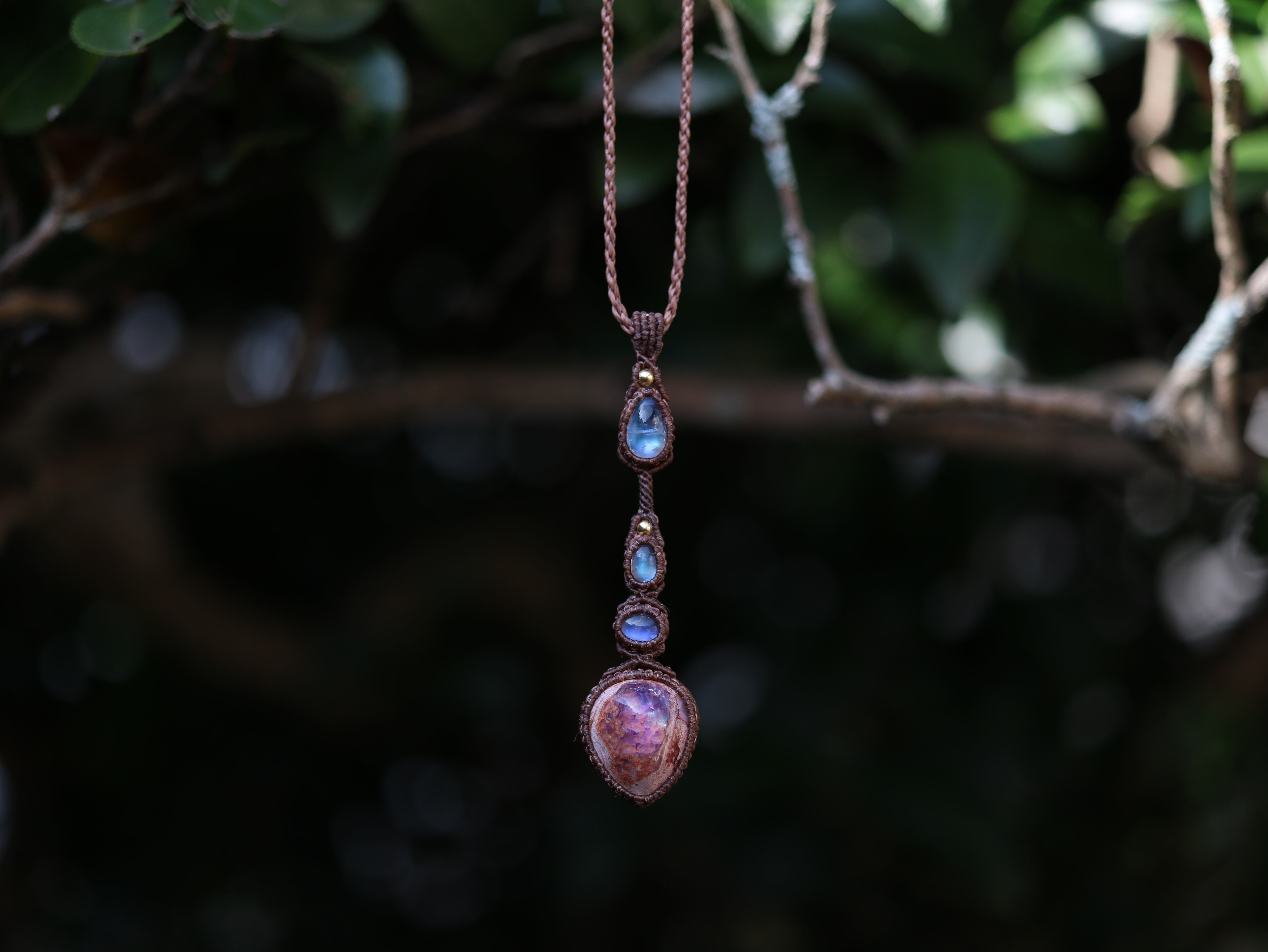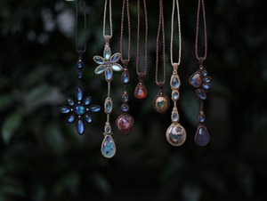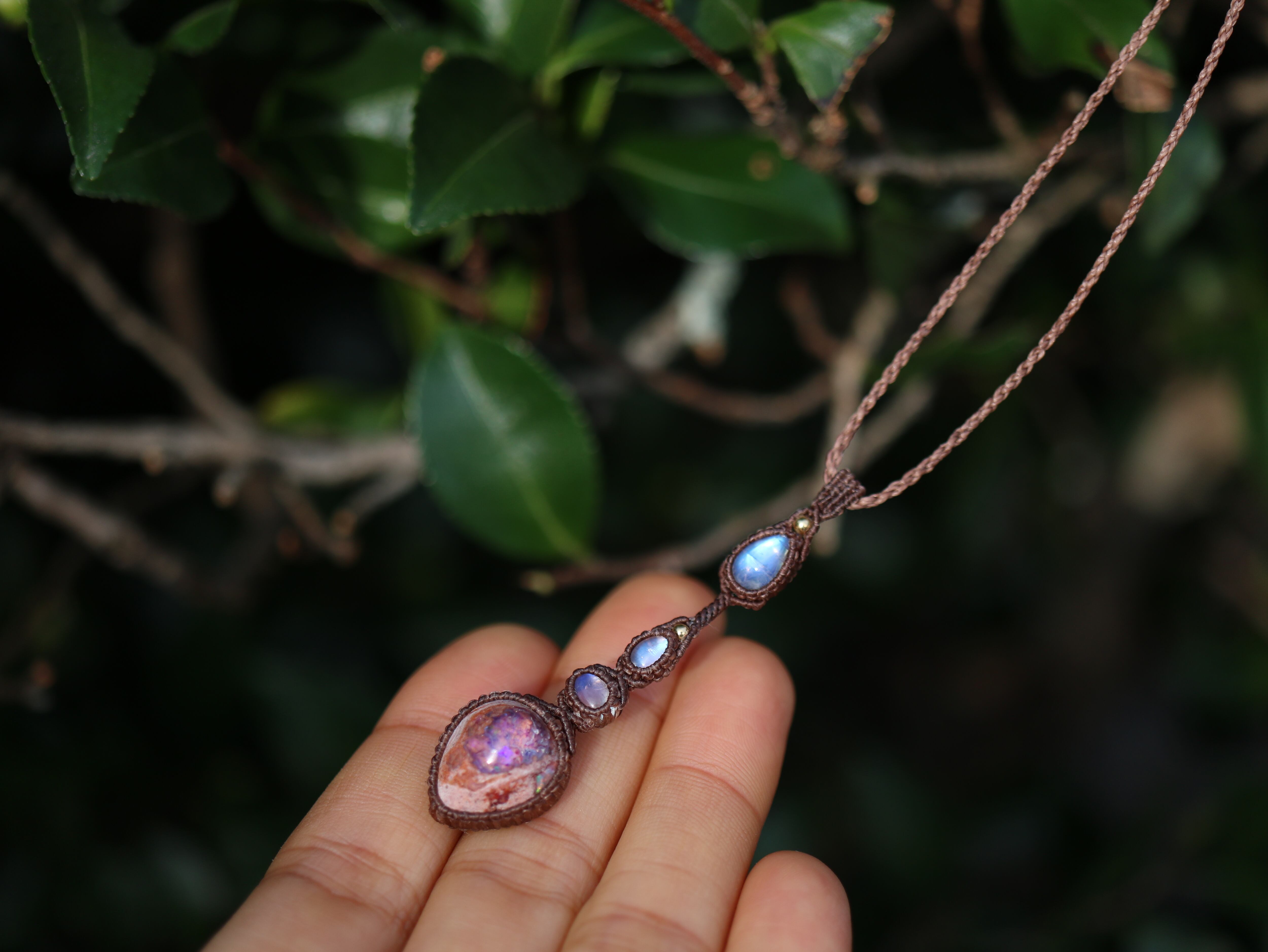 ※ 天然石を包むコードを始めトップ部分に使用したマクラメ編みコードは手縫い糸ほどの細いコードを使い、天然石の表情を引き立てるよう、ひと目ひと目丁寧に編み上げています。