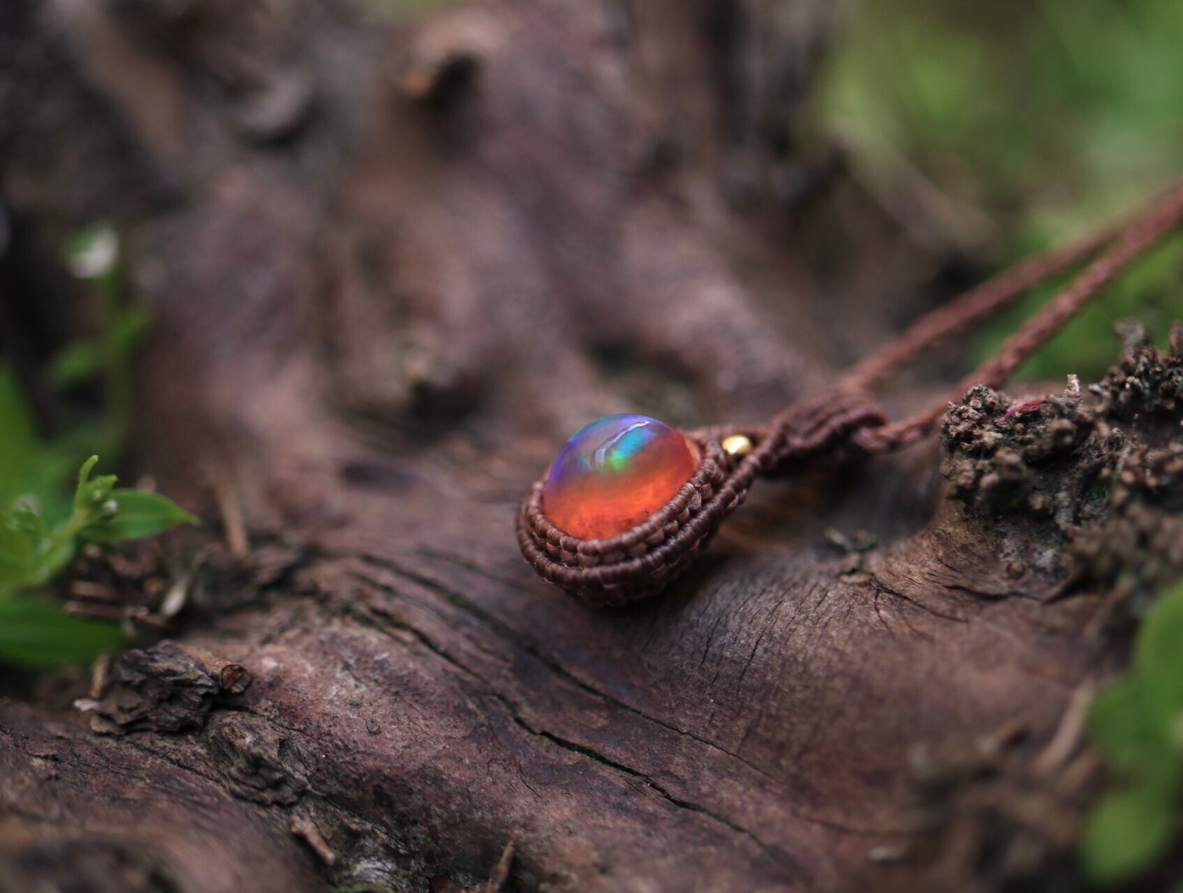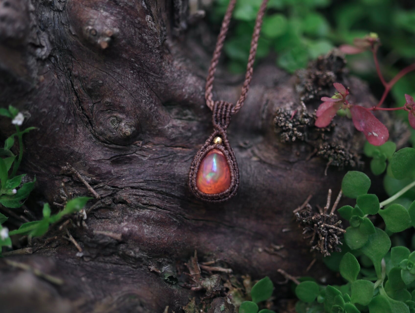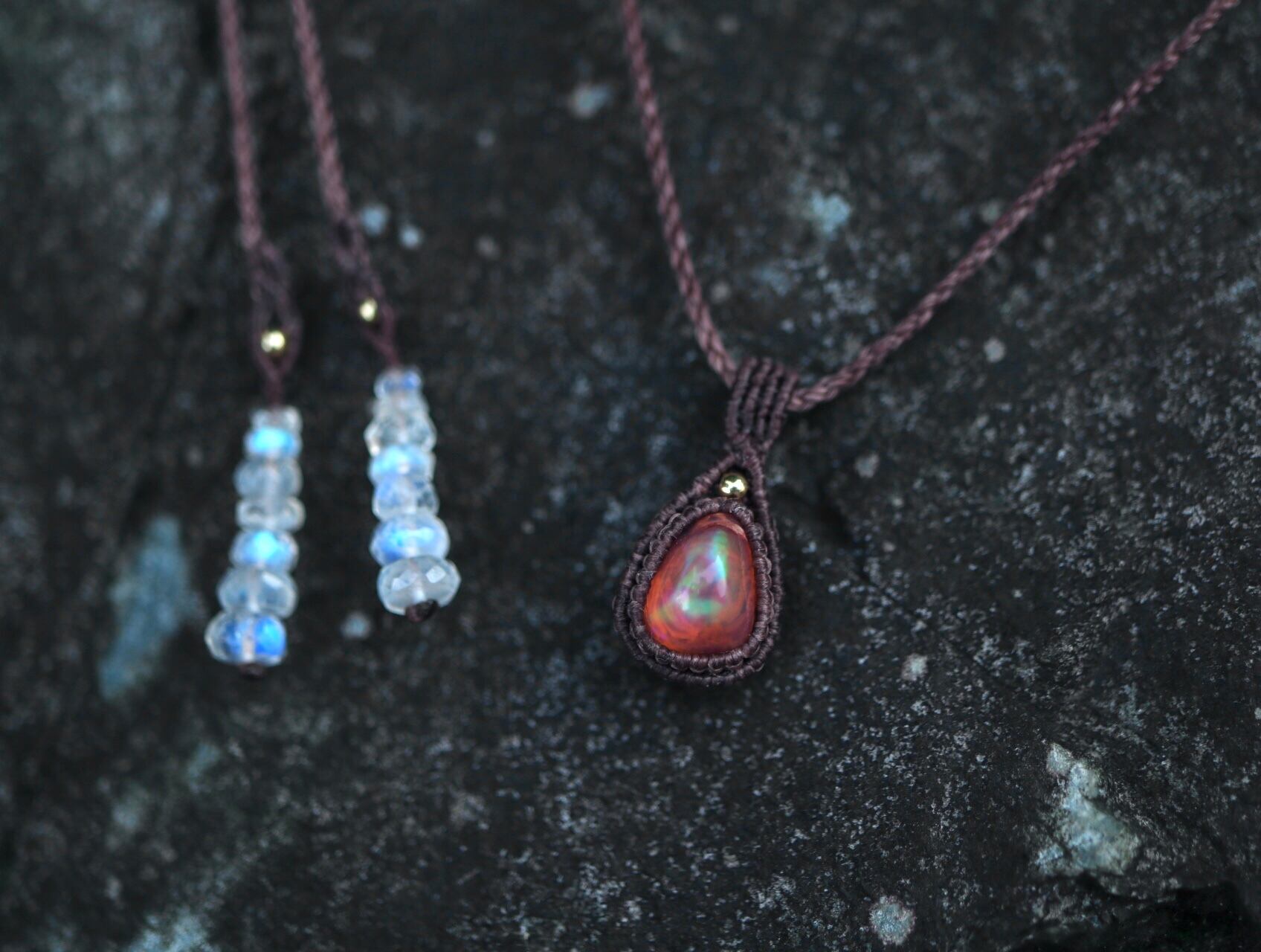 ※ 天然石を包むコードを始めトップ部分に使用したマクラメ編みコードは手縫い糸ほどの細いコードを使い、天然石の表情を引き立てるようひと目ひと目丁寧に編み上げています。