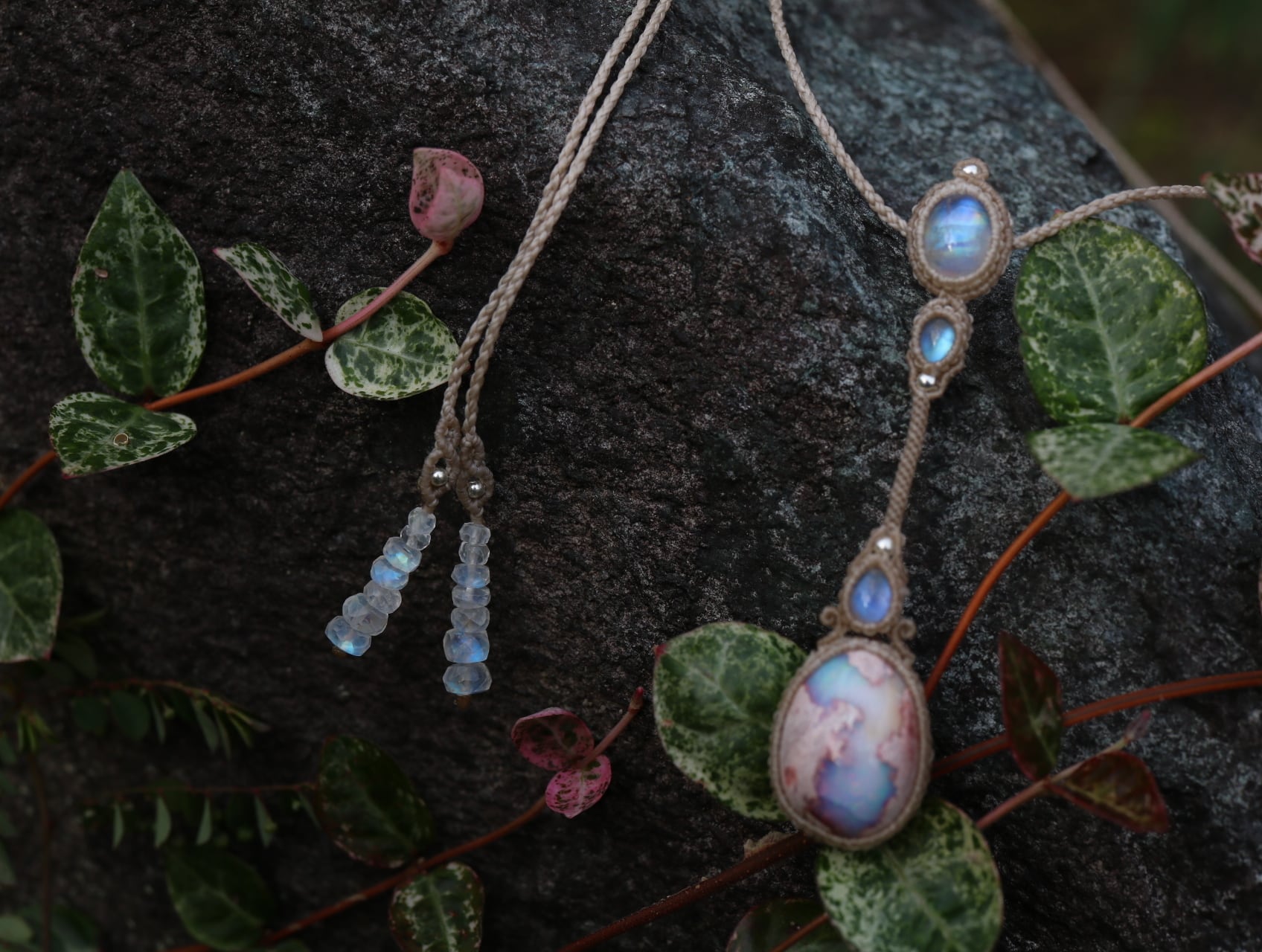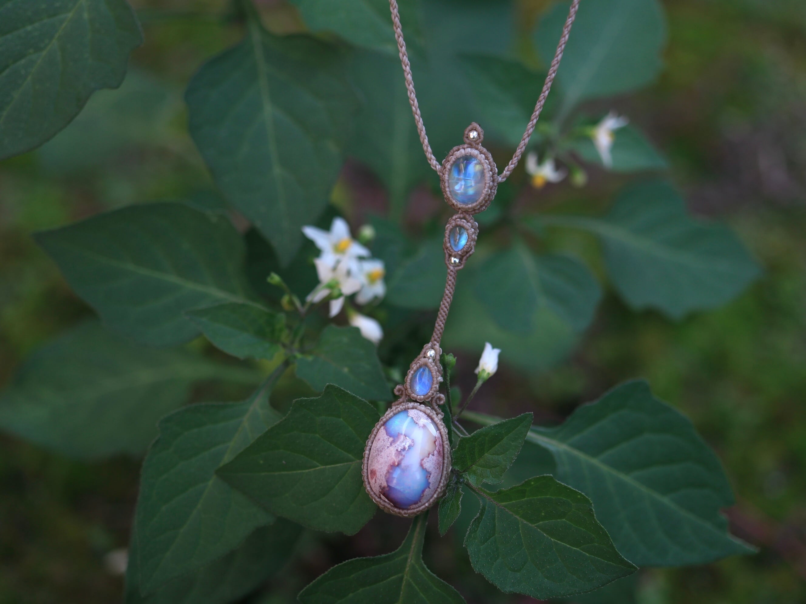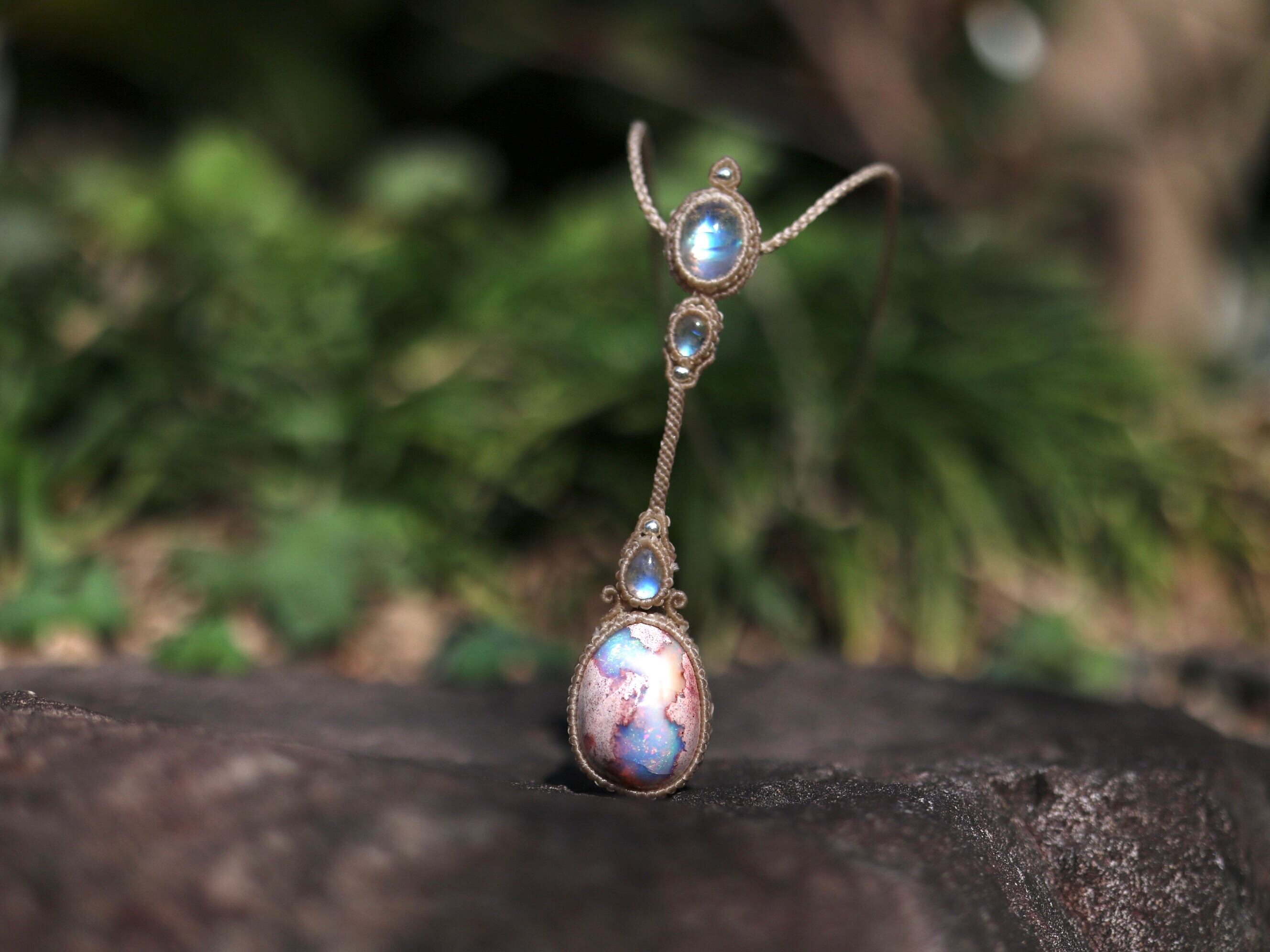 ※ 天然石を包むコードを始めトップ部分に使用したマクラメ編みコードは手縫い糸ほどの細いコードを使い、天然石の表情を引き立てるよう