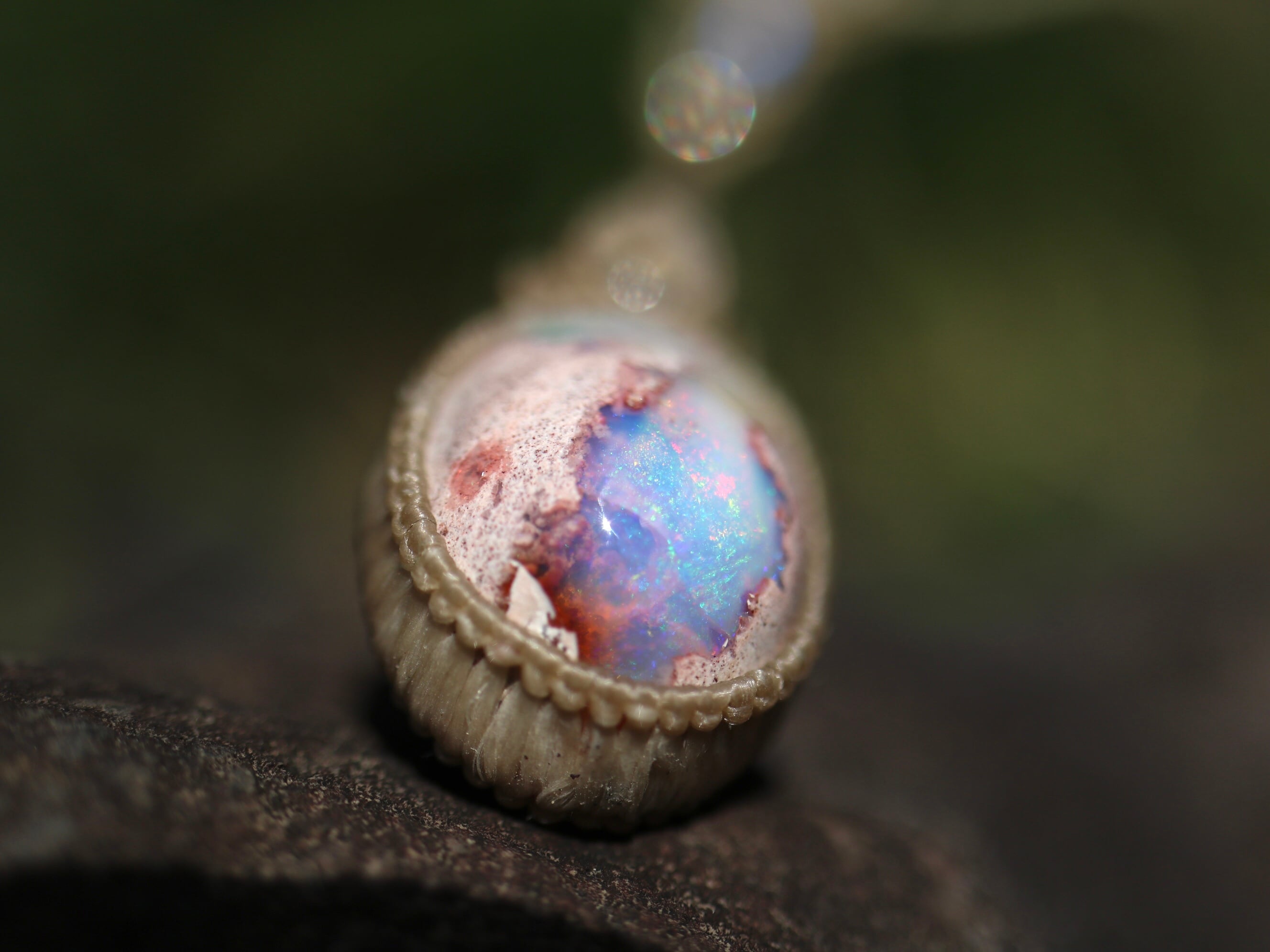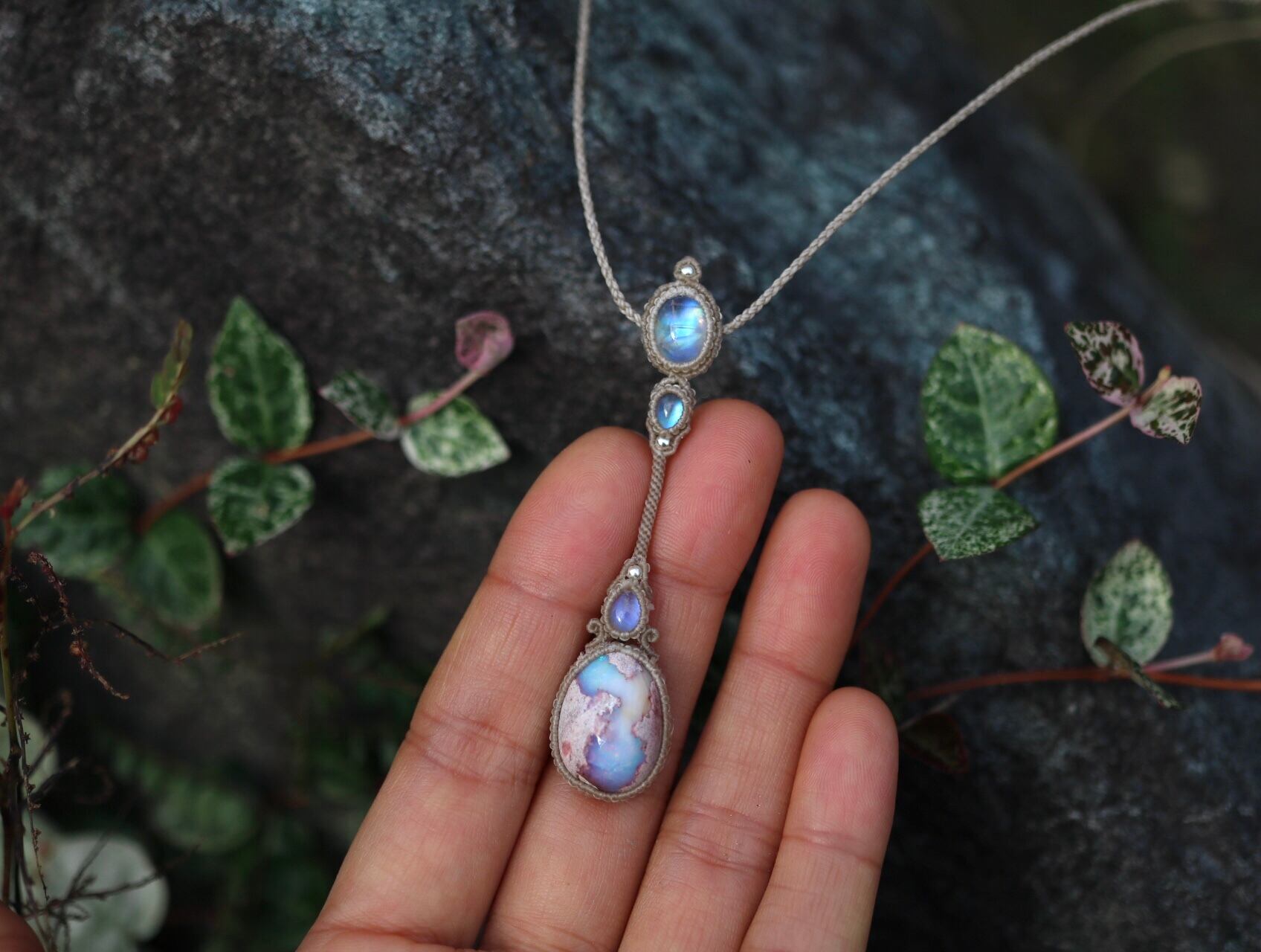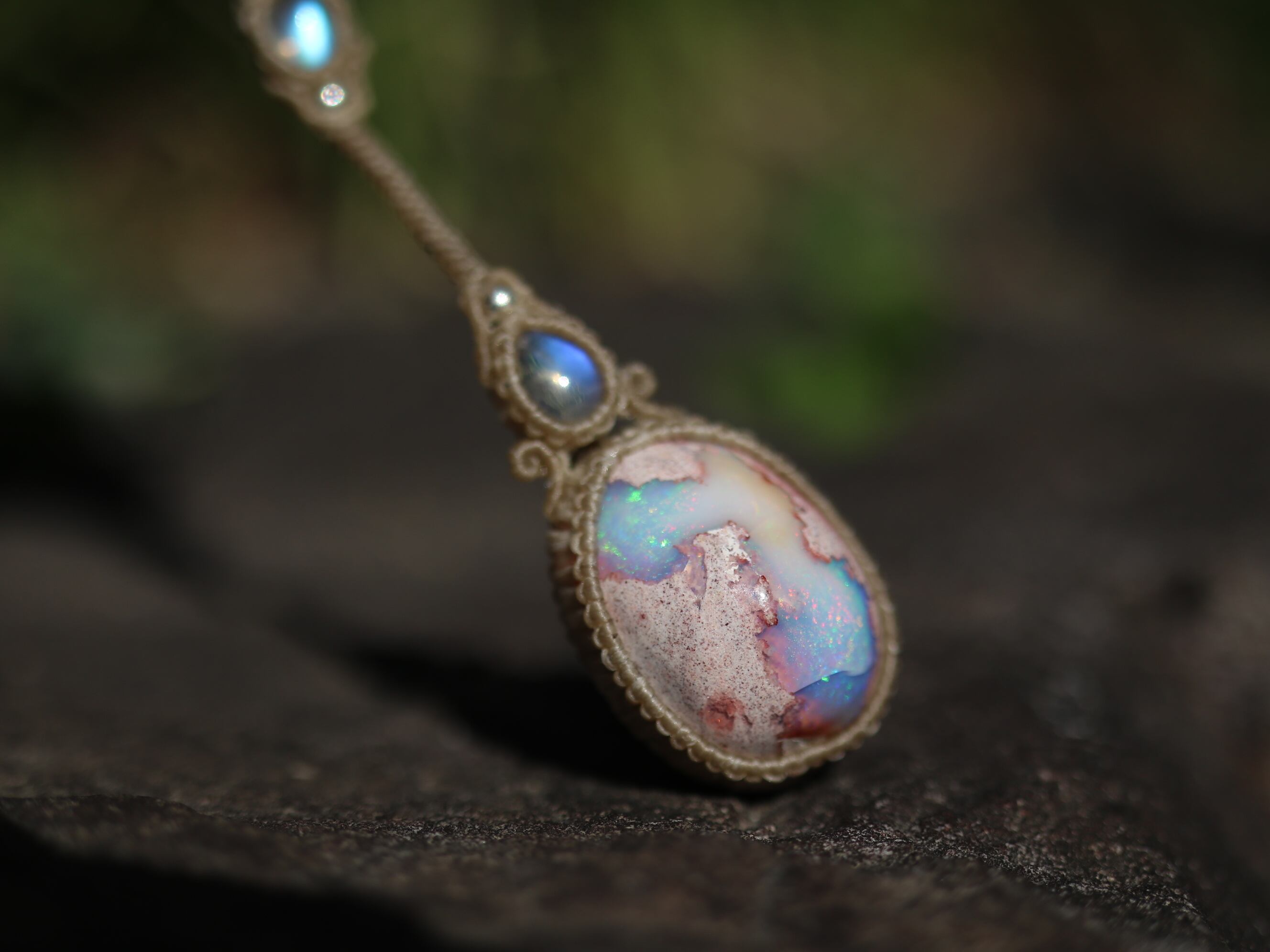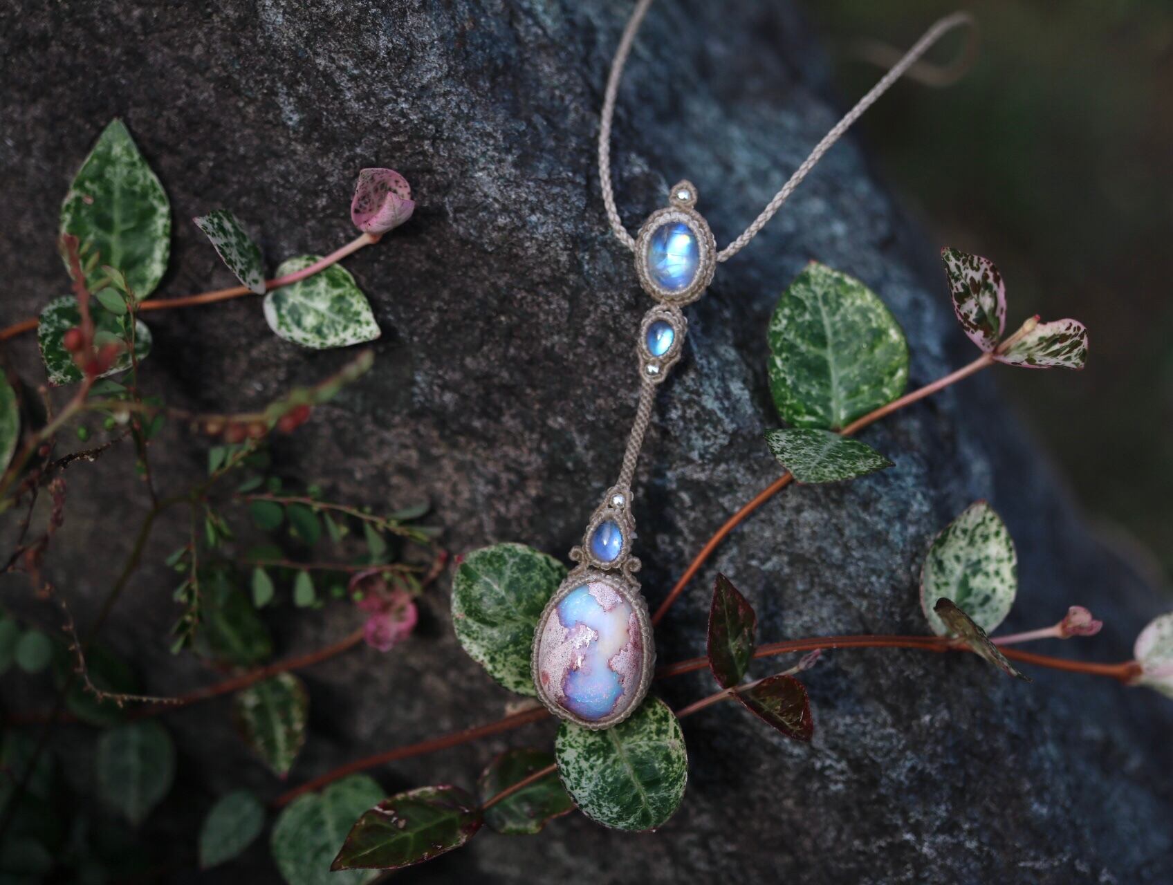 ※ 天然石を包むコードを始めトップ部分に使用したマクラメ編みコードは手縫い糸ほどの細いコードを使い、天然石の表情を引き立てるよう