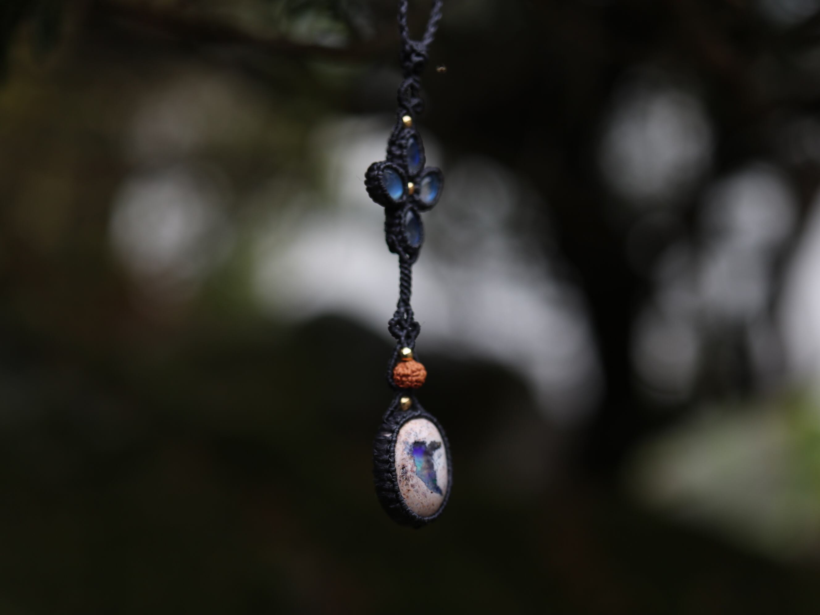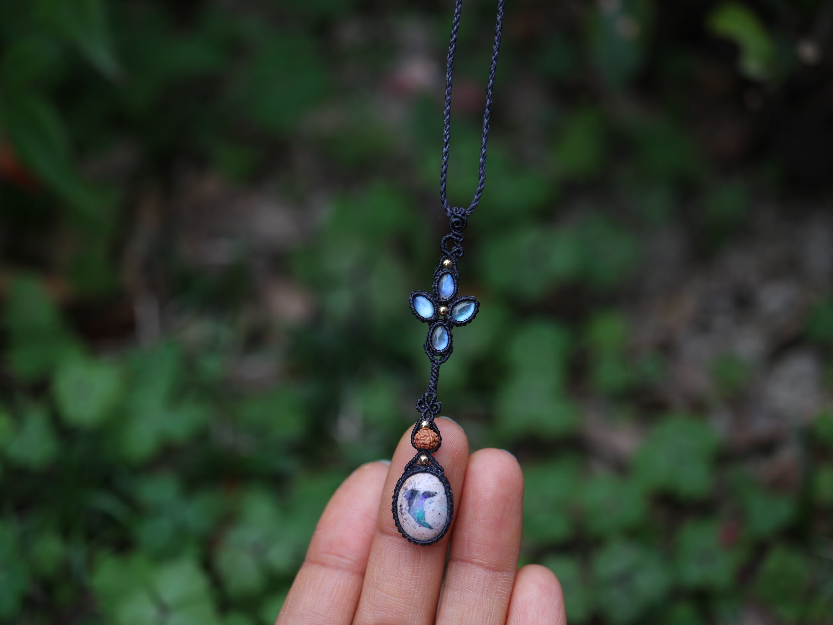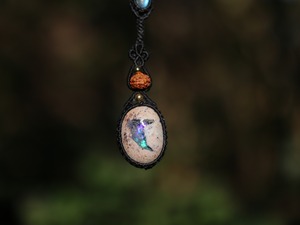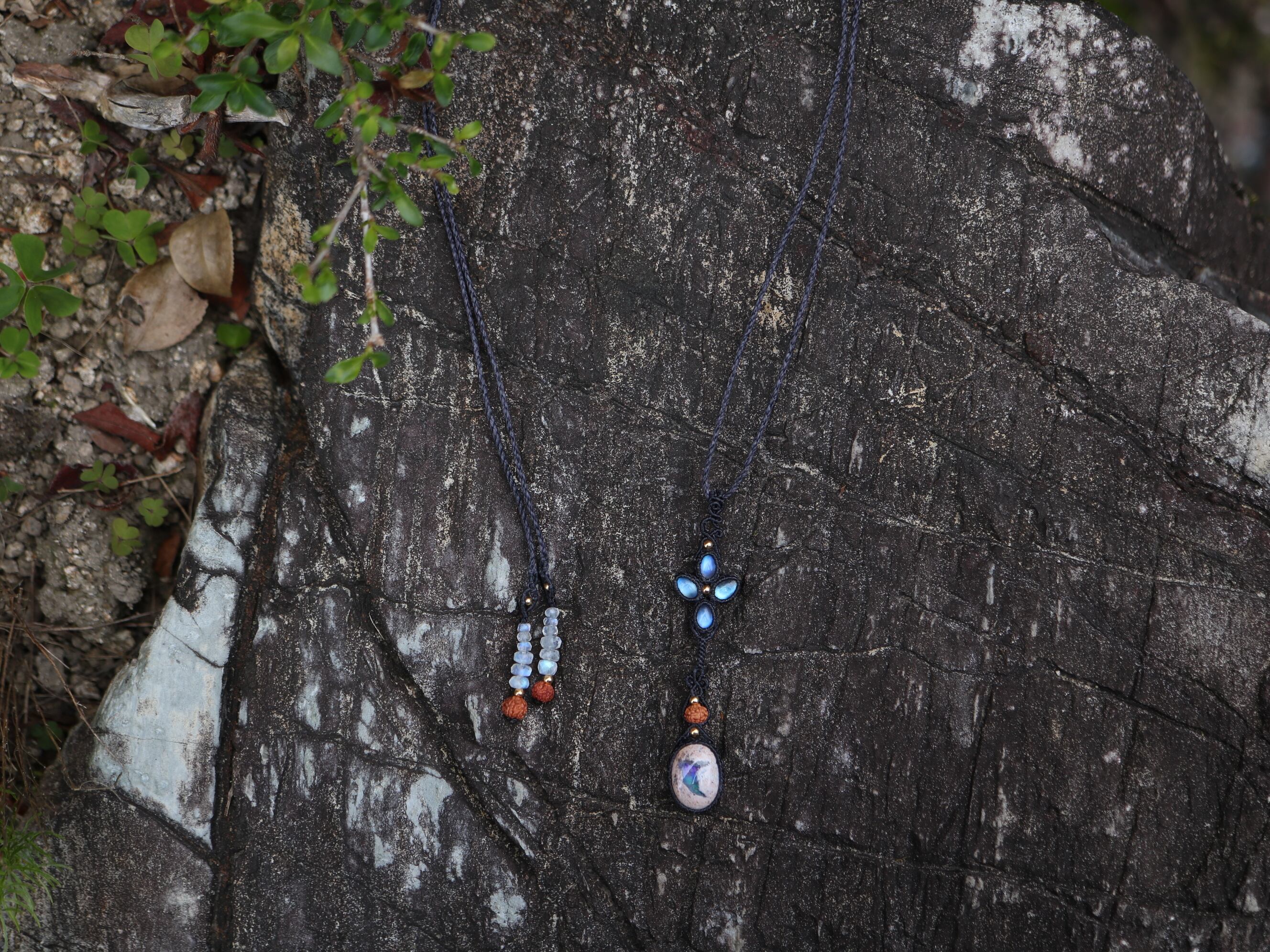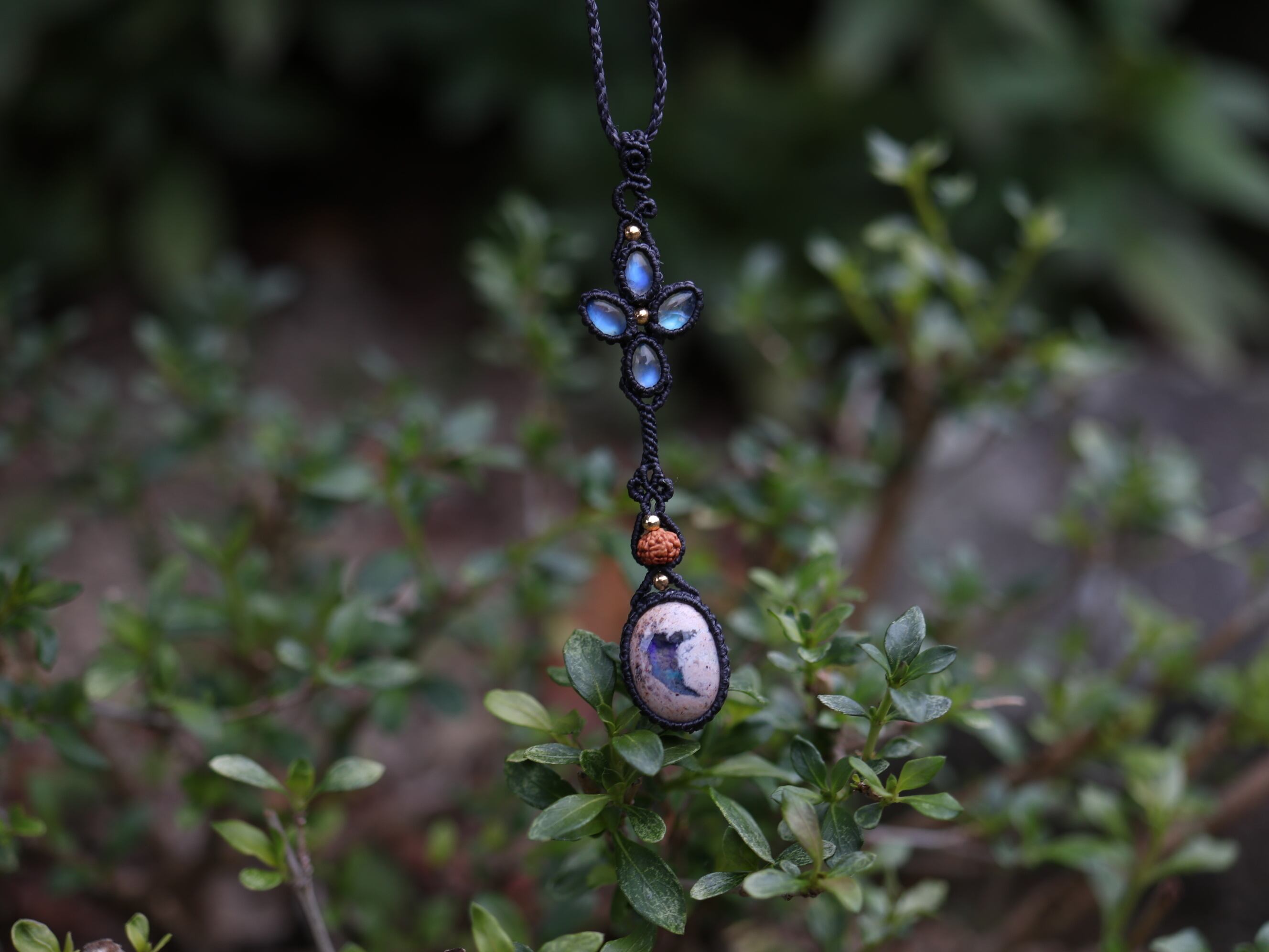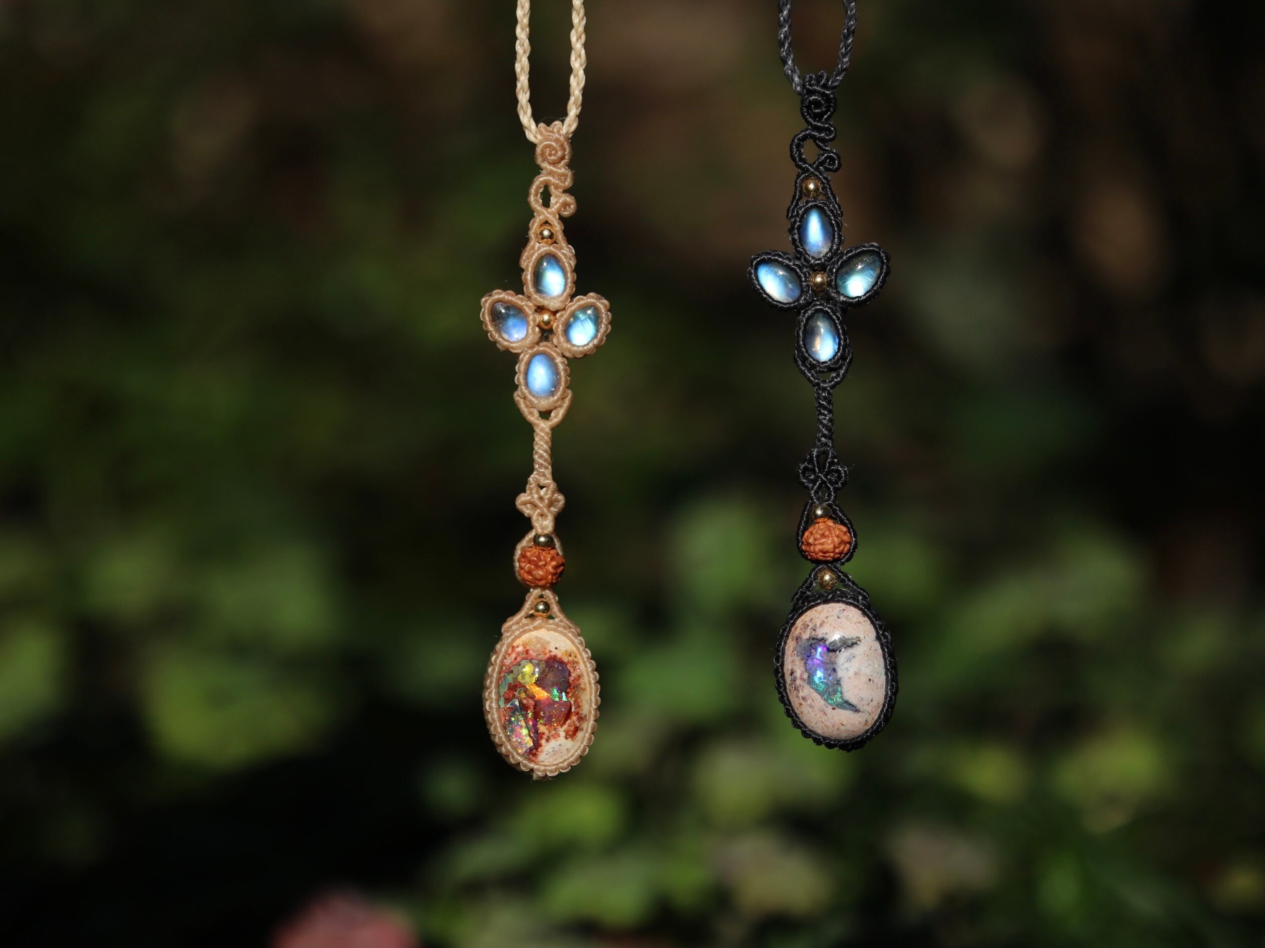 ※ 天然石を包むコードを始めトップ部分に使用したマクラメ編みコードは手縫い糸ほどの細いコードを使い、天然石の表情を引き立てるよう