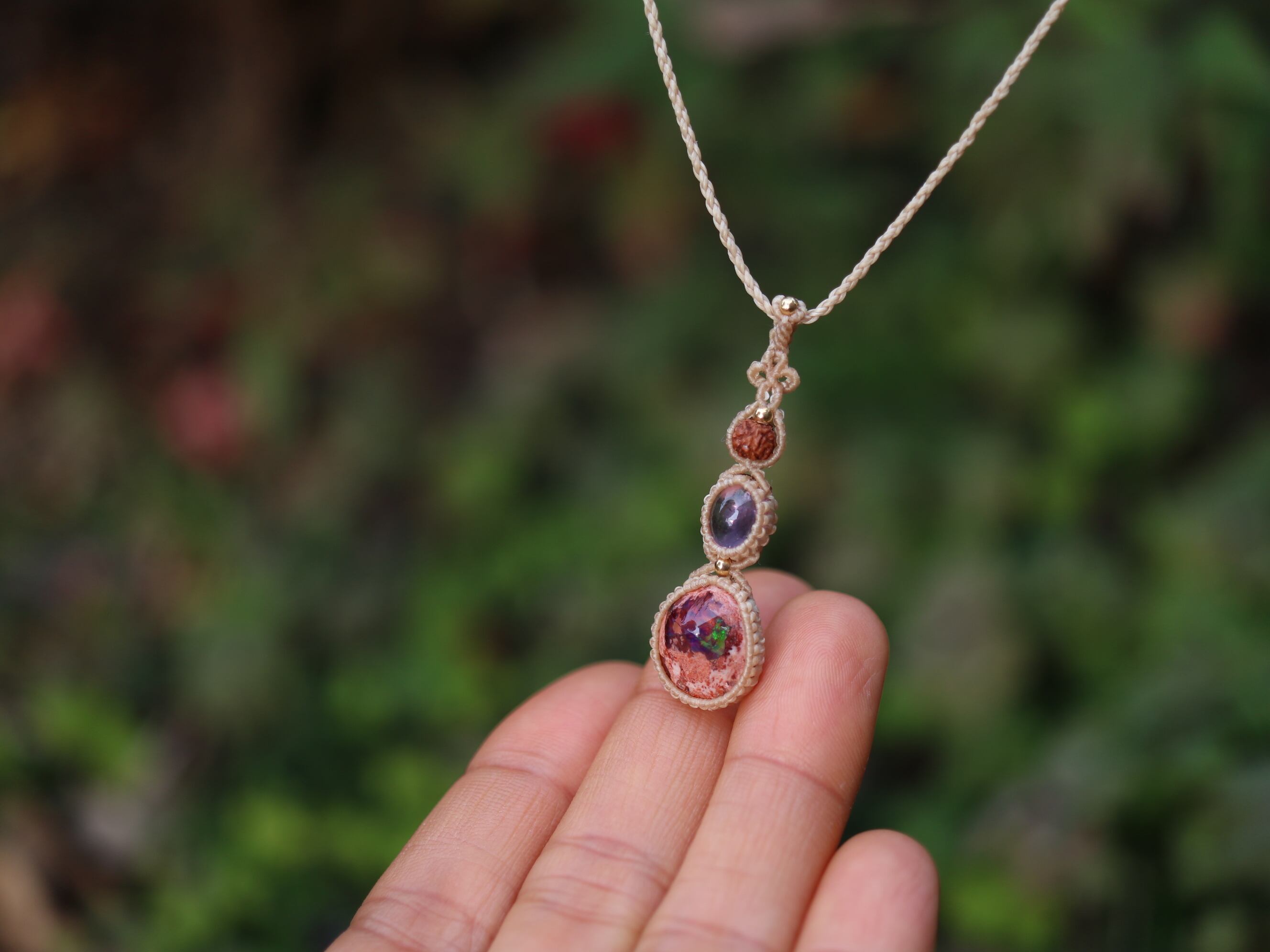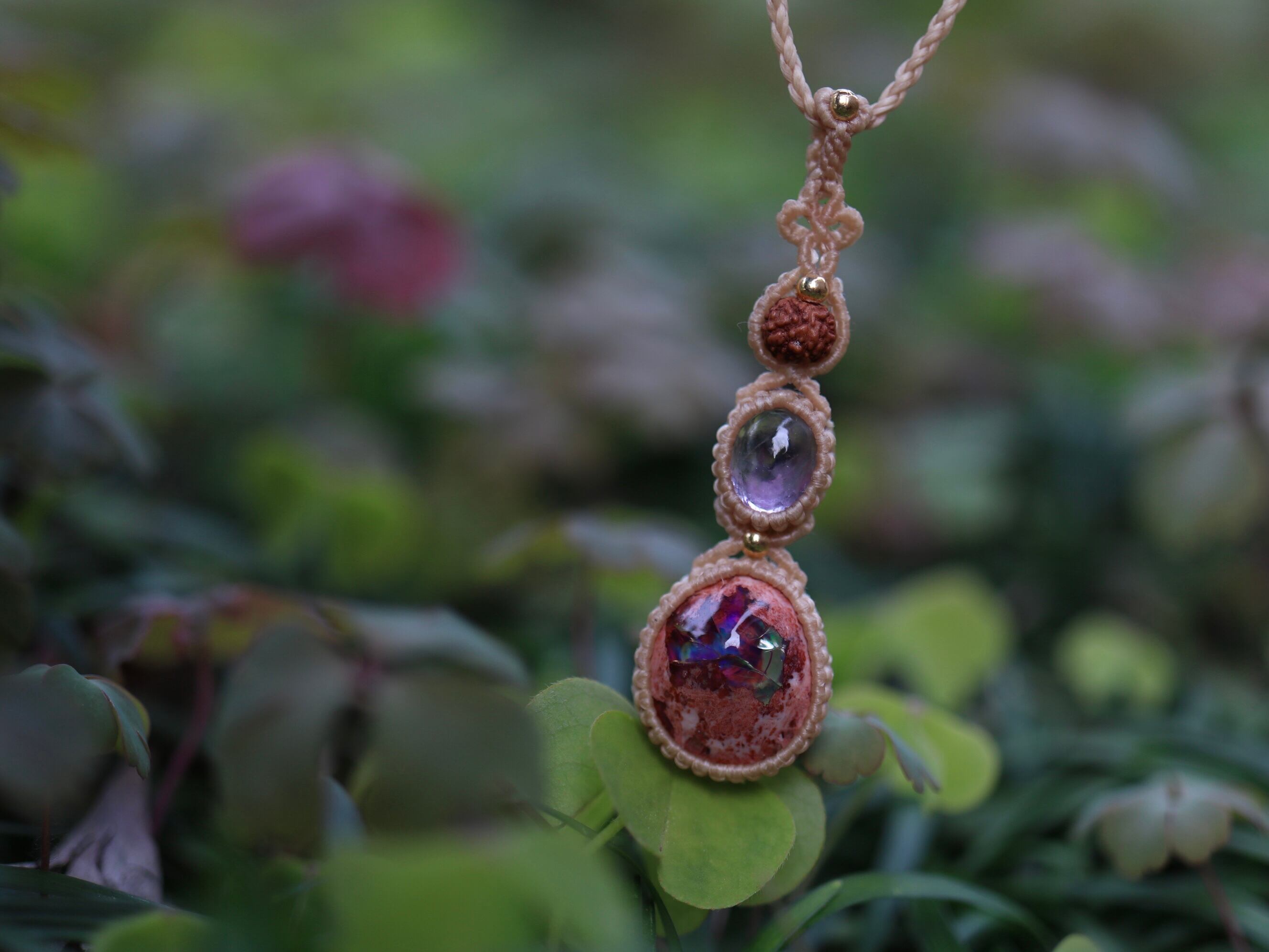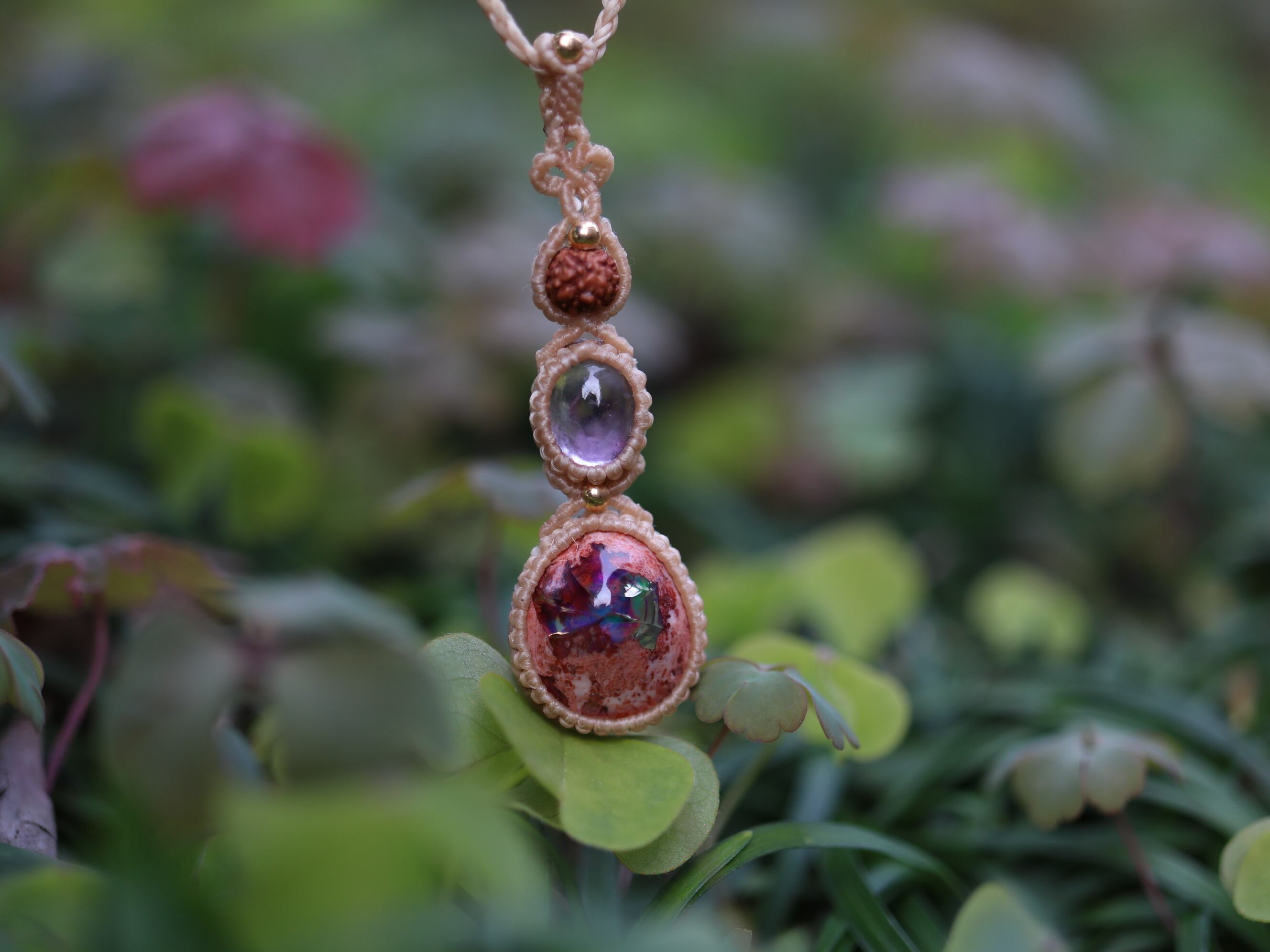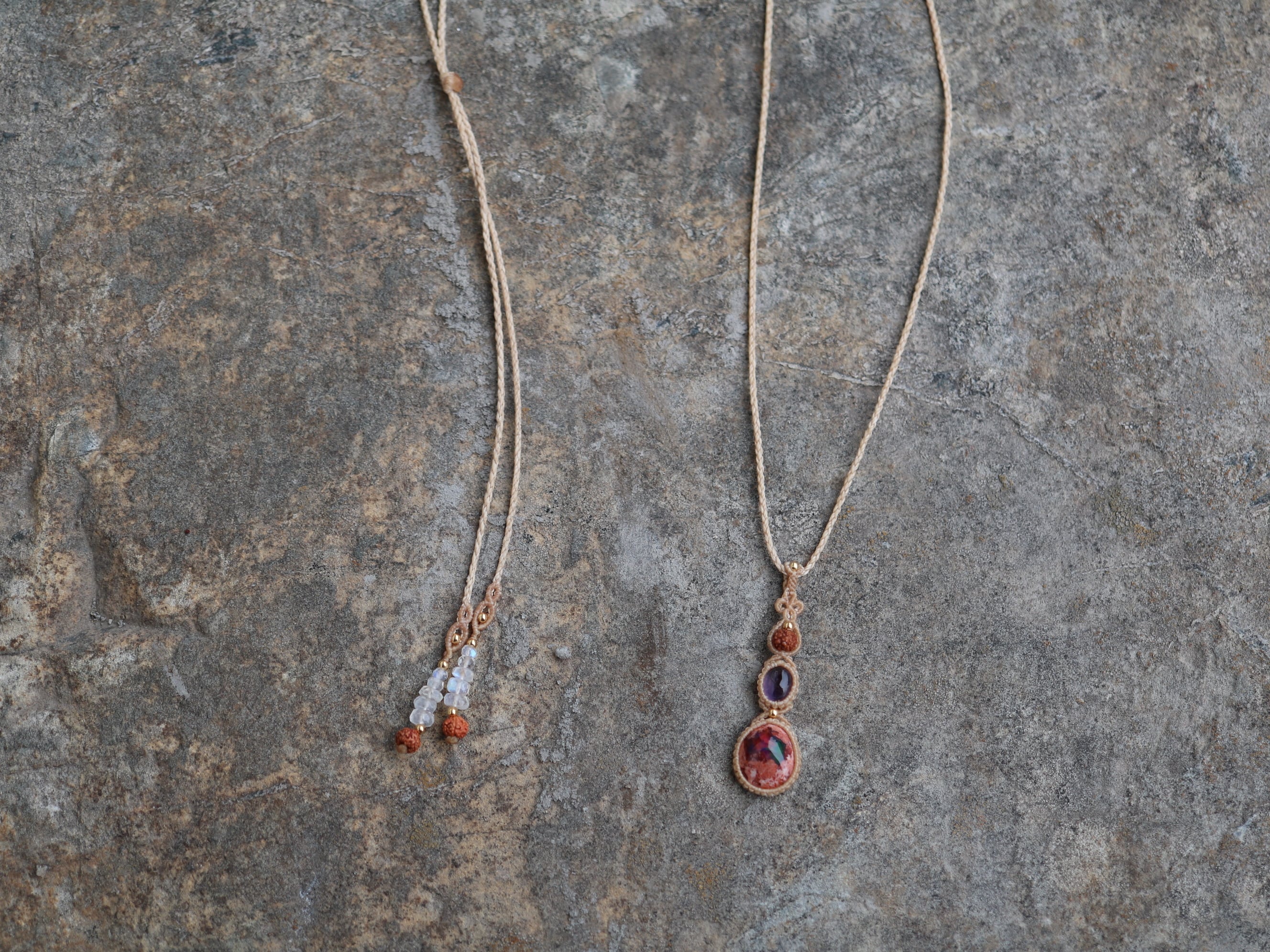 ※ 天然石を包むコードを始めトップ部分に使用したマクラメ編みコードは手縫い糸ほどの細いコードを使い、天然石の表情を引き立てるよう