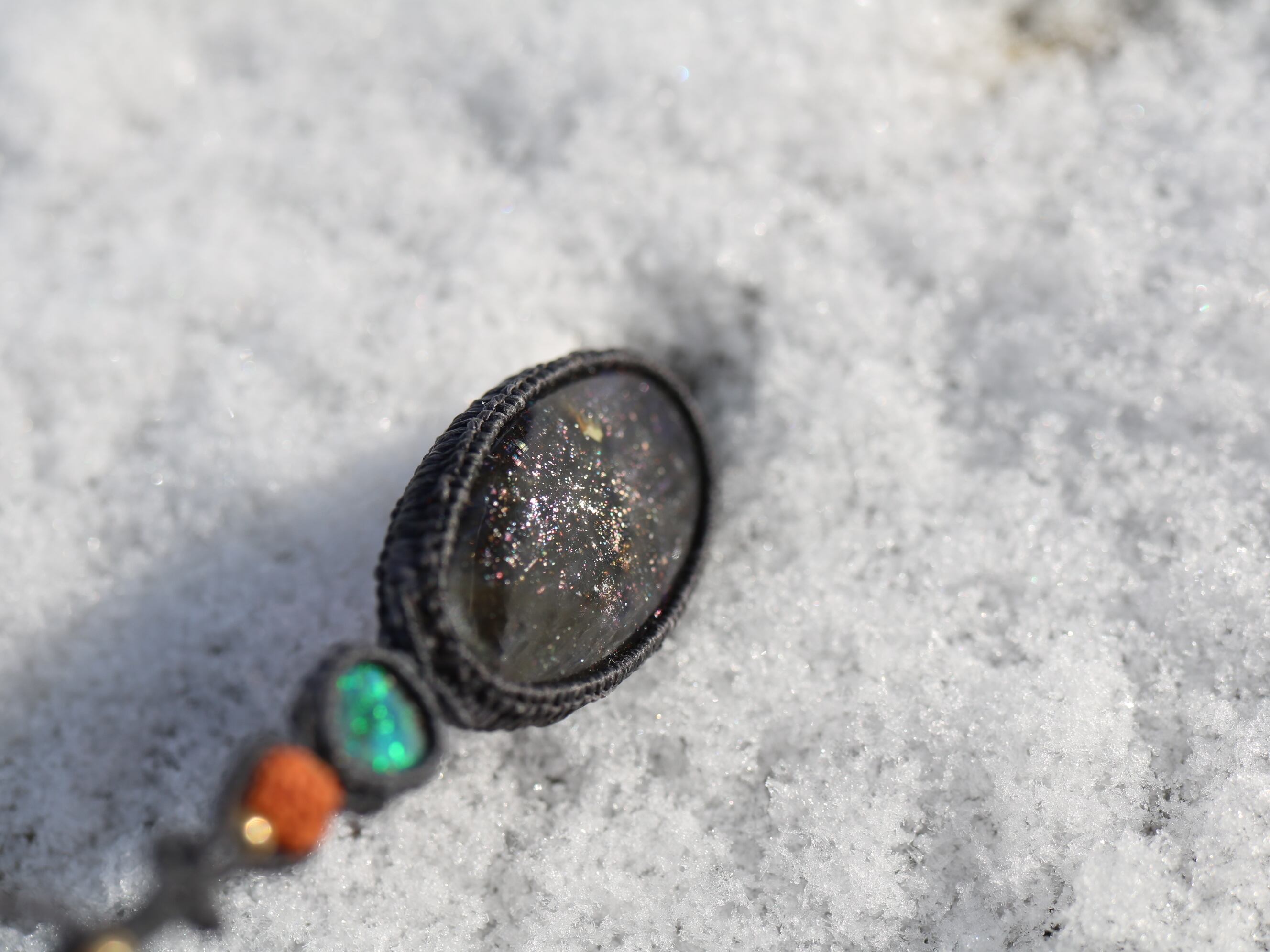 ※ 天然石を包むコードを始めトップ部分に使用したマクラメ編みコードは手縫い糸ほどの細いコードを使い、天然石の表情を引き立てるよう
