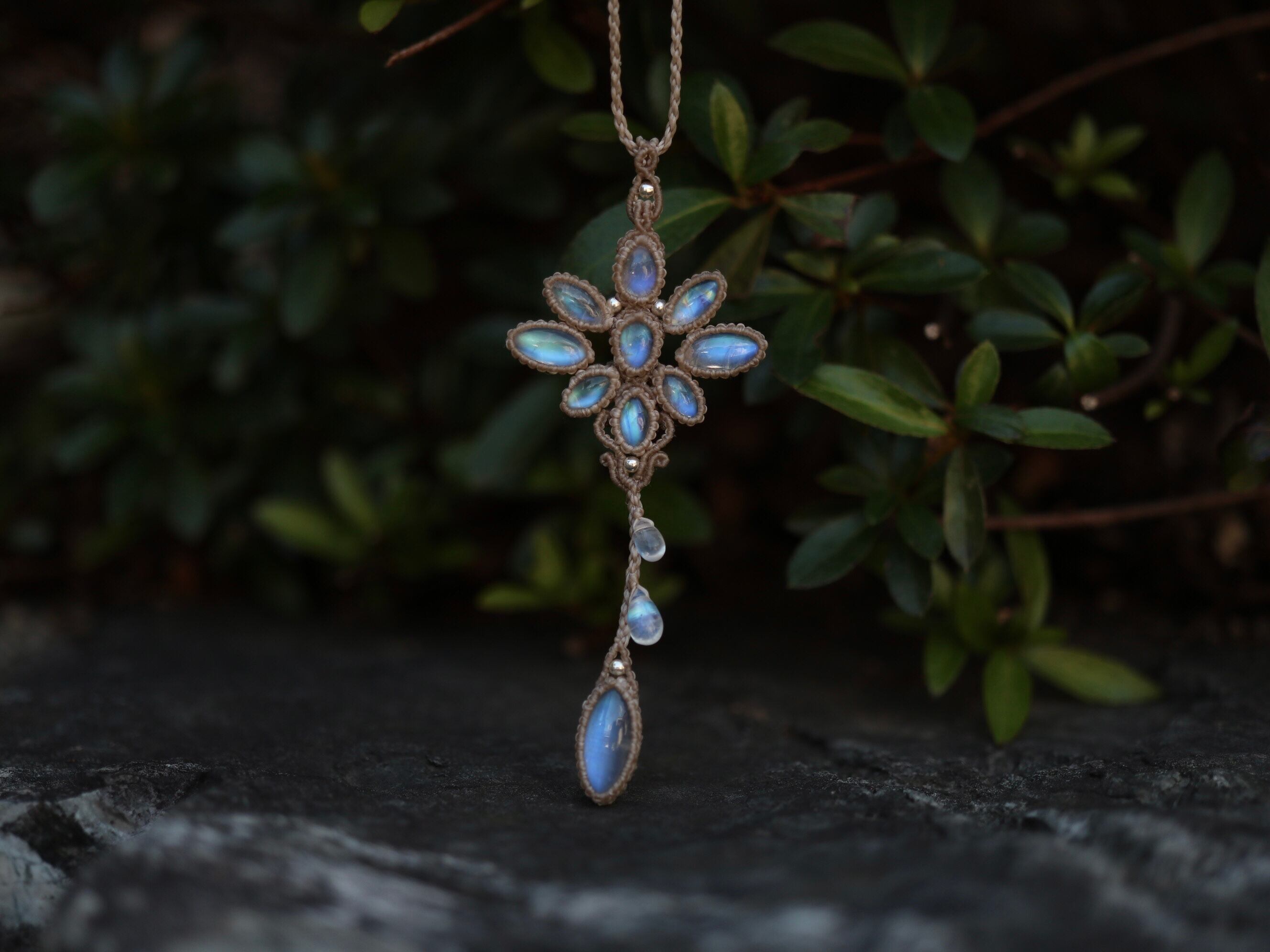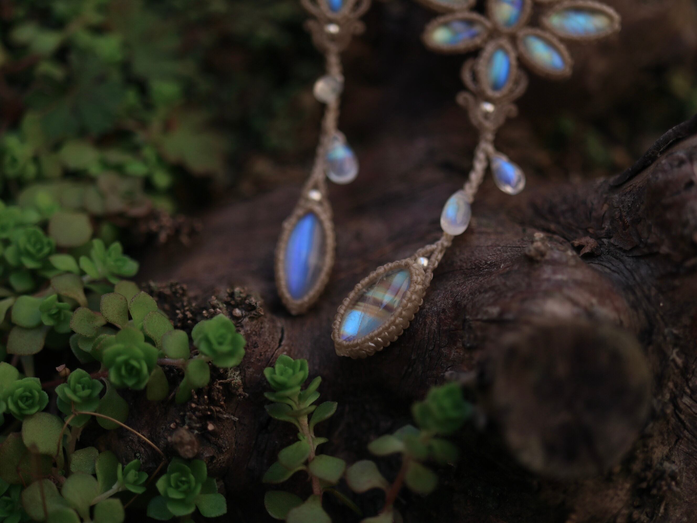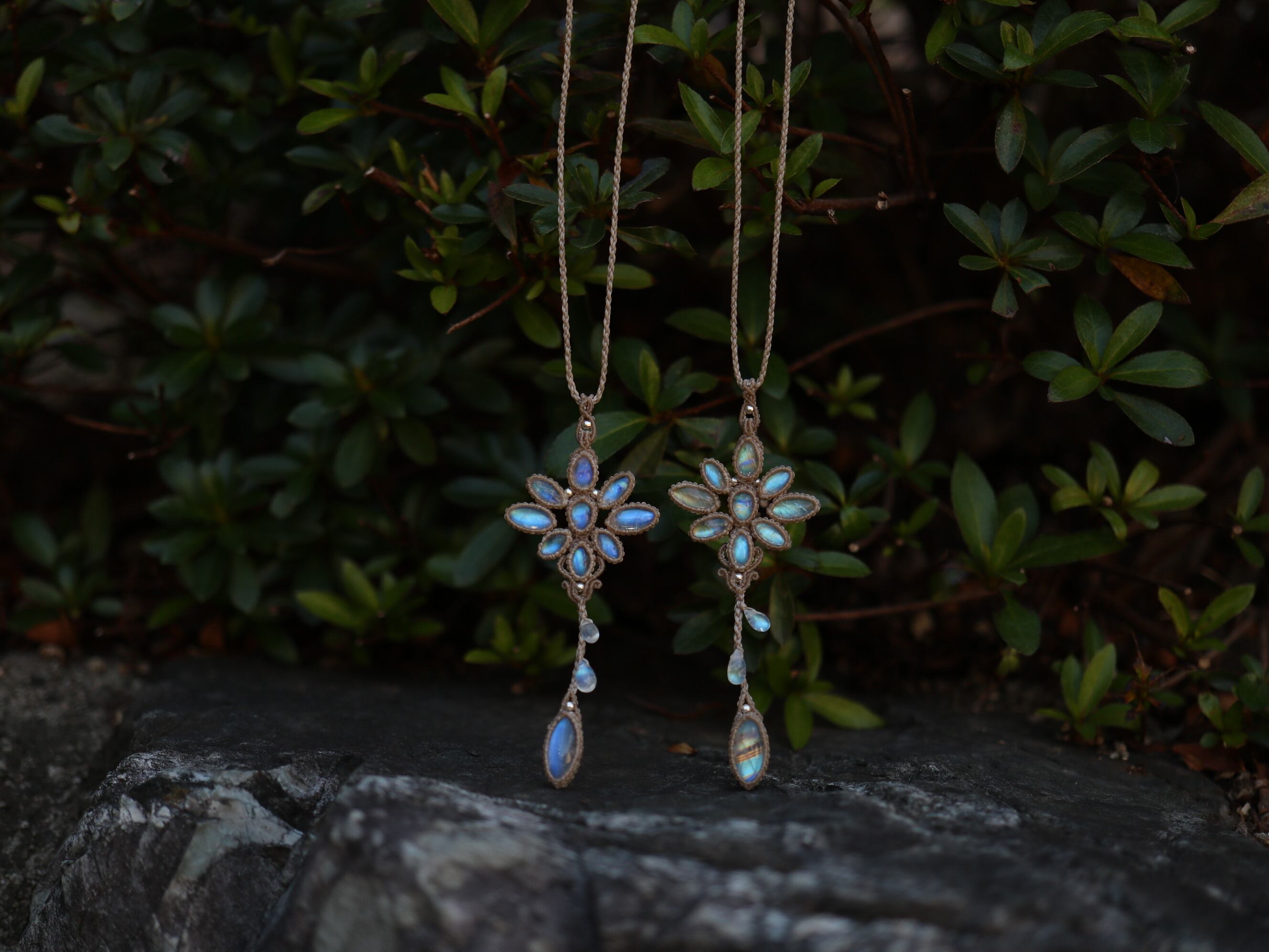 ※ 天然石を包むコードを始めトップ部分に使用したマクラメ編みコードは手縫い糸ほどの細いコードを使い、天然石の表情を引き立てるよう