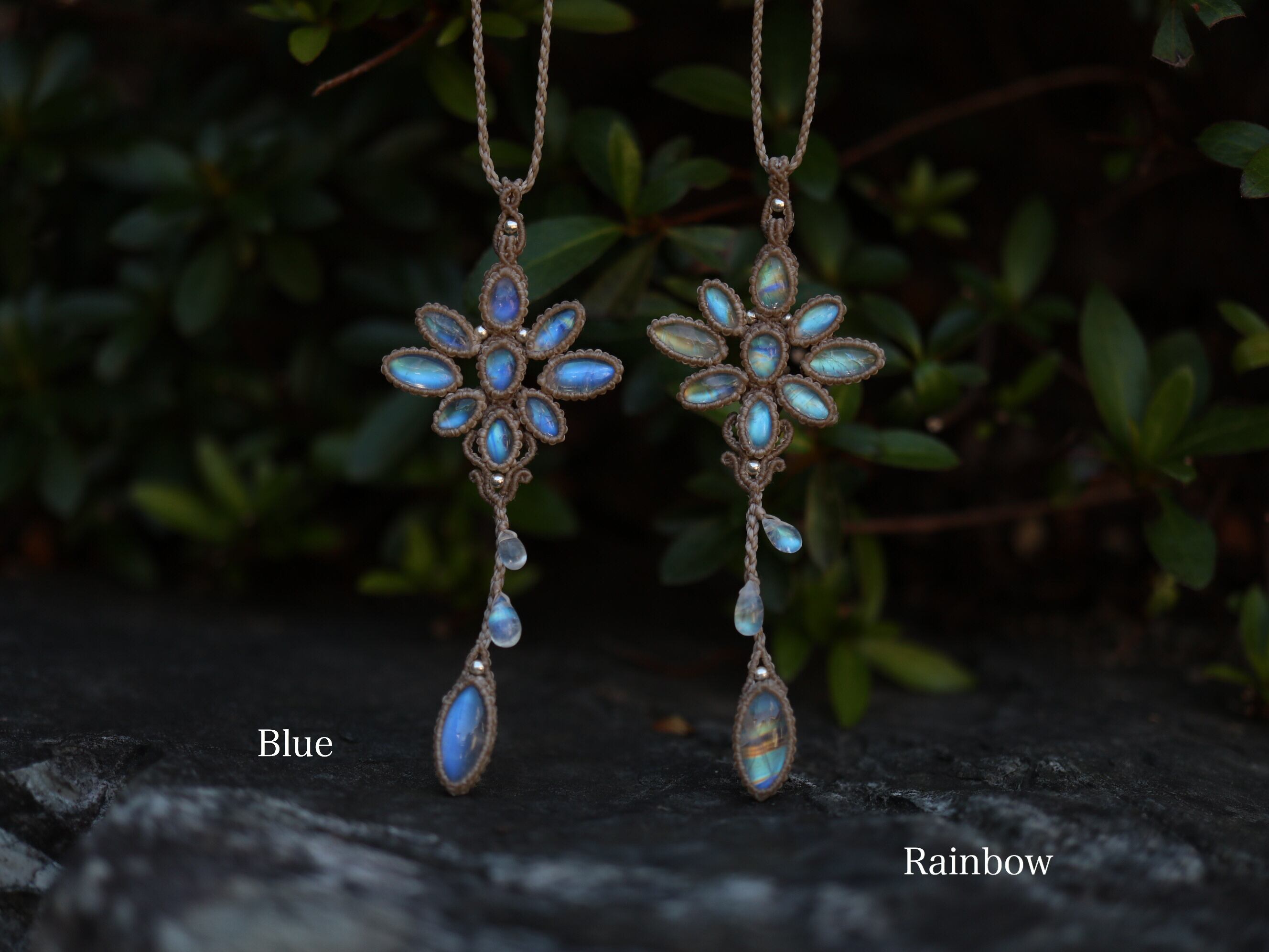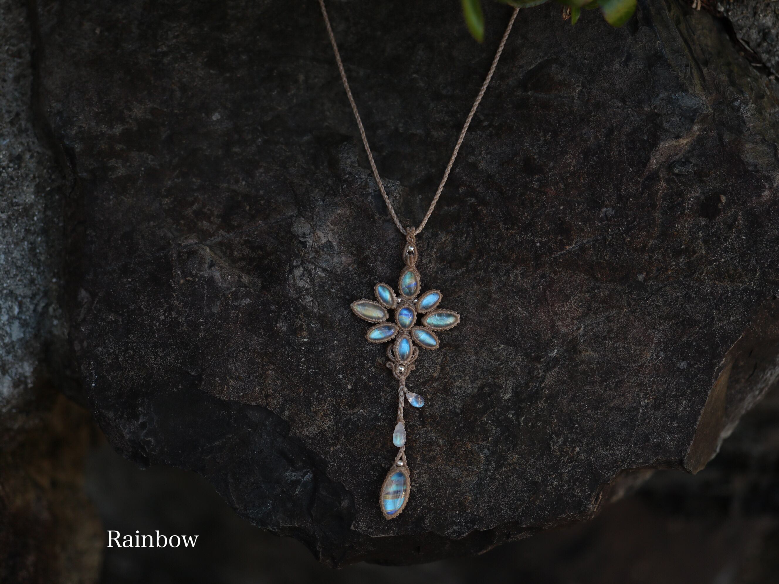 虹色のシラーを放つ個性豊かなレインボームーンストーンをあしらい