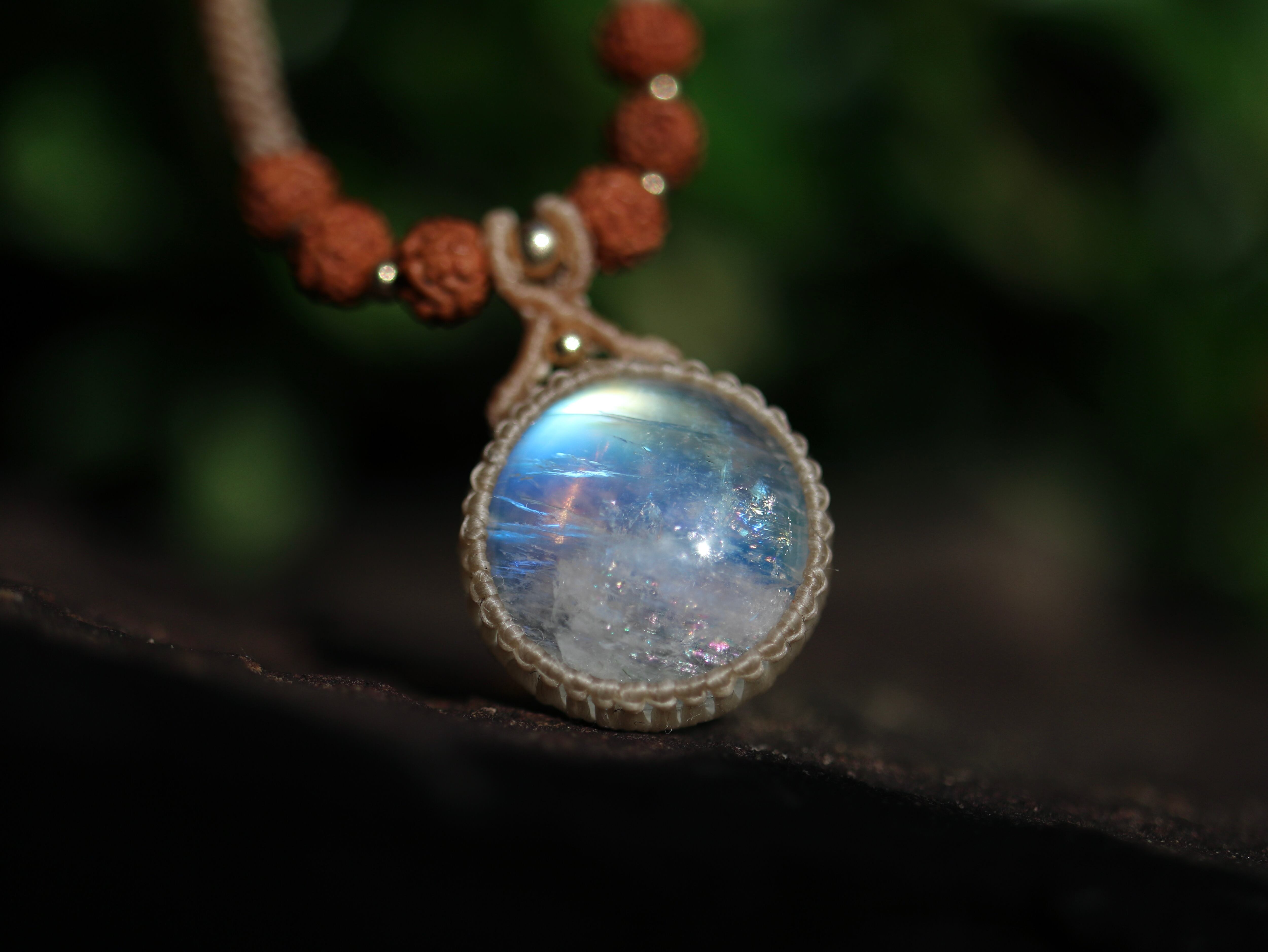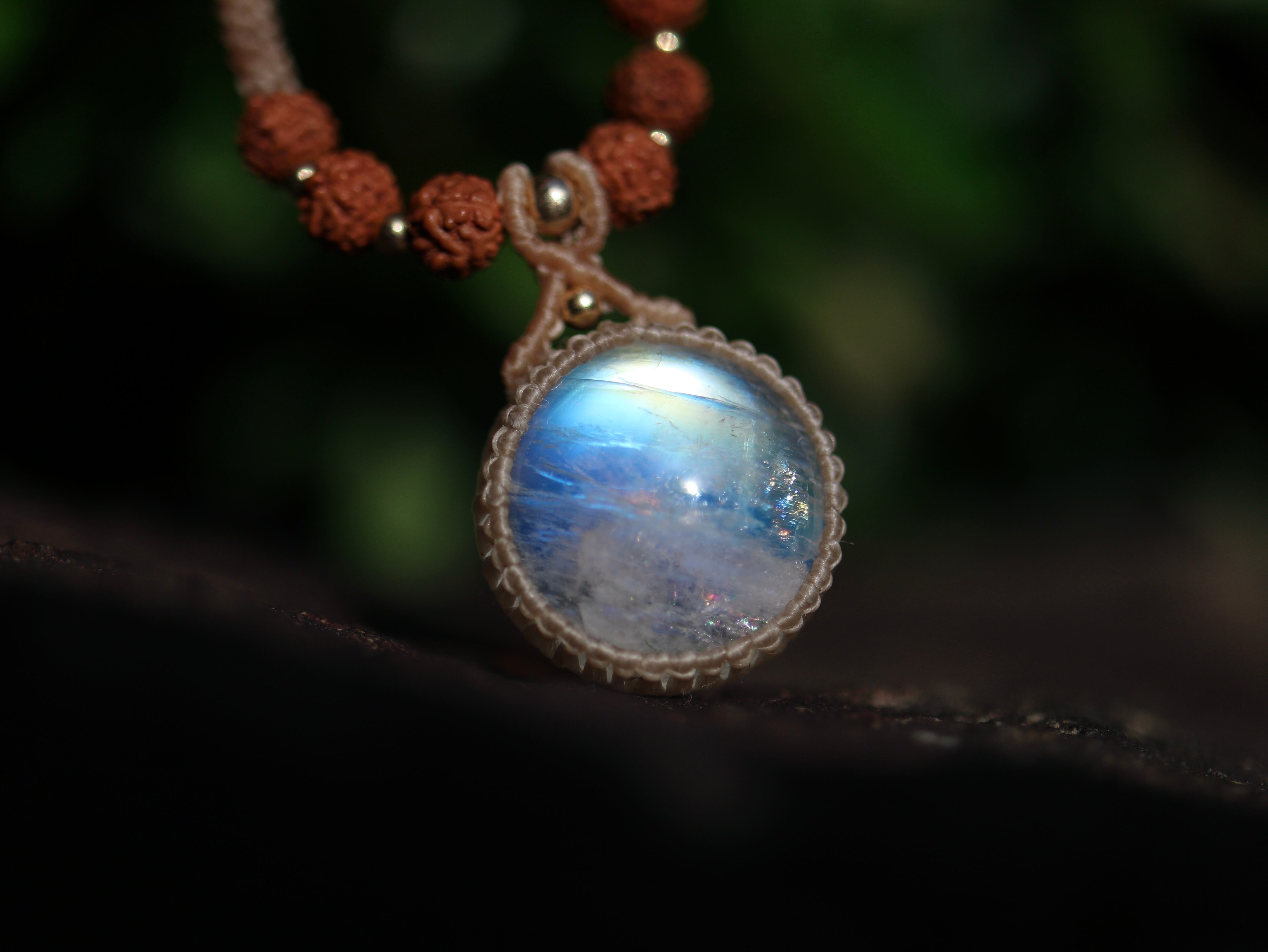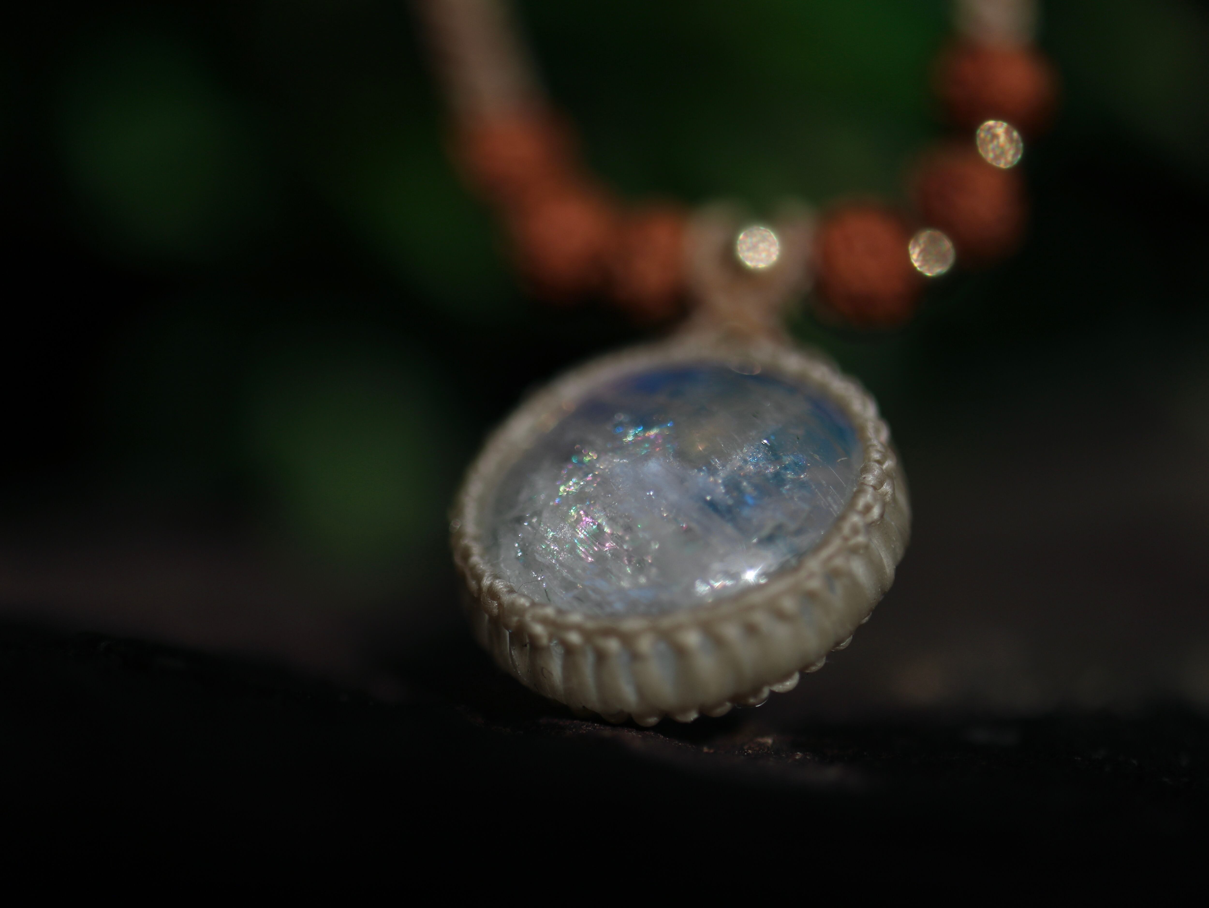 中央にレインボームーンストーンならではの虹のシラーを放ち
