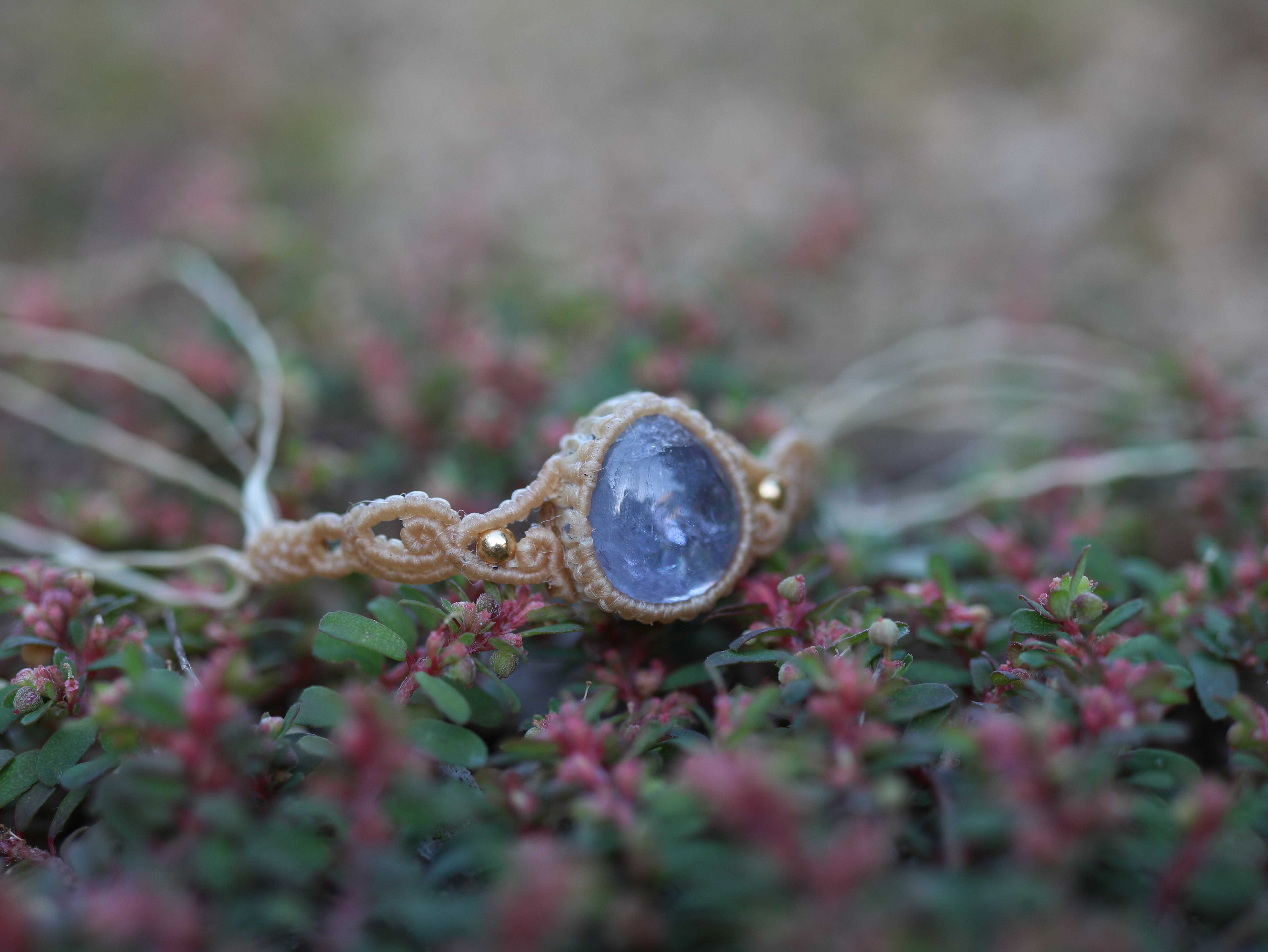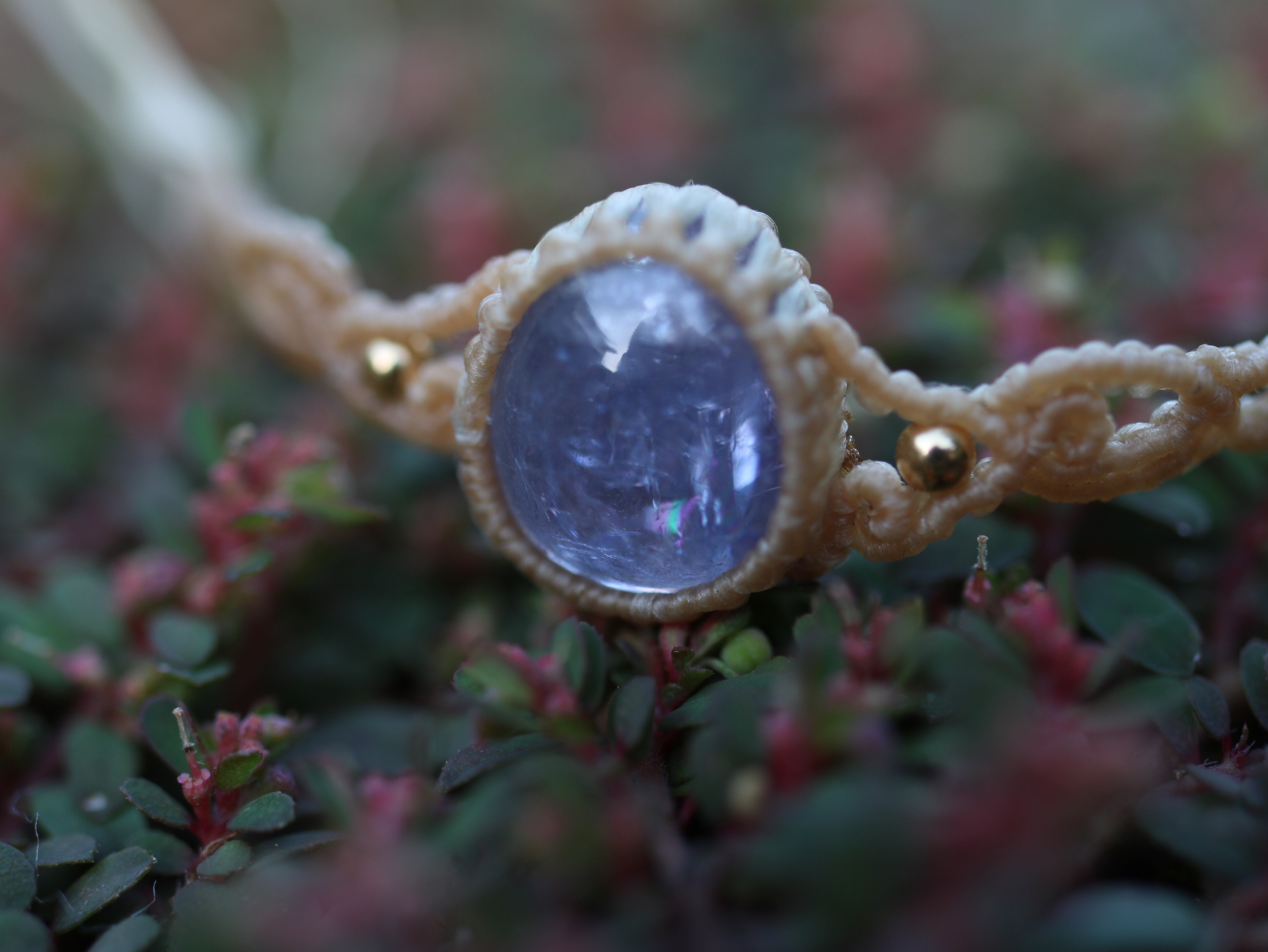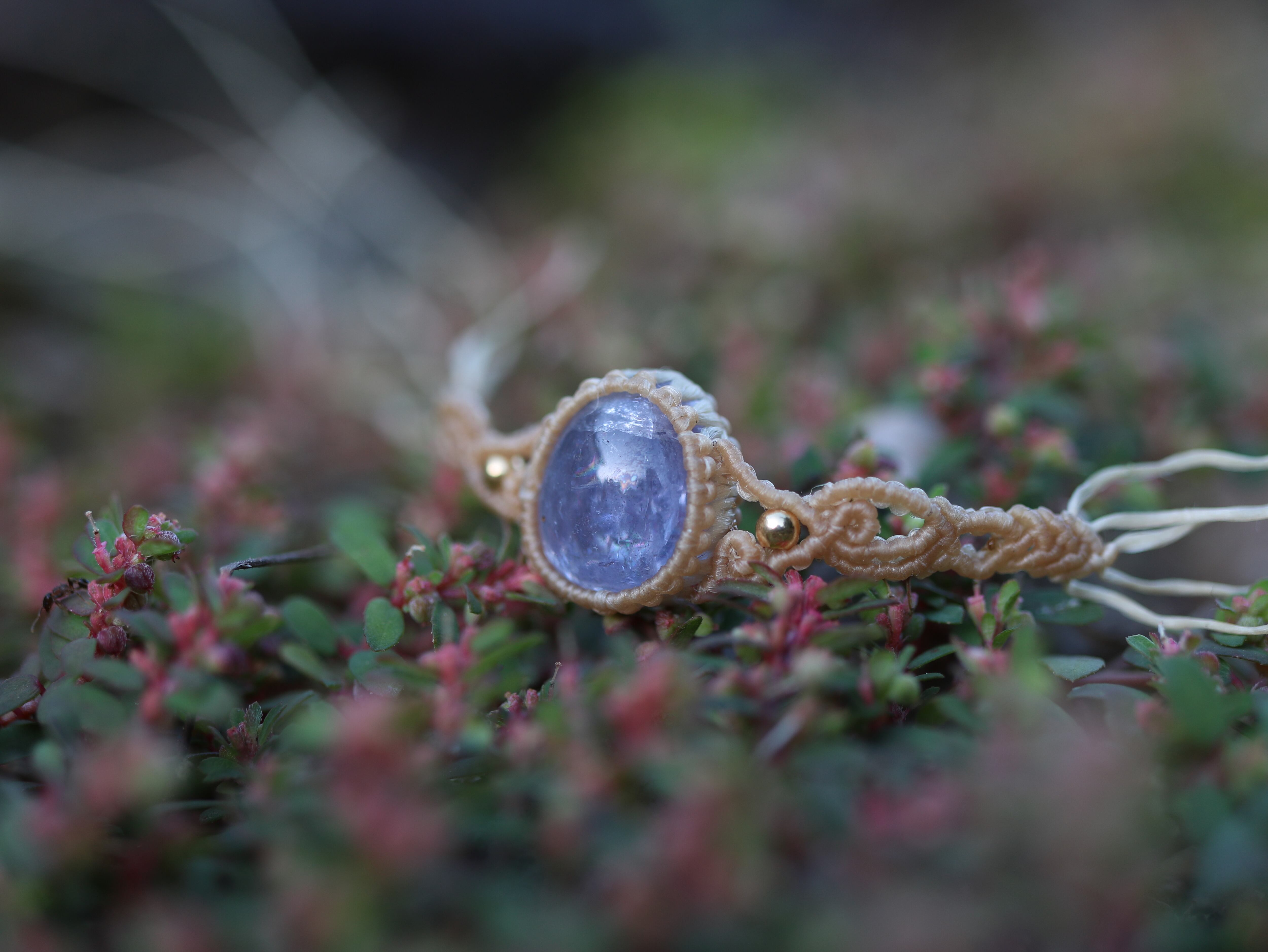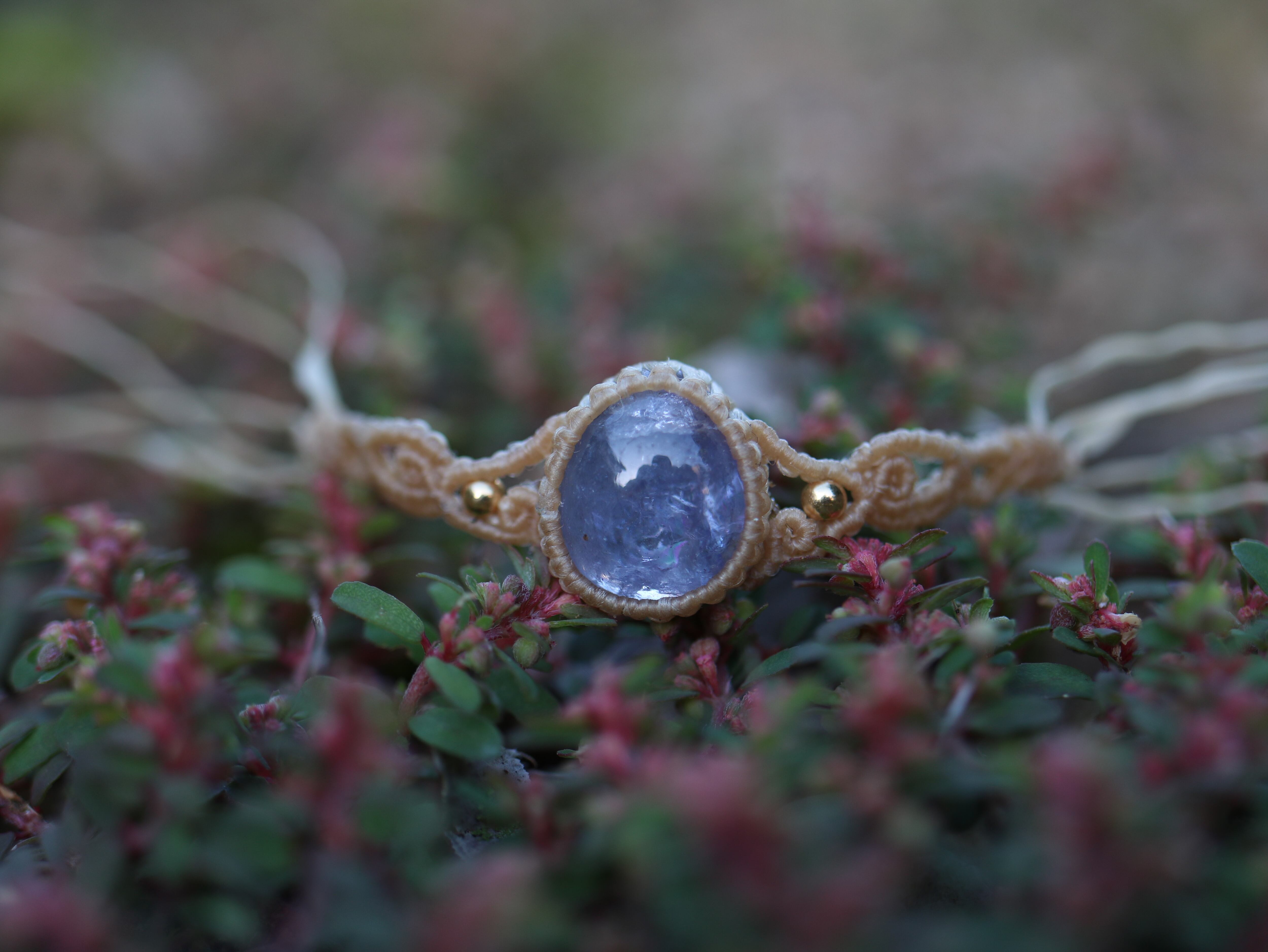 手縫い糸ほどの細いコードを使い、天然石の表情を引き立てるようひと目ひと目丁寧に編み上げています。