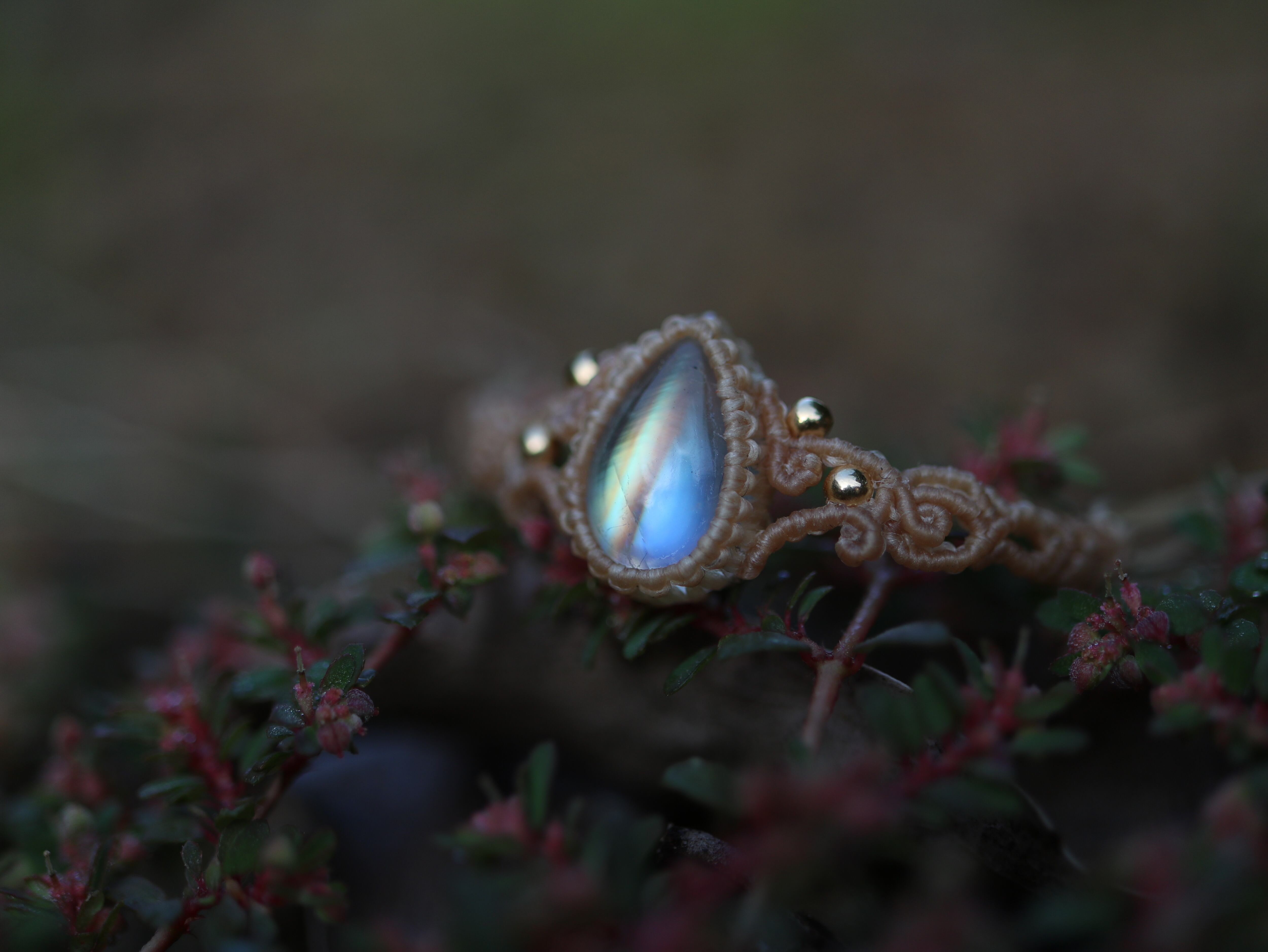 手縫い糸ほどの細いコードを使い、天然石の表情を引き立てるようひと目ひと目丁寧に編み上げています。