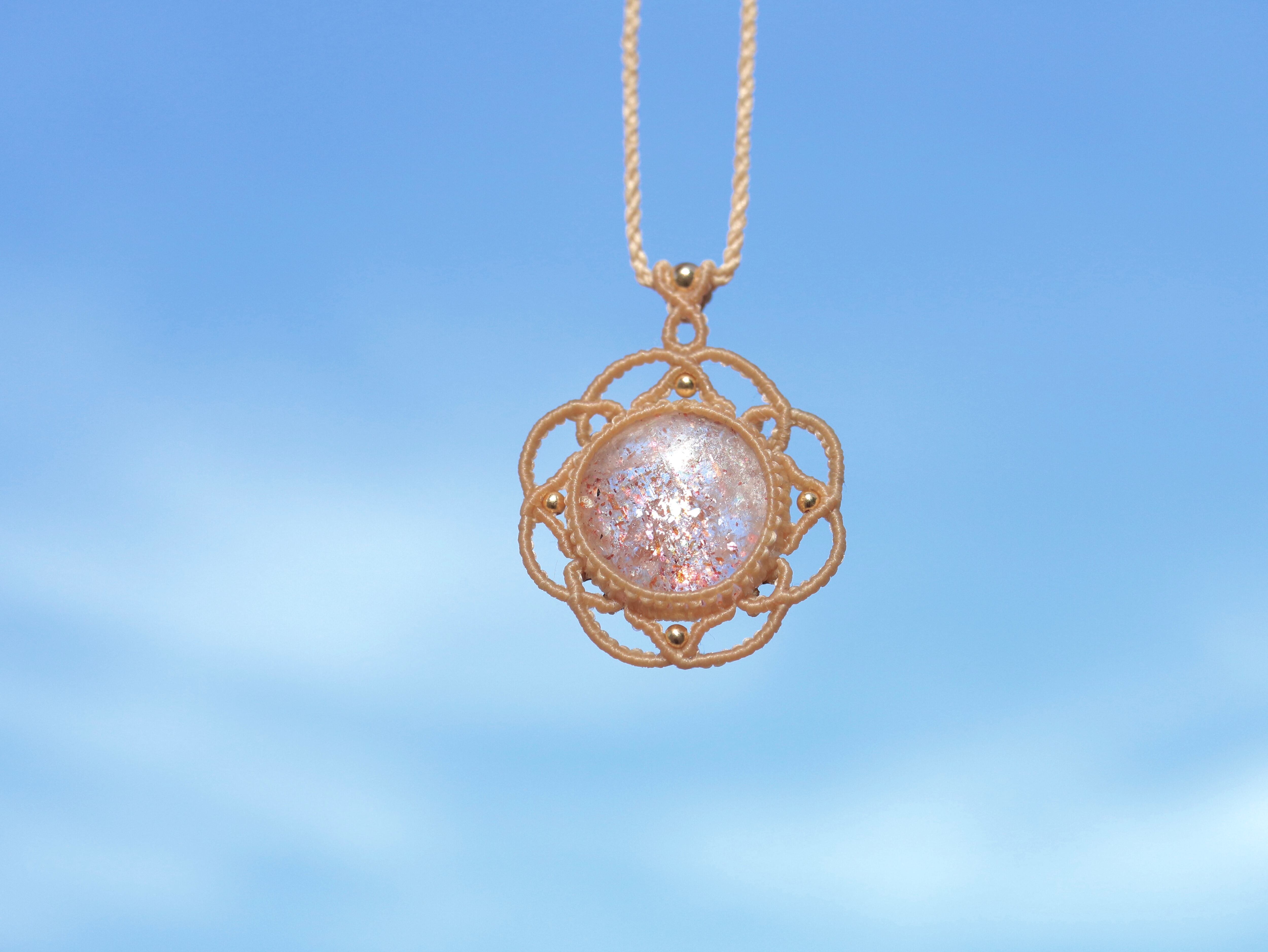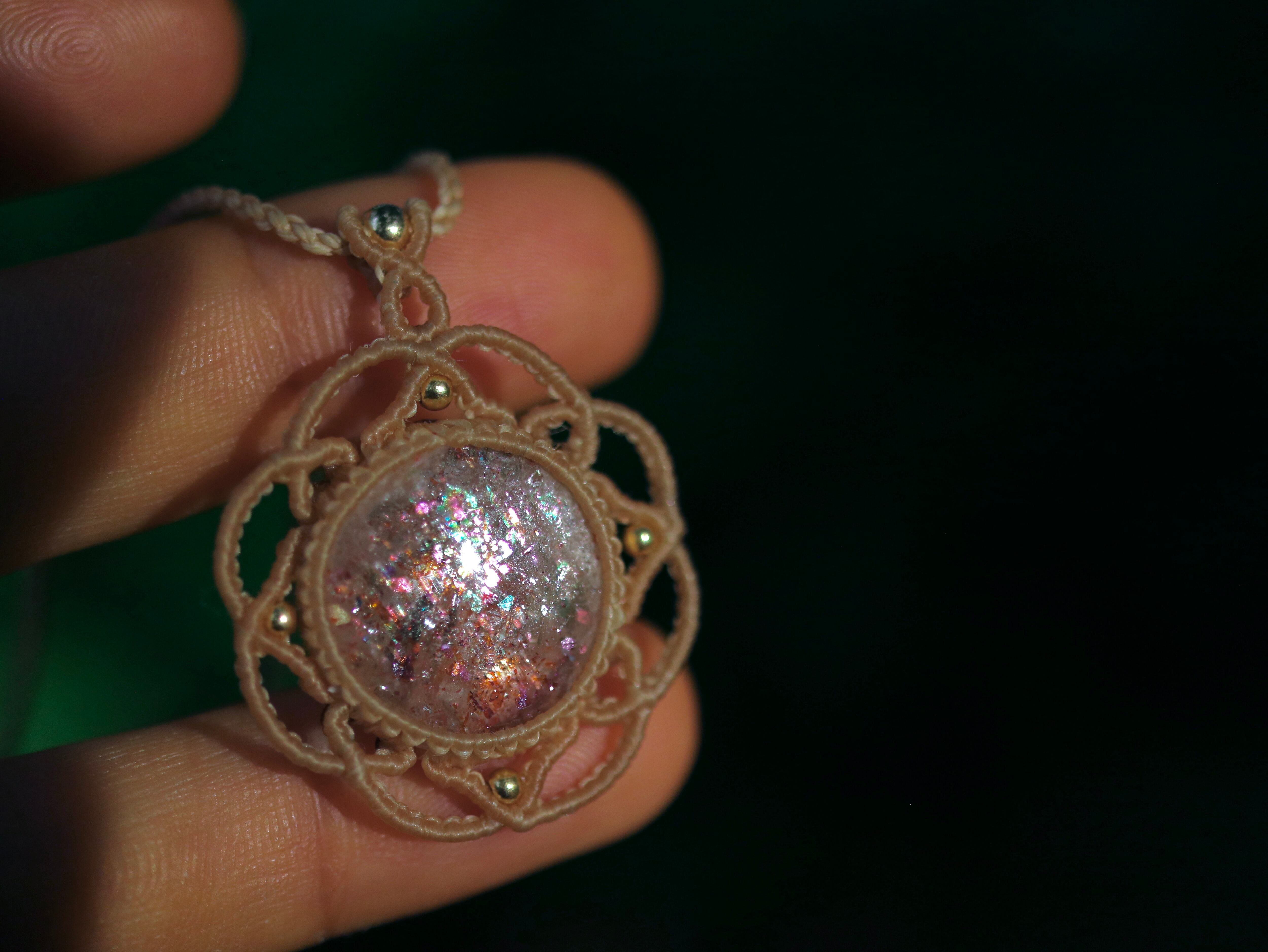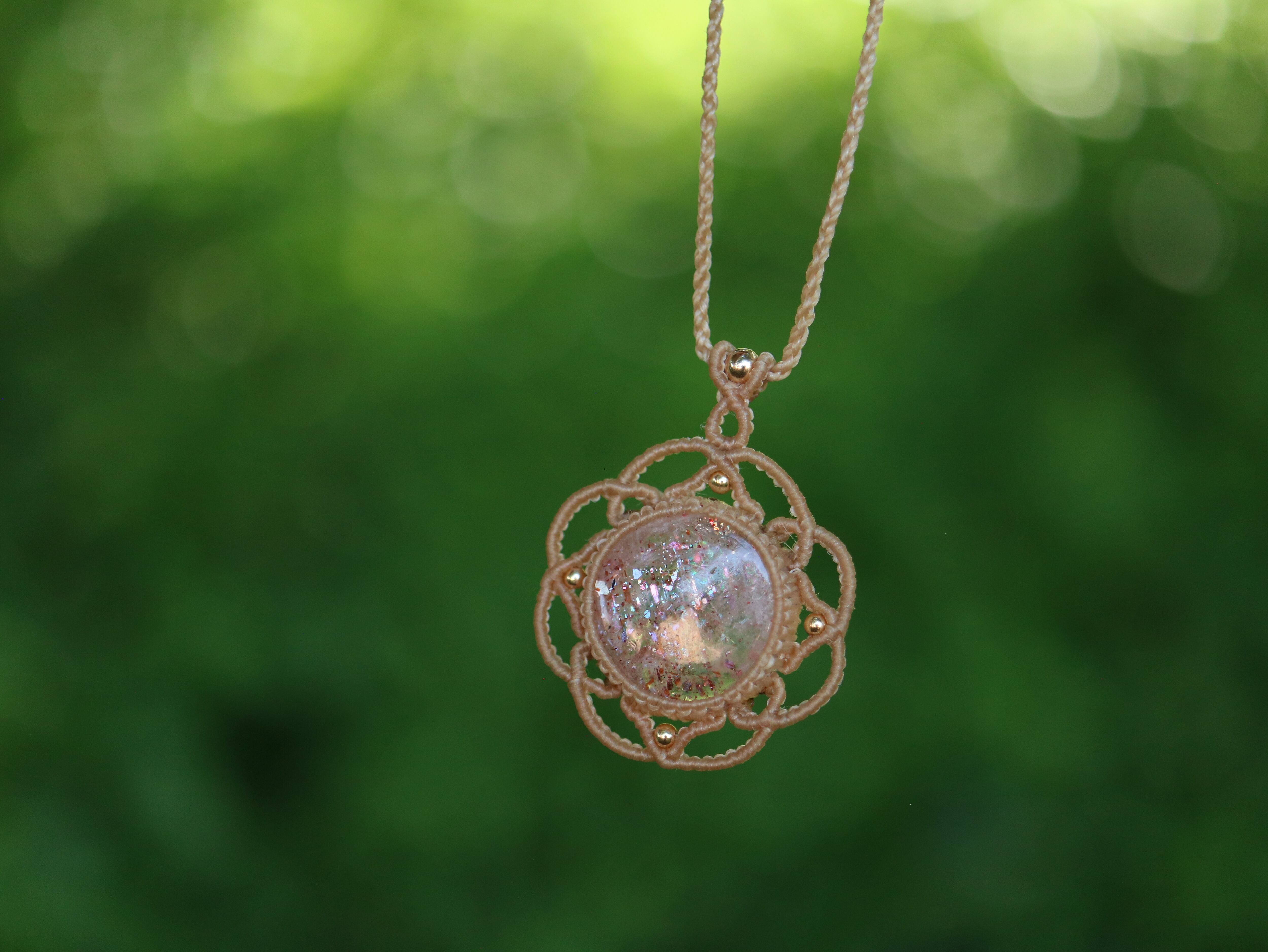 透明系の天然石に赤オレンジ、ピンク系のラメが色付いています