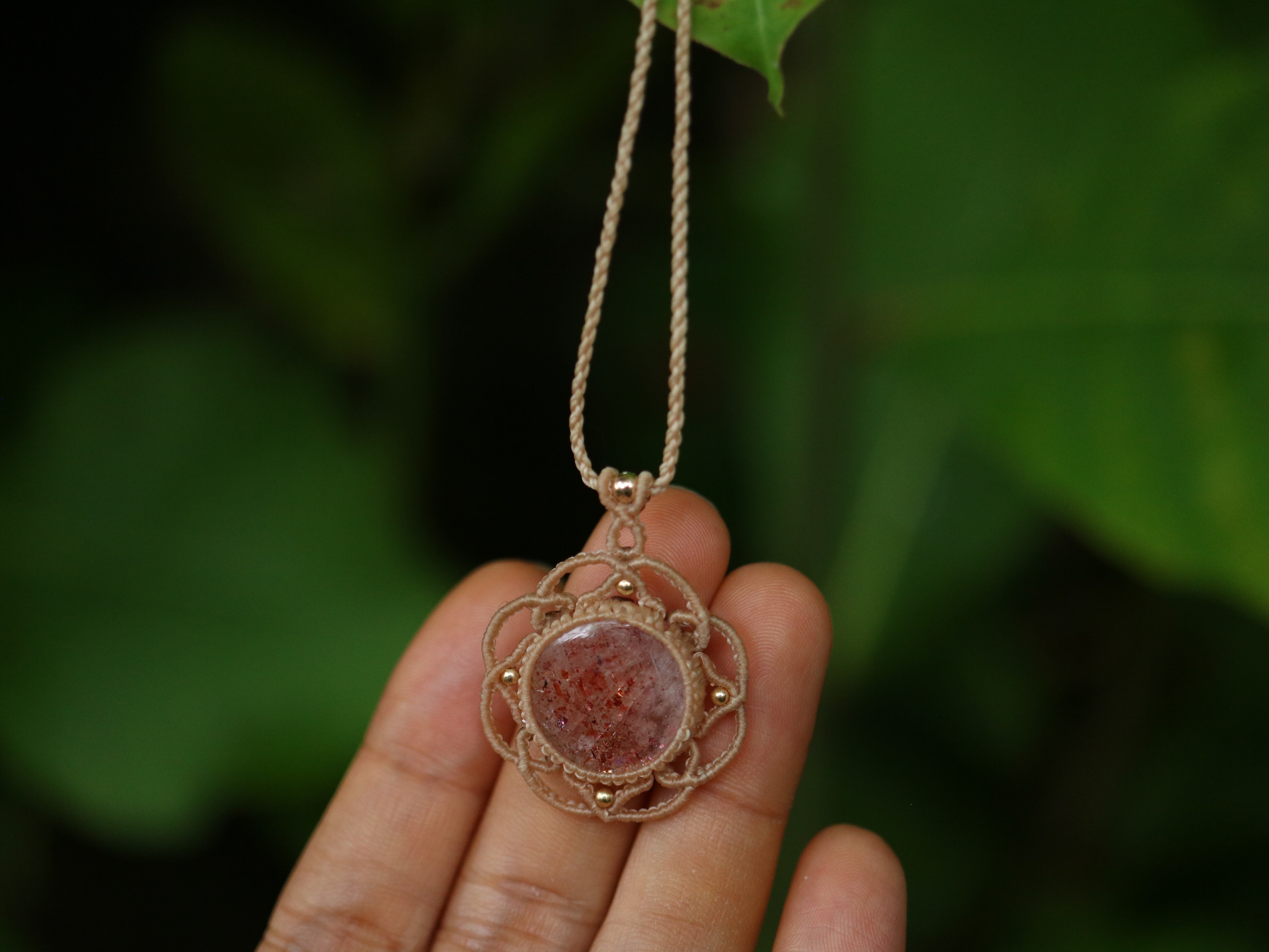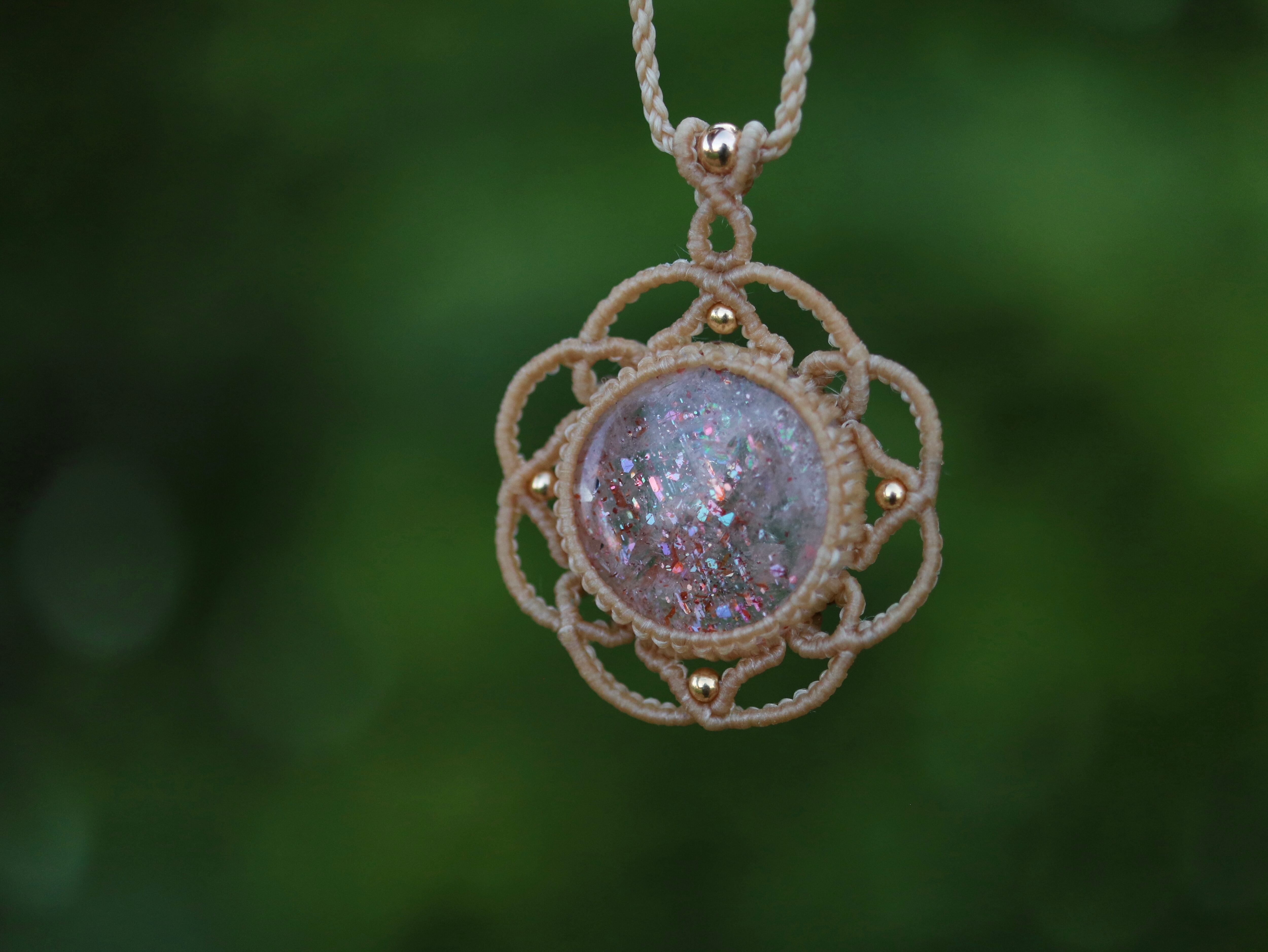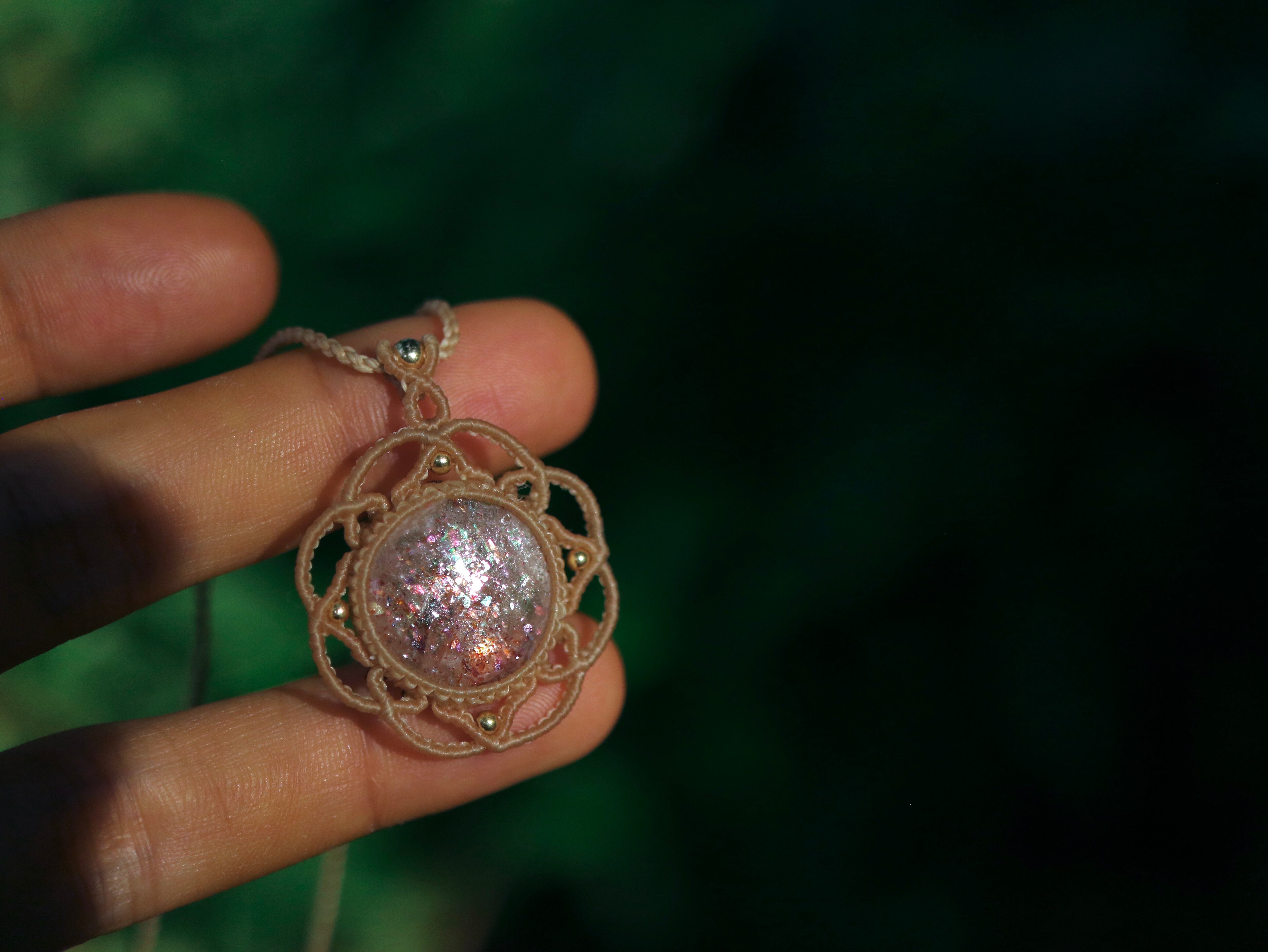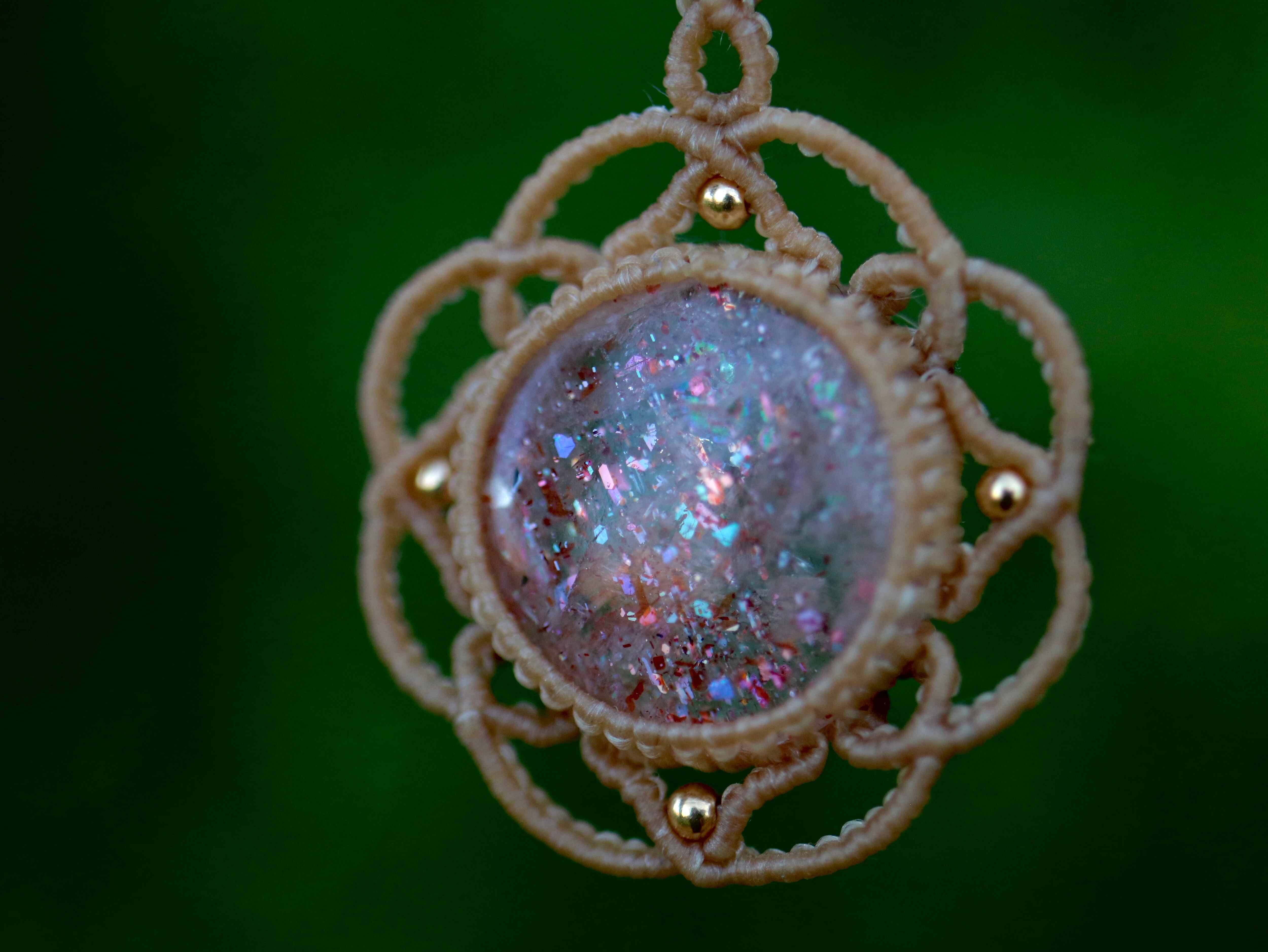 透明系の天然石に赤オレンジ、ピンク系のラメが色付いています