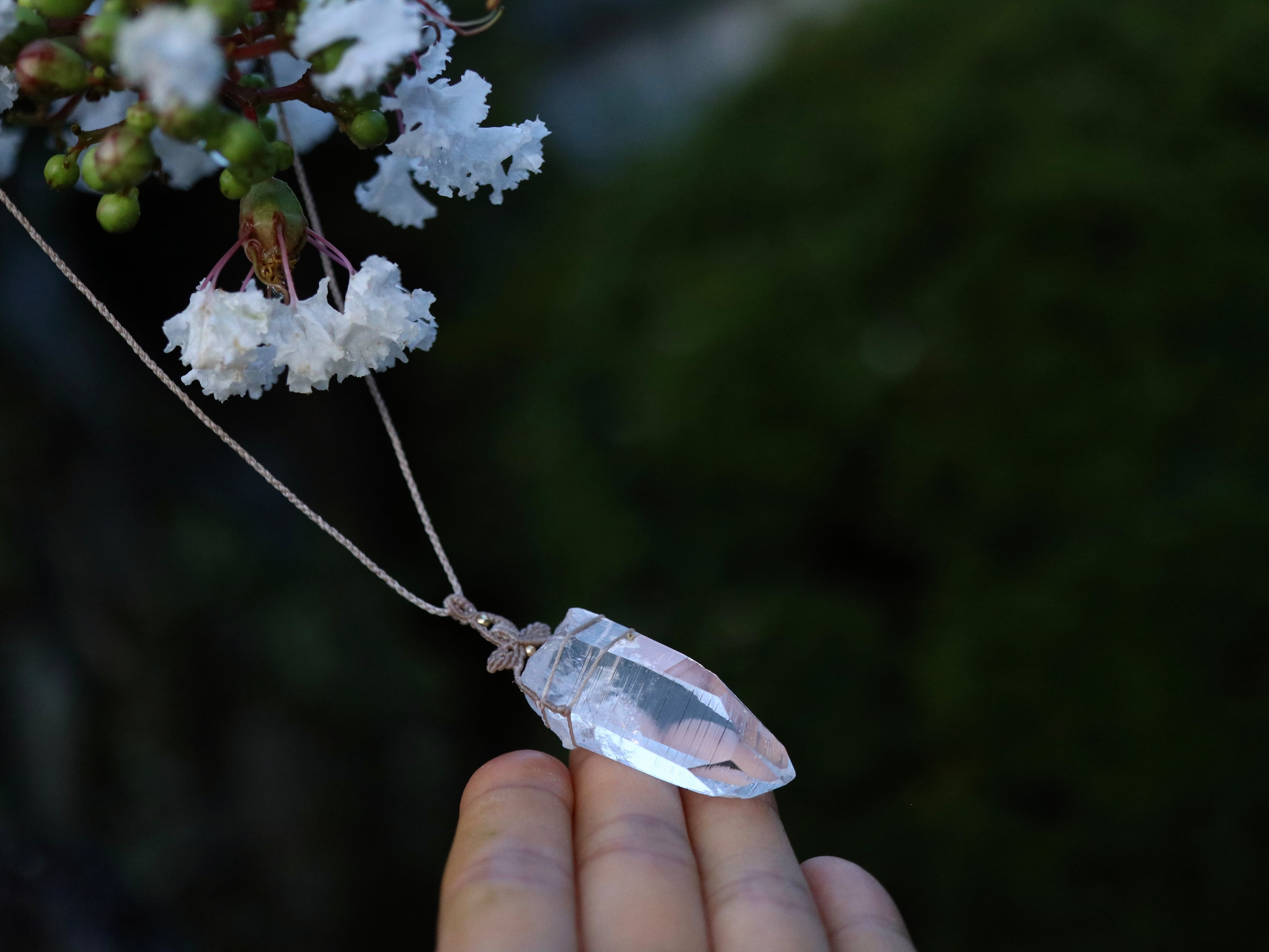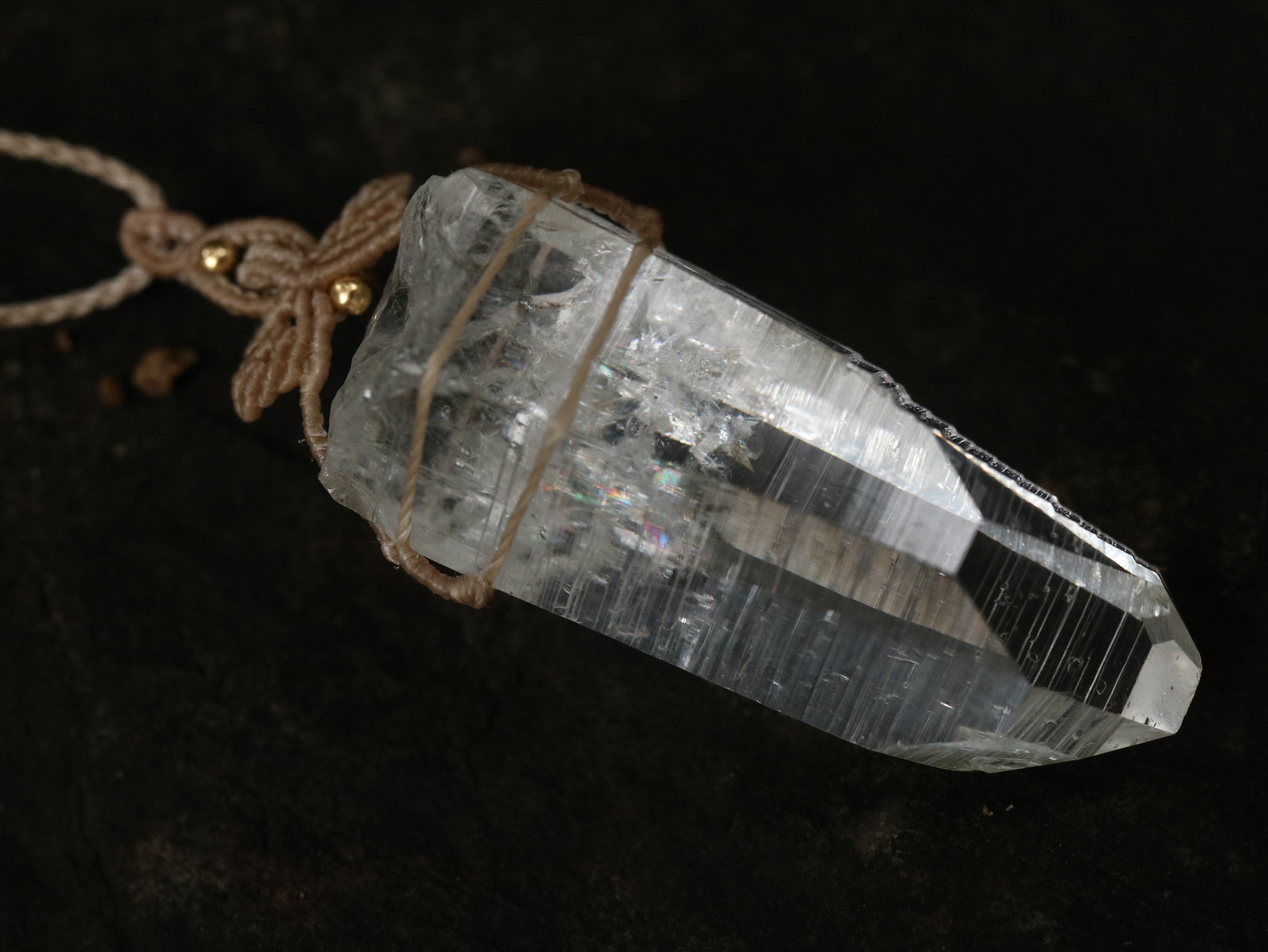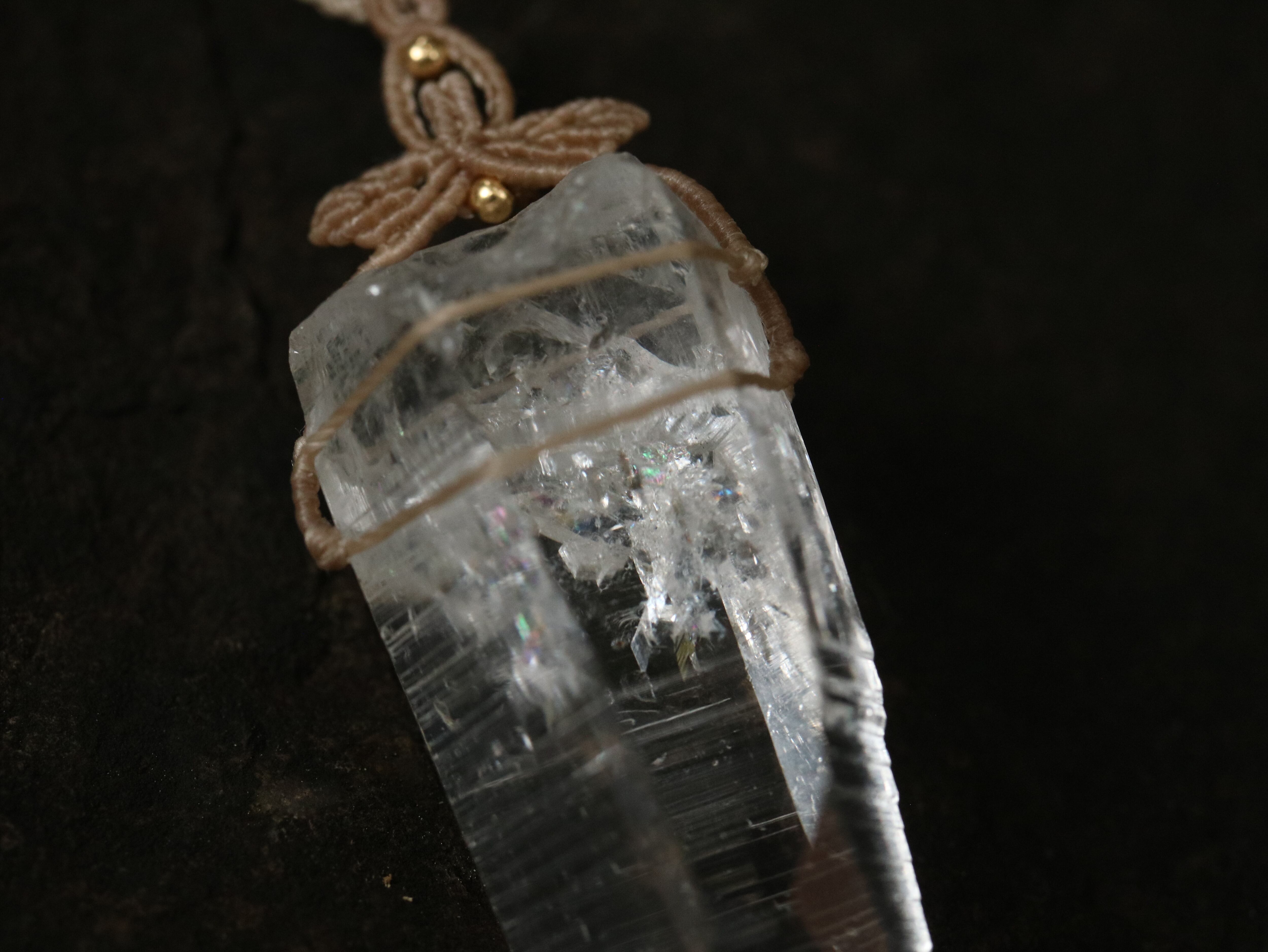 翼ようなマクラメ編みデザインをクリスタル上に添えてみました