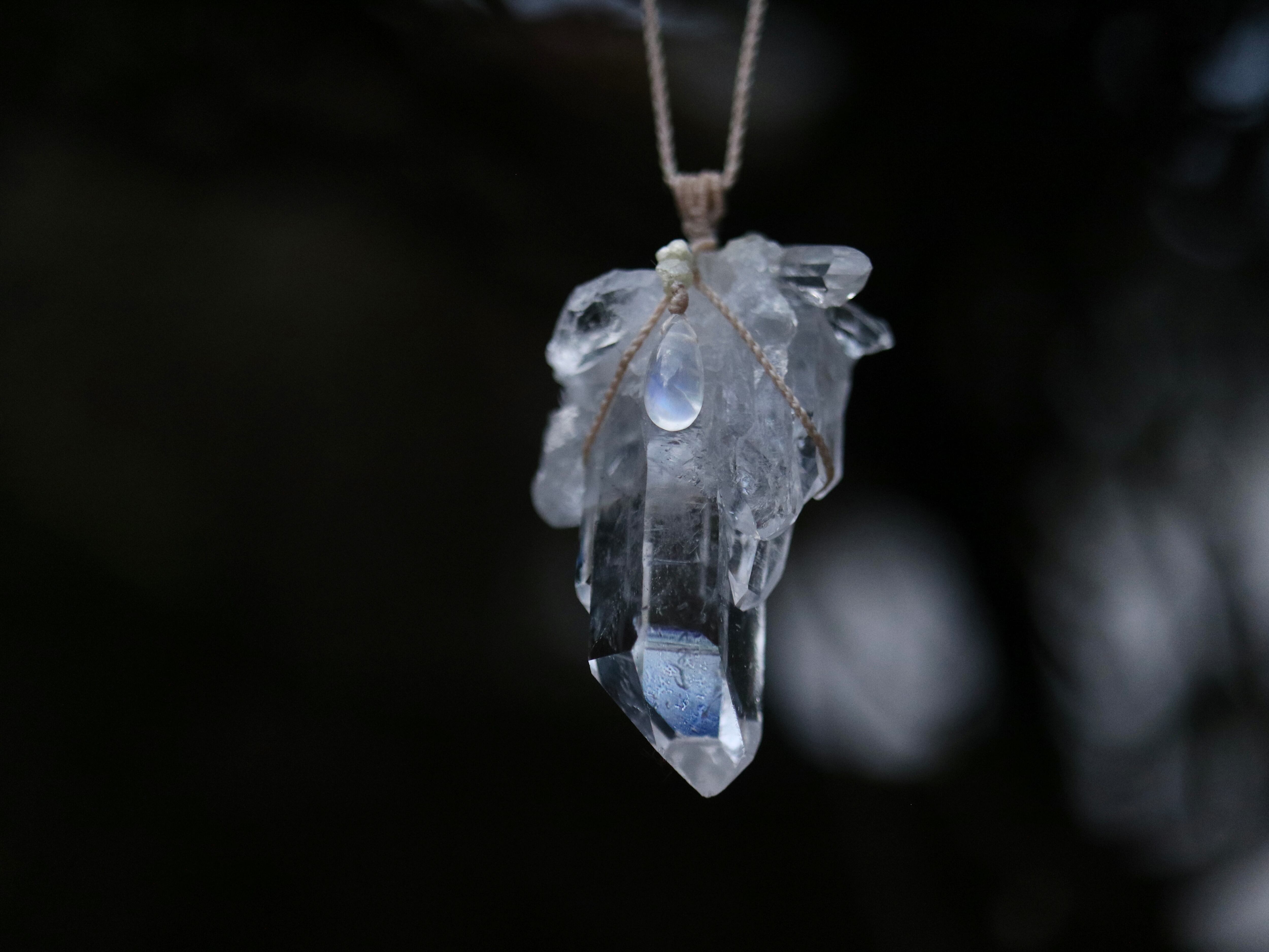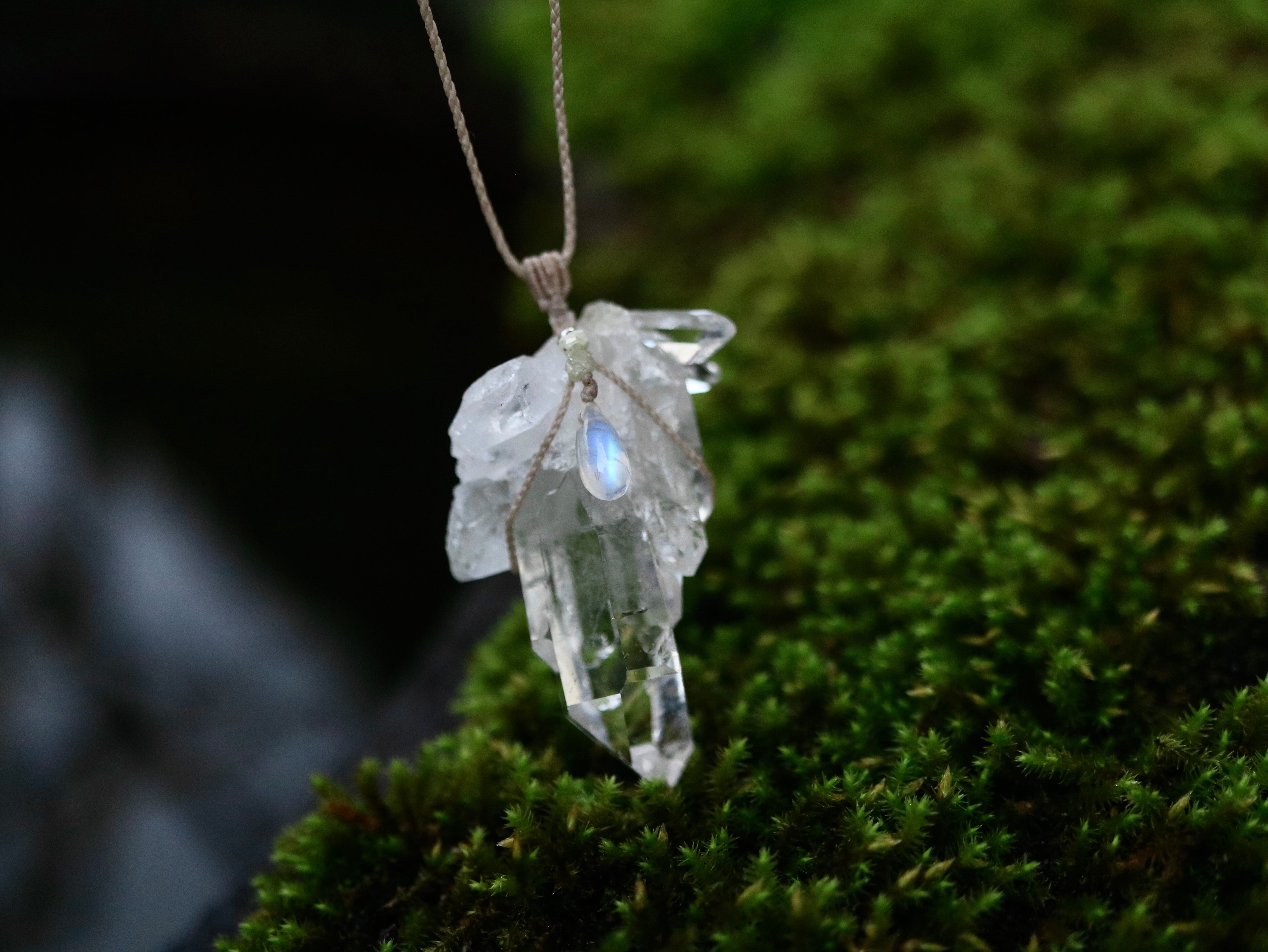 他2点のペンダントにあしらったムーンストーンに比べ白いシラーとして写っていますが、背後の色が水晶(白い)ためブルーが際立っておりませんが、こちらも他2点のように背後の色が黒いと同じく濃いブルーが際つムーンストーンとなります